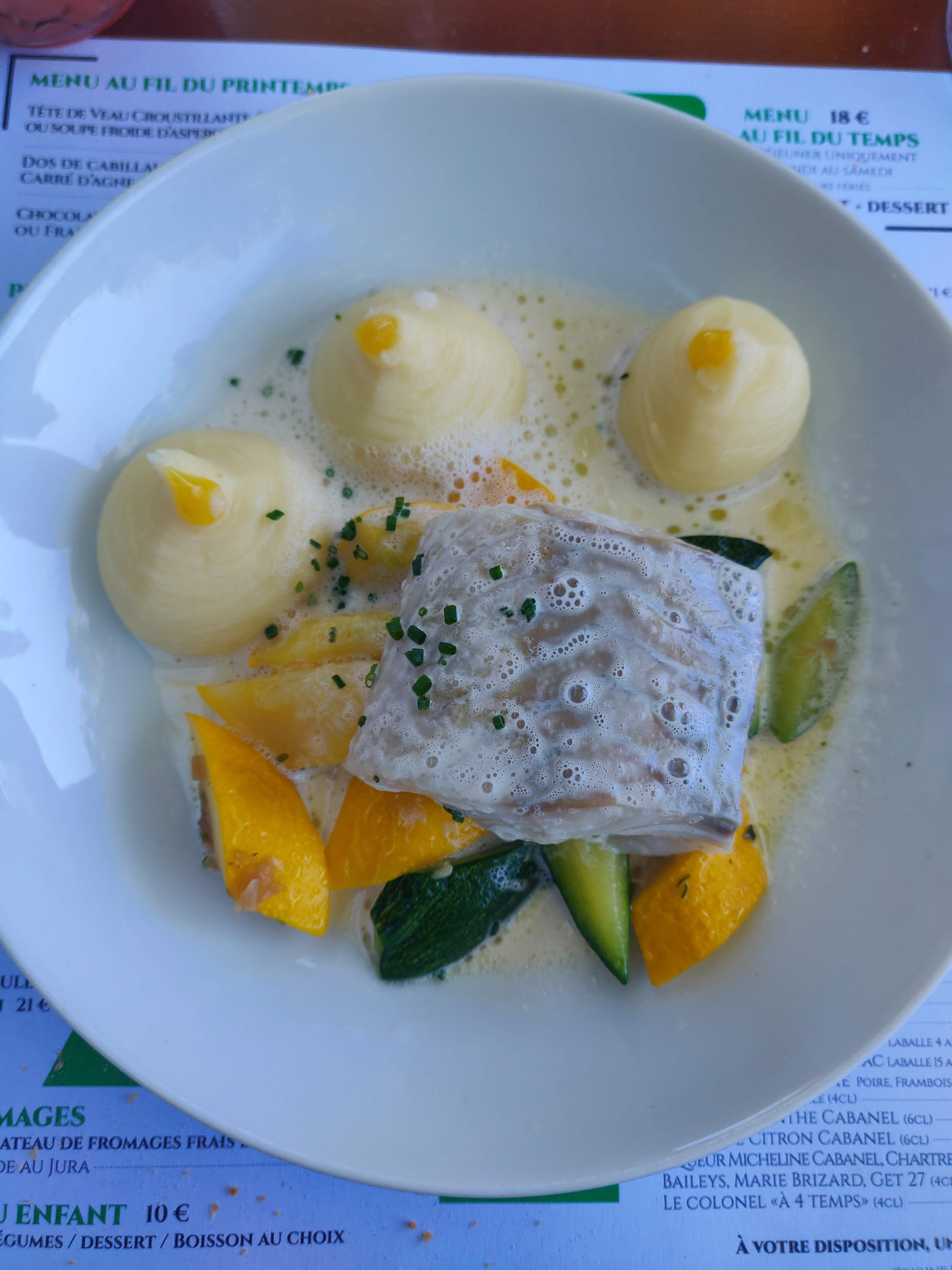 Deux verres de blanc fruité ( limoux) conseillé par le serveur ...Vin parfait Ma compagne a pris le plat rivière ombre chevalier cuit à la poêle avec des raviolis de champignons et pignons de pins et une sauce citron émulsionner Très belle assiette.....et le plat en lui même excellent . Quand à moi j' ai pris le plat mer Asperge rôties et un dos de merlu cuit a la perfection ( translucide ) déposé dans une fricassée d'asperge crémeuse Assaisonnement parfait, assiette très belle un plat bien étudié en tout point. En dessert j' ai pris une assiette de fraise découper en morceaux avec des petits dé de fenouil une crème par dessus et glace fenouil ...à confirmer ??....excellent dessert simple et abouti Ma compagne a pris un thé gourmand petite madeleine, cookis, meringue ,chocolat blanc et autre ....excellent aussi Une belle très belle découverte vraiment bravo l'équipe cuisine et salle et bravo franck Putelat pour cette belle carte des produits de l'Aude......