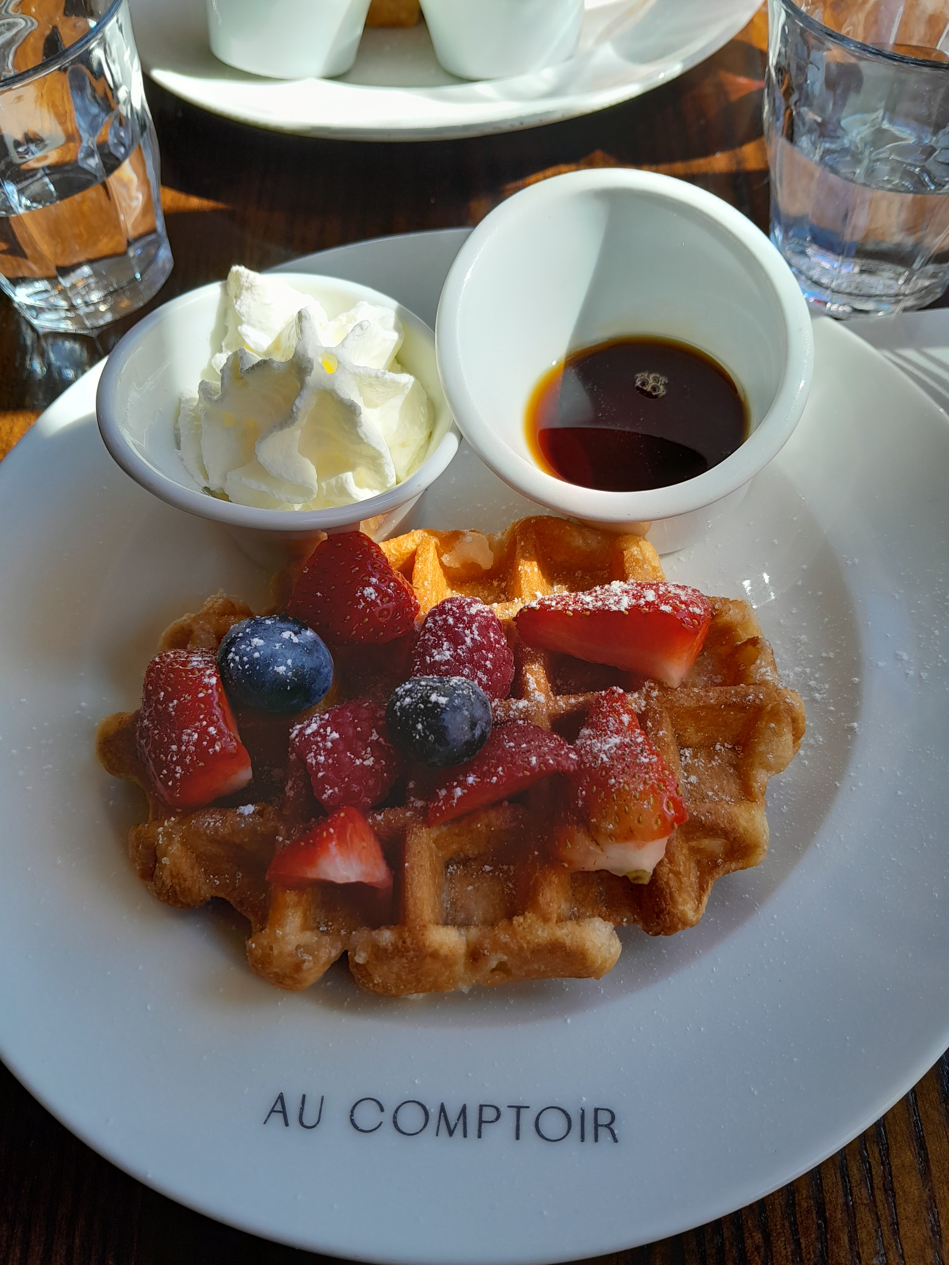 Très bonne cuisine, formule du midi variée. Produits frais et de qualité. Super équipe. Ici la gauffre chantilly et sirop d'érable (dessert du jour)