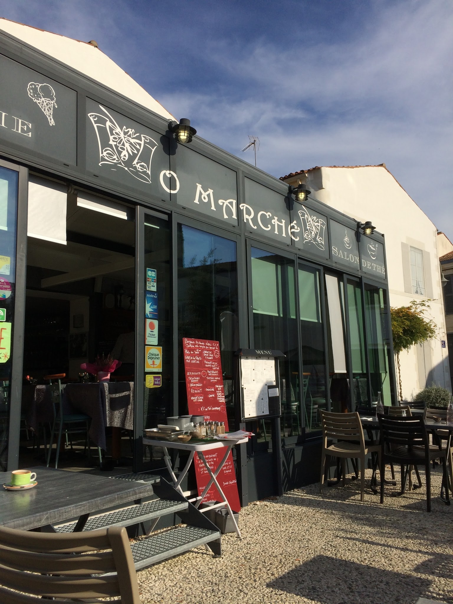 Après une matinée d'accrobranche direction tardive pour déjeuner à Marennes (14h30). Malgré l'horaire et après interrogation, la serveuse nous dit que l'on peut encore manger (certe une carte réduite mais très complète). Salade, tartine, plat du jour (colombo de poulet) et menu enfant seront nos choix. Verdict: les assiettes sont copieuses et les différents plats ont du goût. Mention spéciale a la poêlée de légumes servi avec le plat du jour et le menu enfant (car plus de frites a cette heure ci et cela est pas choquant). Côté service: le personnel est très agréable et professionnel. Pour résumé, un très bon moment à refaire.