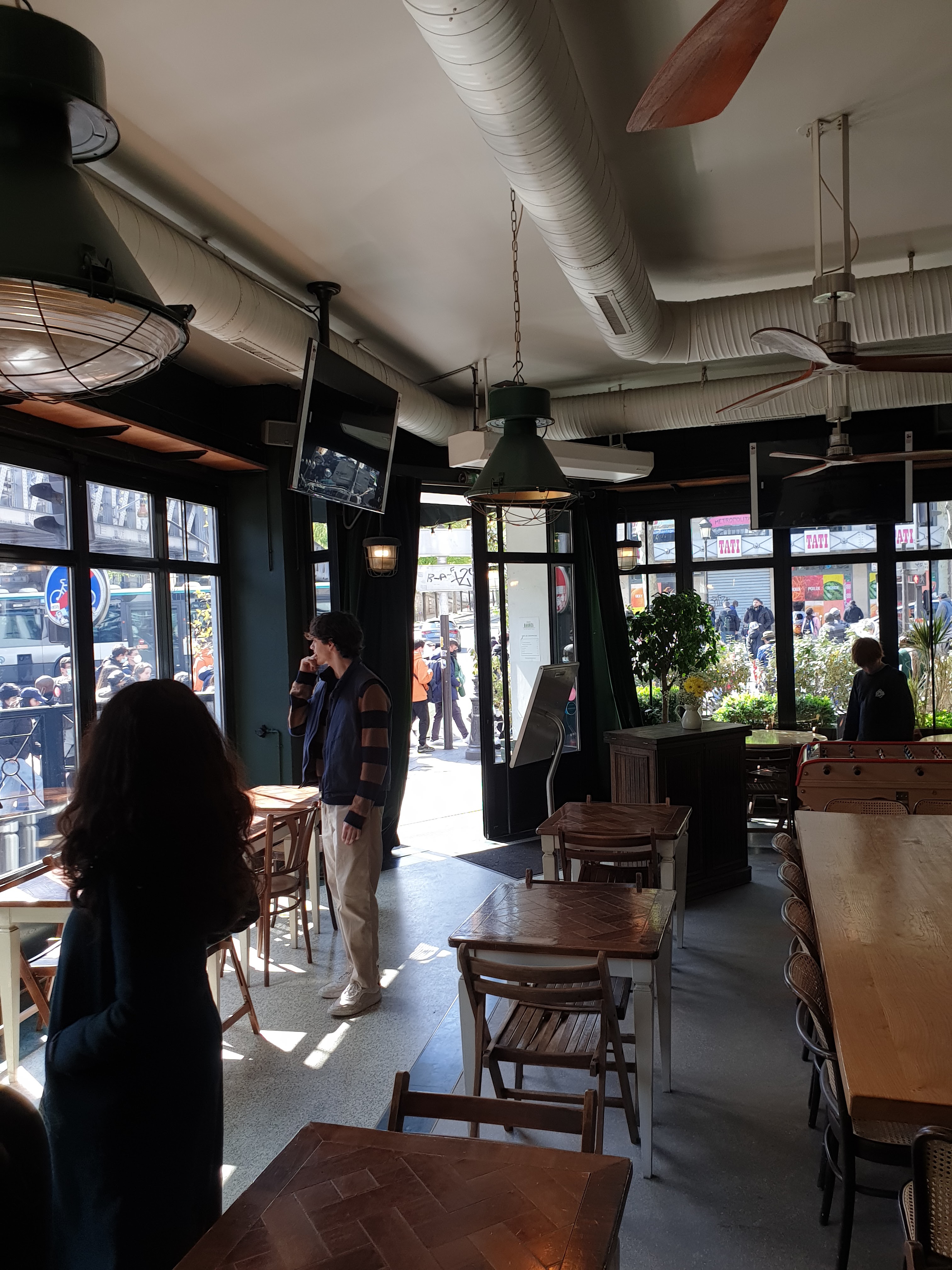 L'endroit est décevant, très différent des photos postées sur Instagram. Des dealers stationnent juste devant l'entrée du restaurant et du métro (personne ne le mentionne dans les avis Google, ce qui est surprenant). Notre table, située près de la fenêtre, donnait sur cette scène, ce qui n'est pas très agréable. Bien que le restaurant ne soit pas responsable de l'ambiance du quartier, cela a affecté notre expérience. Le premier étage est charmant et moins austère que le rez-de-chaussée. Cependant, l'accueil n'était pas chaleureux et le serveur était peu sympathique. Les frites étaient trop salées et la sauce échalote ressemblait à une purée de légumes. En somme, je pense qu'il ne faut pas s'attendre à bien manger en venant ici ; je le conseillerais plutôt pour venir prendre un verre entre ami(e)s.