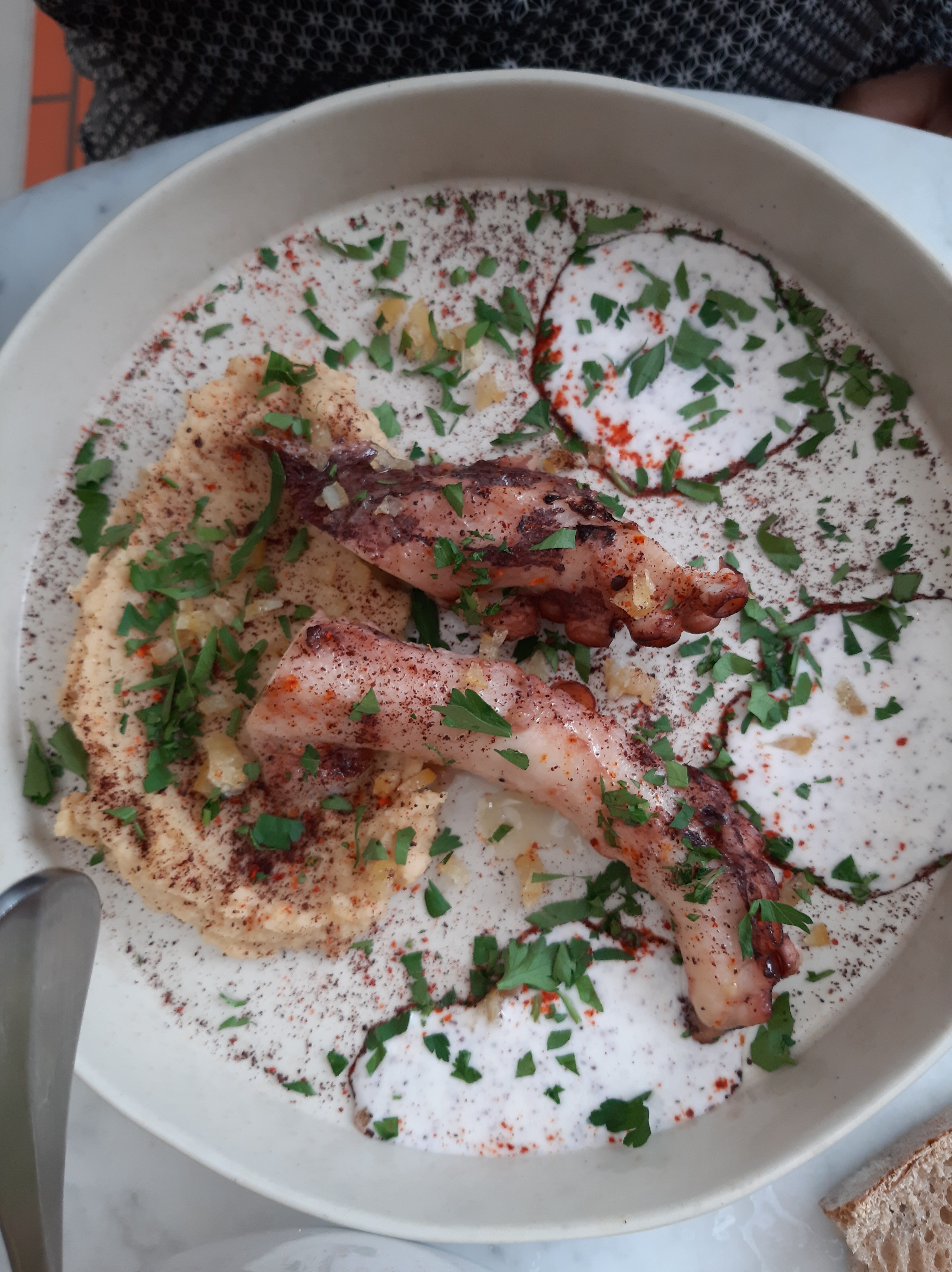 Menu du chef en 3 temps excellent. Poulpe et Poisson parfaitement cuits et accompagnements délicieux. Repus en fin de repas. Serveuse agréable et disponible pour toutes questions. 2 salles, 2 ambiances , super deco. Belle découverte bayonnaise. Nous reviendrons