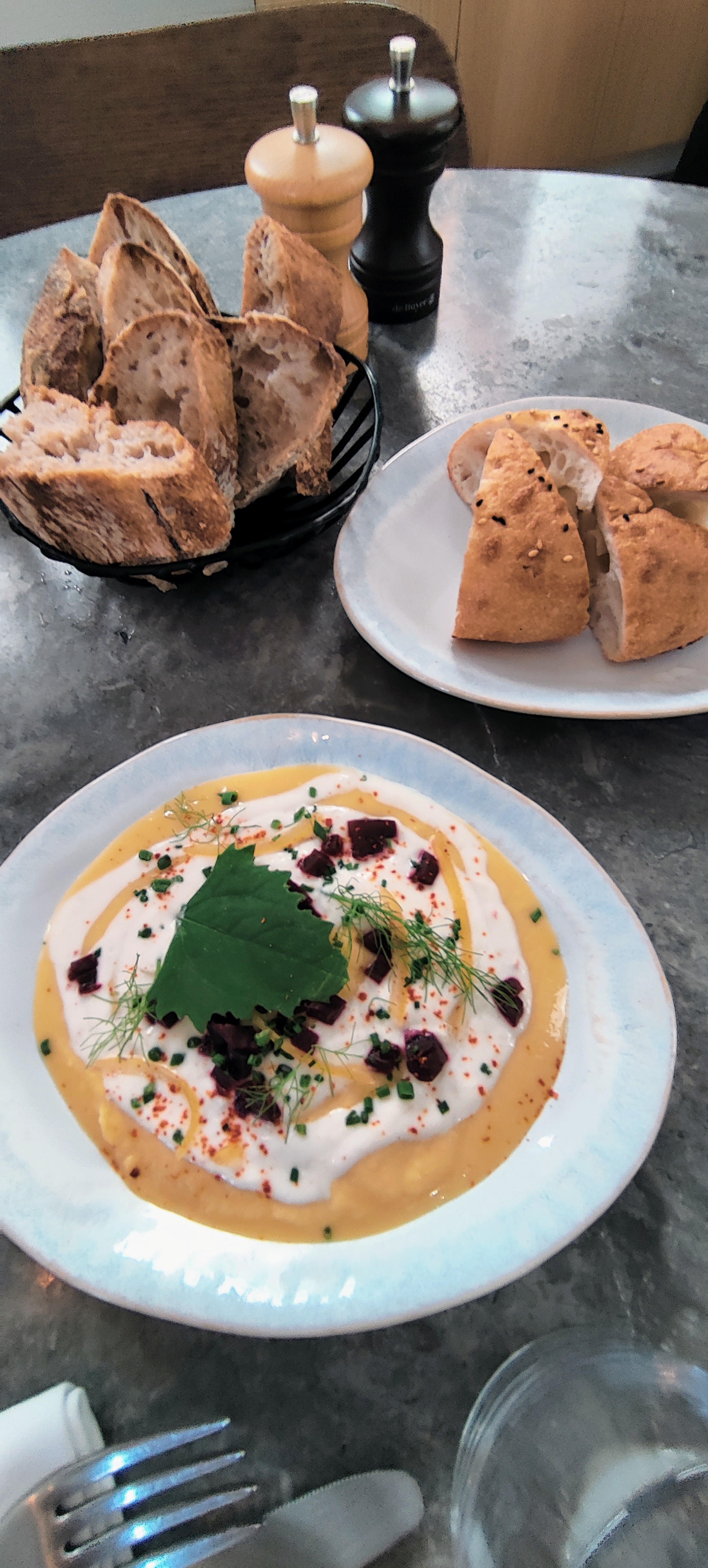 Nous avons adoré le cadre vraiment très beau et lumineux ainsi que le service chaleureux. Concernant le repas, nous étions venus pour le menu déjeuner mais à notre arrivée, le menu proposé ne correspondait pas à celui affiché en ligne. C'était correct mais si ce menu avait été affiché en ligne, nous ne serions probablement pas venu car il ne correspondait pas à nos envies du moment et préférences alimentaires. Nous avons regretté notamment un tartare de veau déjà constitué de viande hâchée puis une pita d'agneau composée encore de viande hâchée. Au final, c'était assez répétitif et lourd alors que nous nous attendions à du poisson au plat principal. Nous redonnerons probablement une chance ultérieurement car le cadre est vraiment agréable
