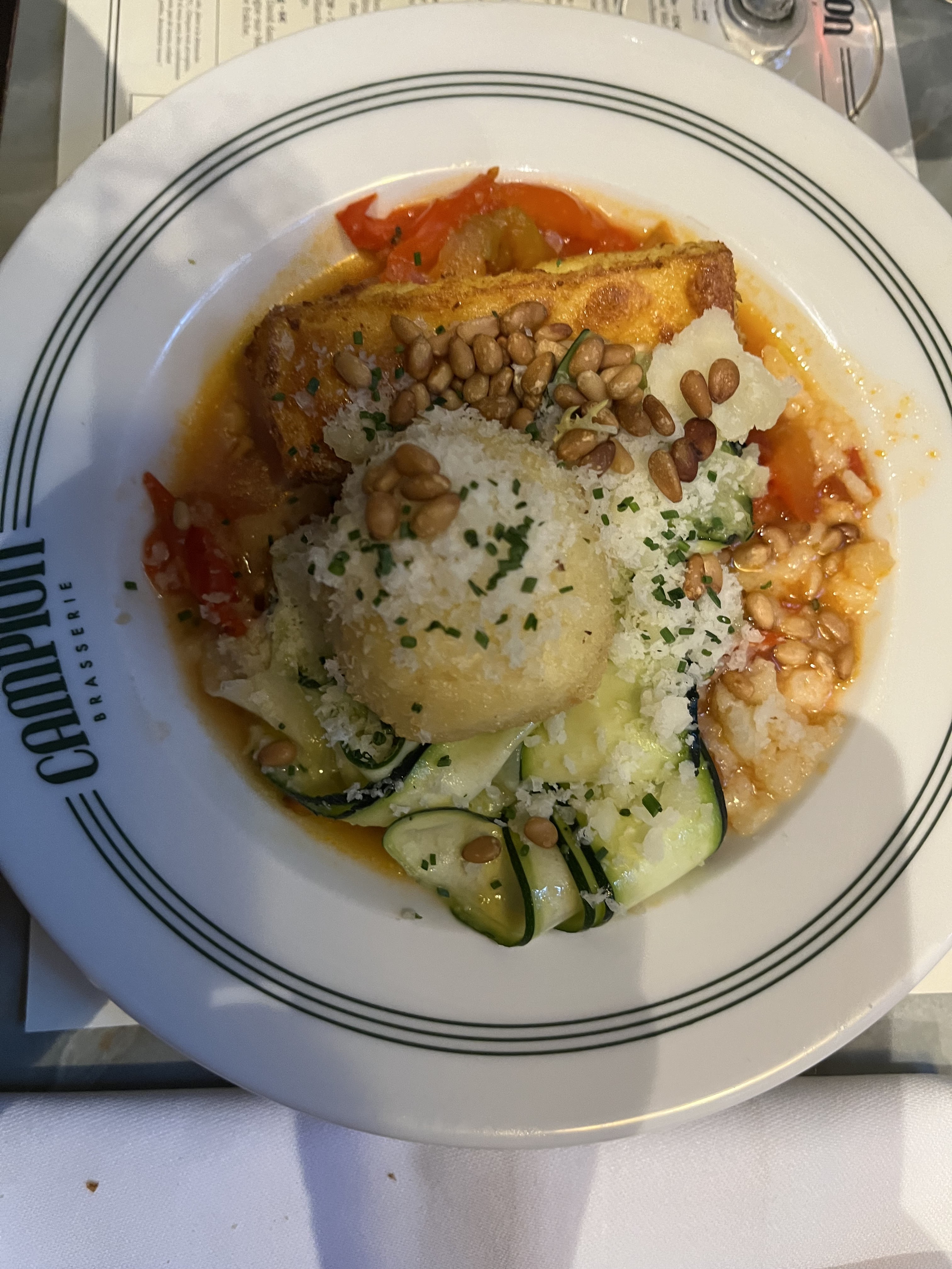 La Brasserie Campion est un lieu très agréable où il fait bon dîner. En entrée asperges, légèrement filandreuses mais bien cuisinées . Ensuite, Bravo et Merci au chef d’avoir imaginé ce merveilleux plat végétarien. Œuf poché et pané , excellent, avec une compotée de tomates concassées et des courgettes en fines lamelles, pignons grillés , épices parfumées. Délicieux. Et une excellente assiette de fromages bien affinés. Vin du jour au verre correct . On gagnerait à proposer un excellent vin au verre pour celles qui comme moi en boivent très peu mais du très bon uniquement! Un excellent moment. Serveurs très accueillants, à l’écoute et de bon conseil. Merci à toute l’équipe. La cliente venue… de Corse!