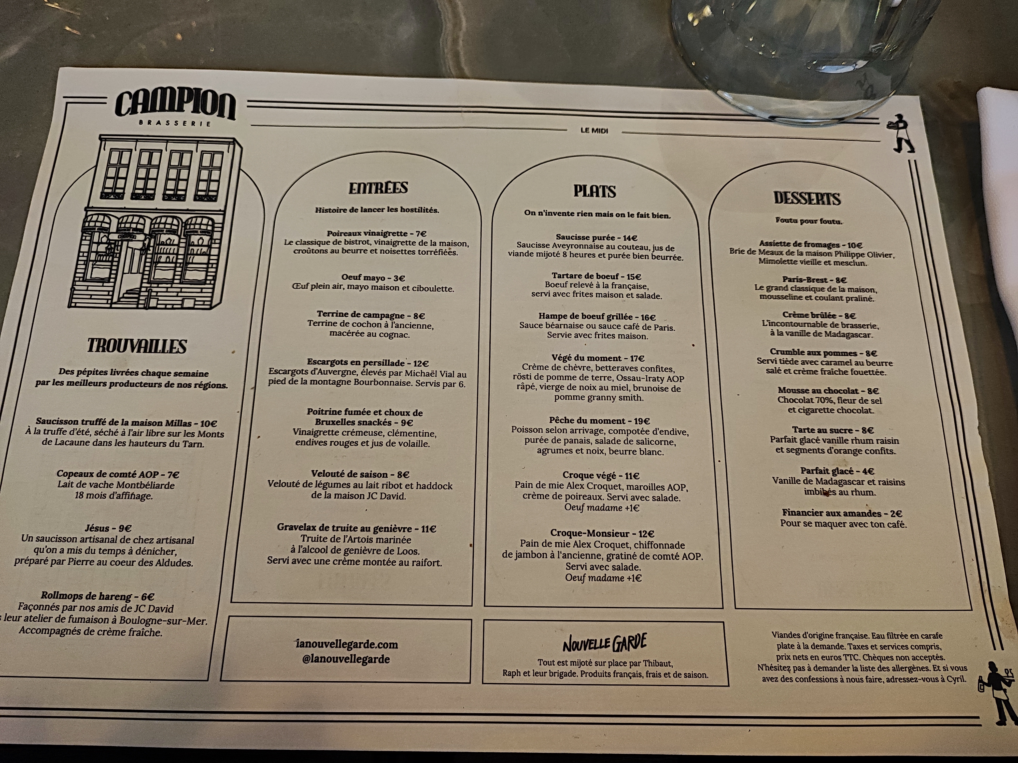 Adeptes des restaurants à Paris, nous sommes ravis de pouvoir enfin découvrir la Brasserie Campion à Lille. Le cadre est très sympa et nous nous sommes régalés de l’entrée au dessert. L’équipe des serveurs est super, surtout Thomas qui nous a servi avec gentillesse et professionnalisme. Nous reviendrons !