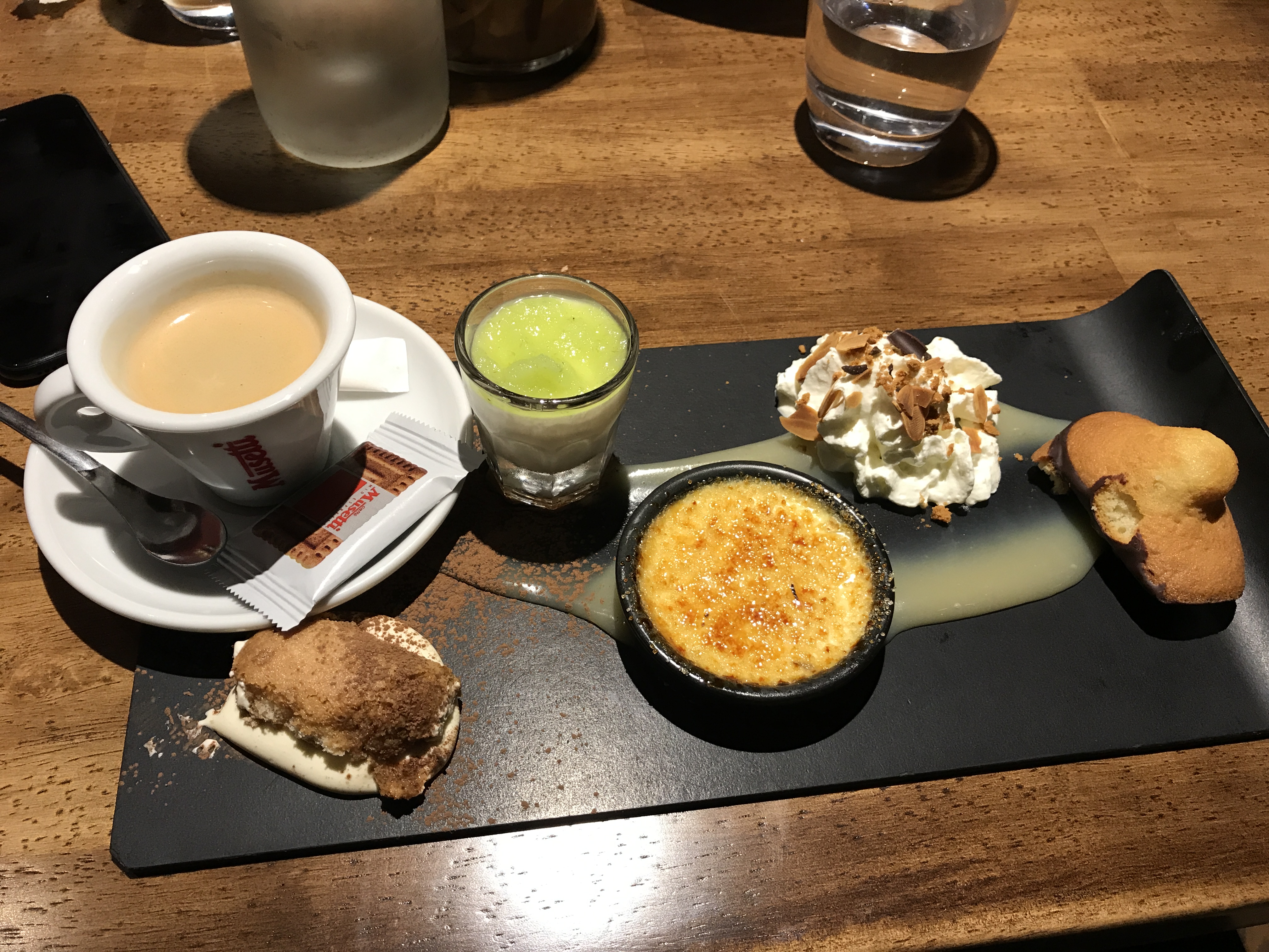 Plat de résistance bon et assez copieux. En dessert un café gourmand, là ça se gate : cher et sans intérêt. Ambiance assez bruyante. En résumé, c'est tout de même plutôt cher pour ce que c'est...