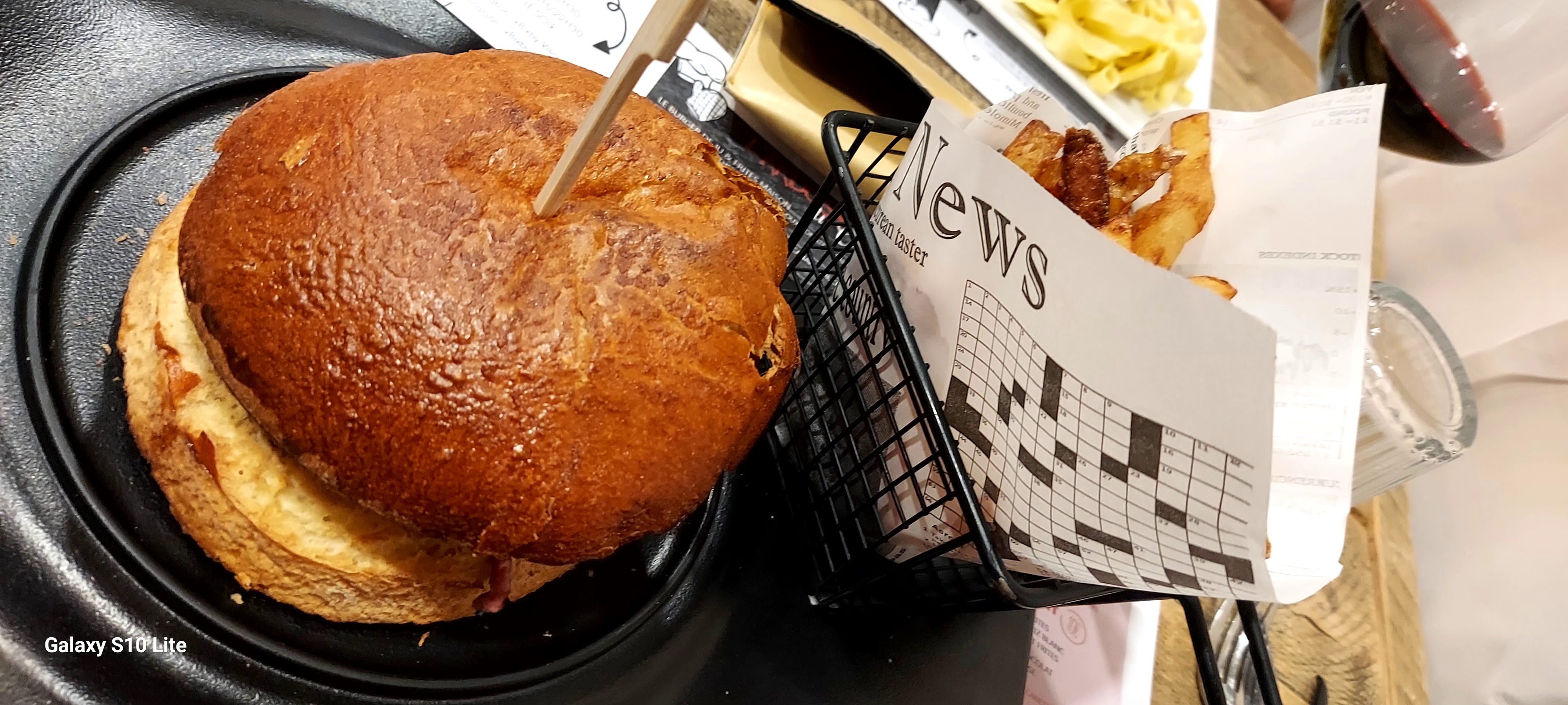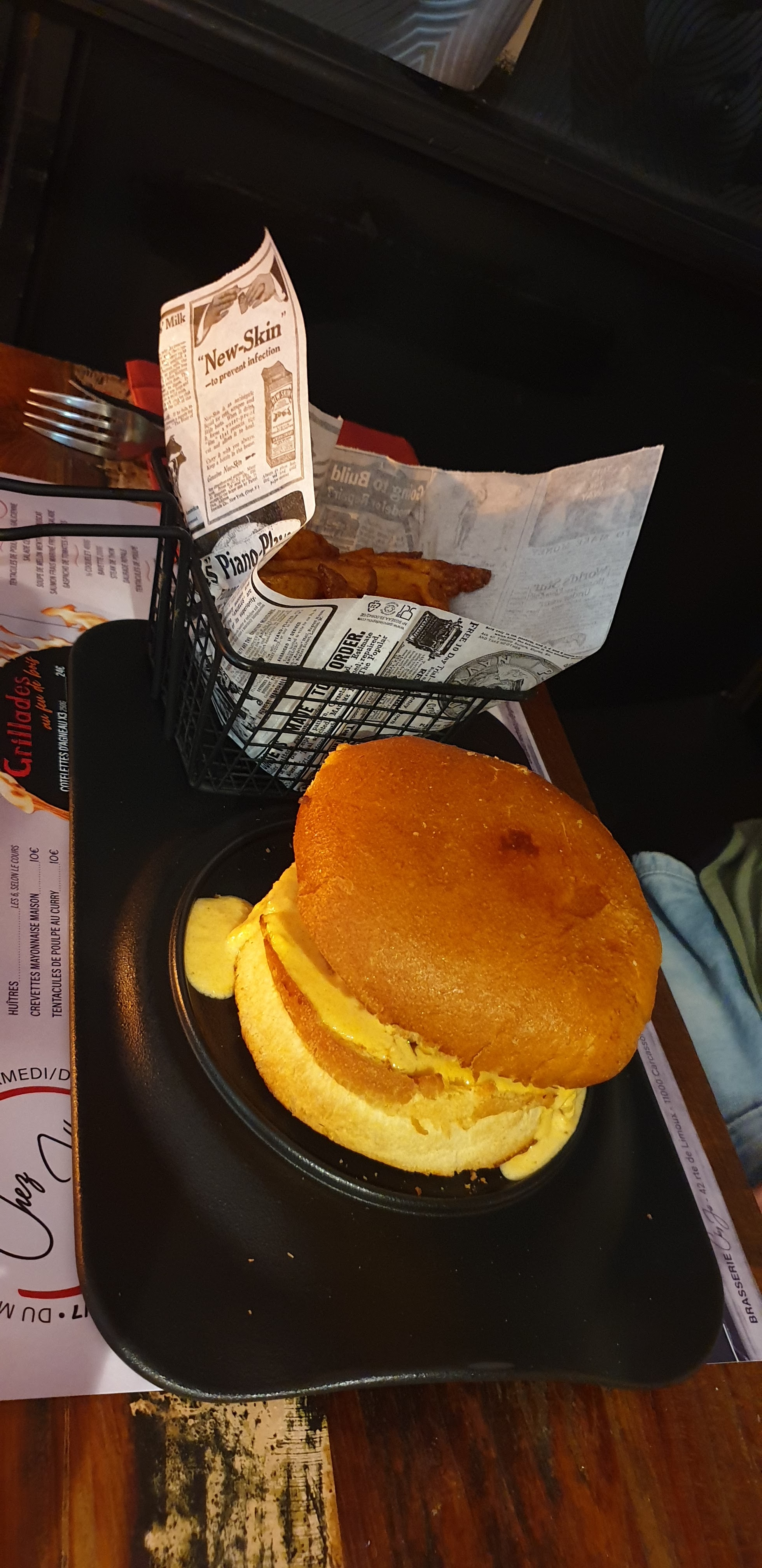 Hamburger une très bonne viande avec du goût, frites un peu grasses et pas assez cuites. Le dessert de jour avec son cœur coulant non coulant je n'ai pas vraiment aimé 😔. Mon ami a tout aimé lui c'est régalé. (Un peu bruyant)