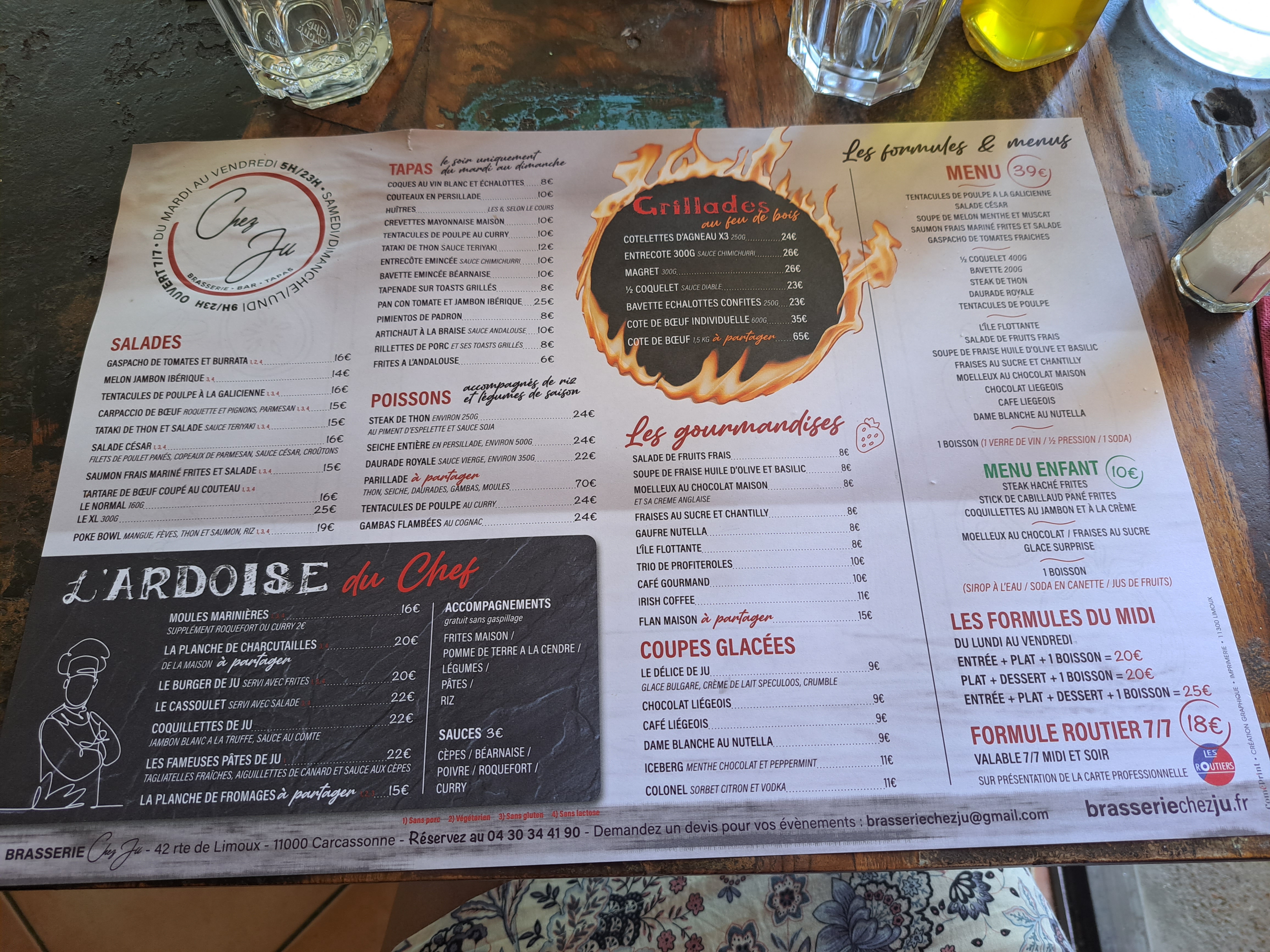 Nous nous sommes régalés à la Brasserie Chez Ju. Nous avons mis du temps à choisir tellement qu'il y avait du choix ! Les assiettes étaient copieuses. Nous reviendrons goûter les plats que nous avions pas pu choisir 😁