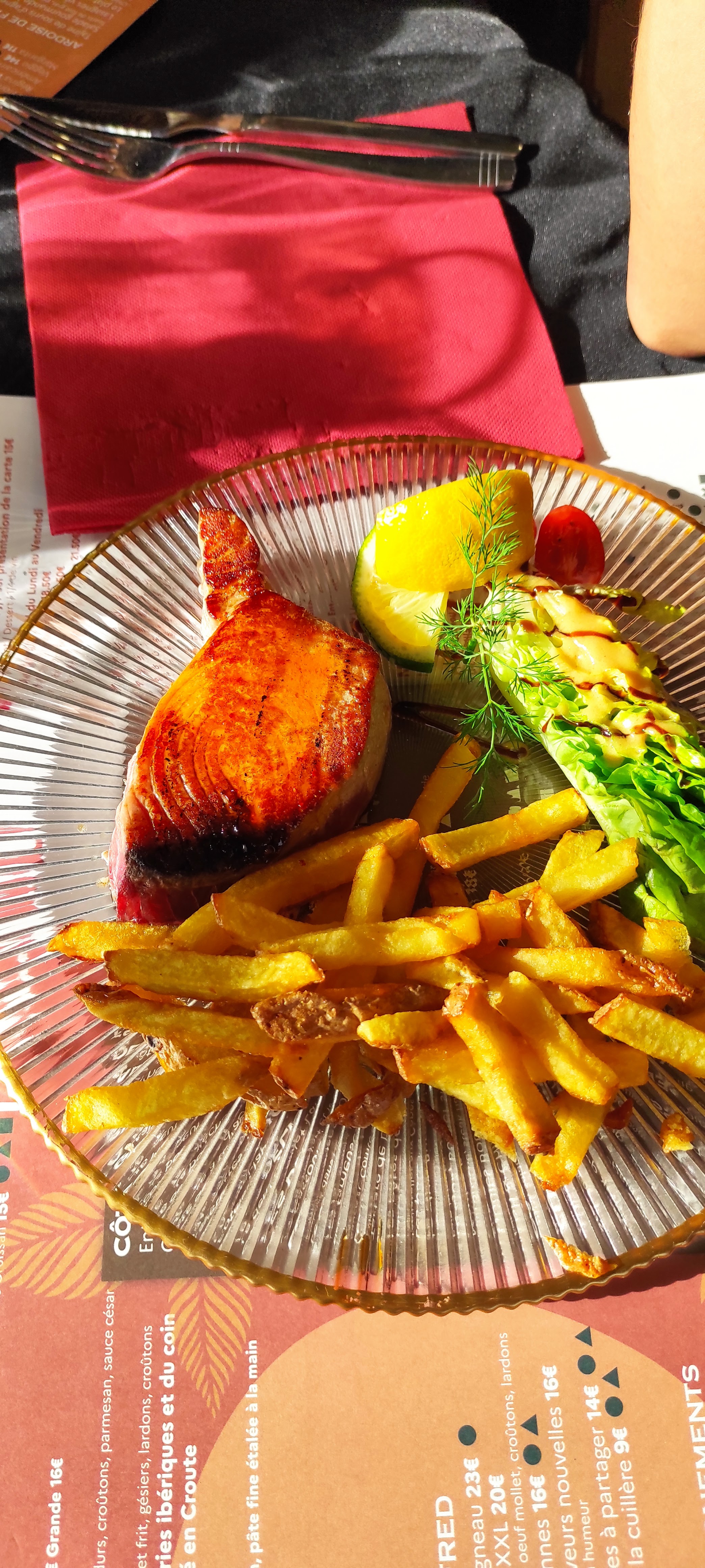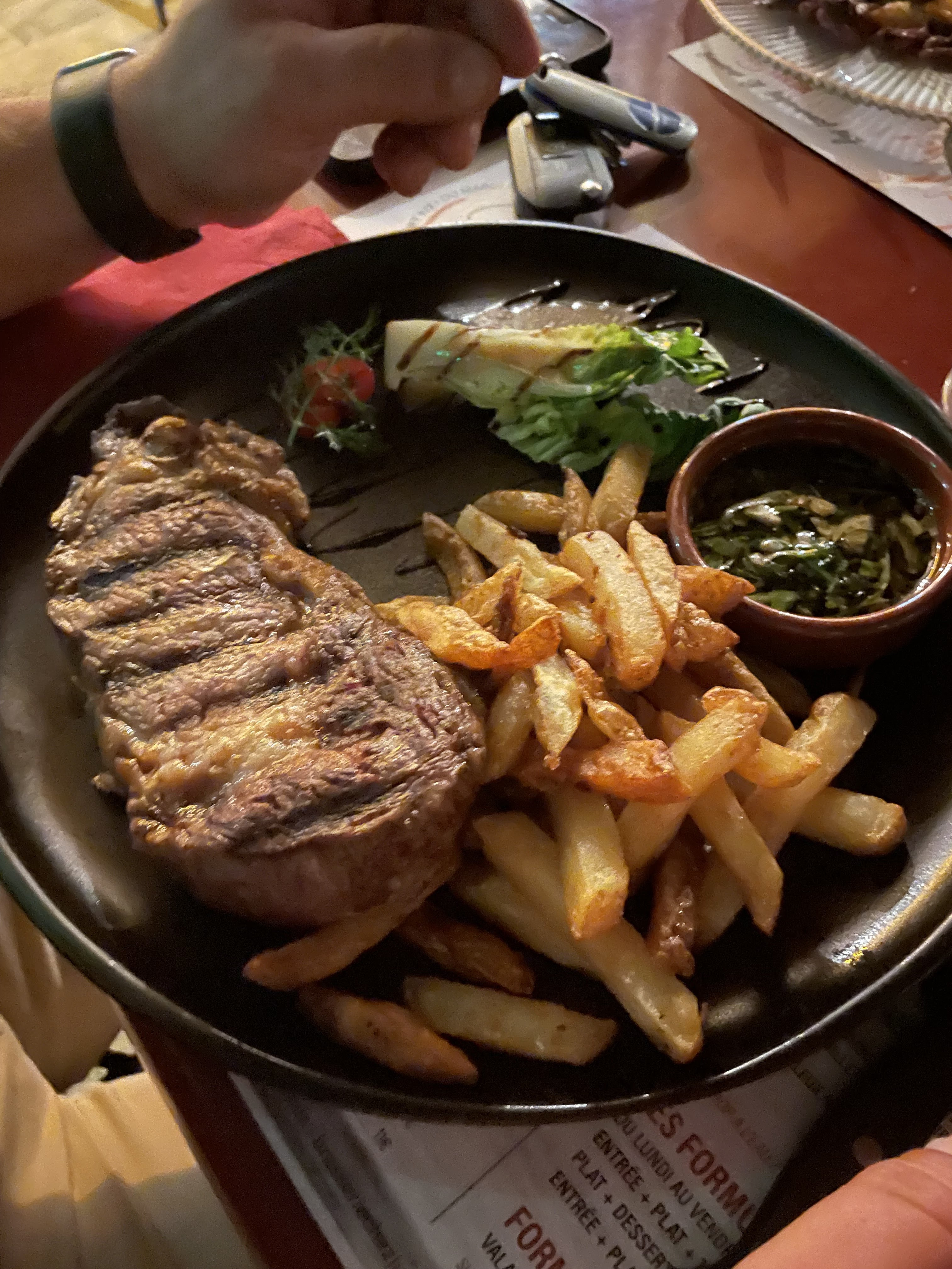 Simplicité, efficacité,musicalité Tout ceci à prix très doux.. La carte peut ravir les plus difficiles sans tomber dans l'excès de plats et ce juste équilibre nous annonce une fraîcheur absolue de ce qui est proposé. Mes convives ont pris des salades César et Saumon, une côte à l'os annoncée à 700 gr qui faisait pas loin du kilo et pour ma part je me suis régalé avec une entrecôte Chimichurri dans les règles de l'art. Les desserts ont aussi remporté un franc succès.. Mon tour de taille en a pris un coup 😁 Bref je recommande vivement.. Bravo à Ju et son équipe qui allie expérience et jeunesse