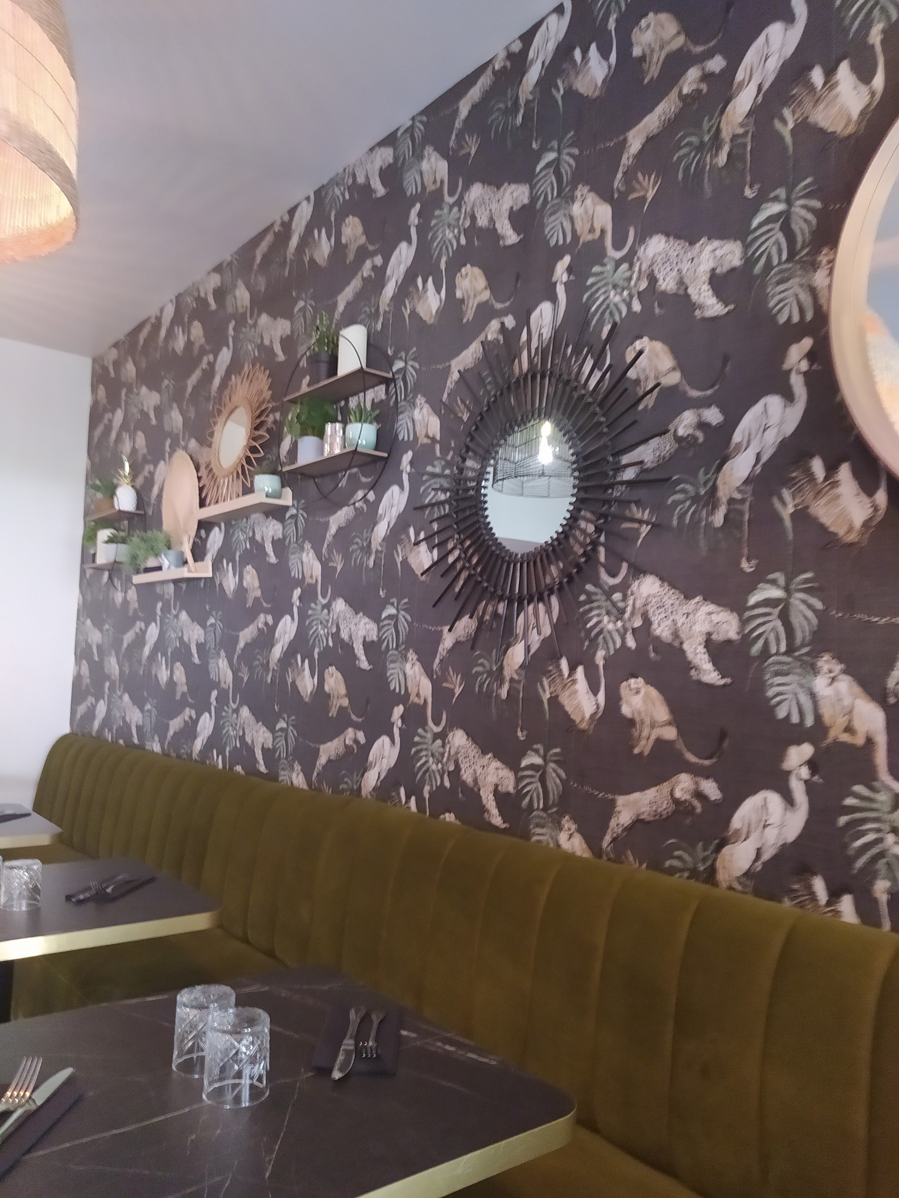 Plaisir des yeux en entrant dans ce beau restaurant joliment décoré façon evasion safari, plaisir des oreilles au son des rythmes latino, re-plaisir des yeux avec des assiettes bien présentées et bien garnies et plaisir des papilles car les recettes sont savoureuses et la plupart des ingrédients sont locaux Le tout avec un accueil chaleureux aussi bien des humains que des toutous Mes coups de cœur : la galette sardine accompagnée de pommes de terre sautées et de salicornes et la crêpe kinder bueno servie avec Chantilly choco-noisettes Merci à toute l équipe pour cet agréable moment