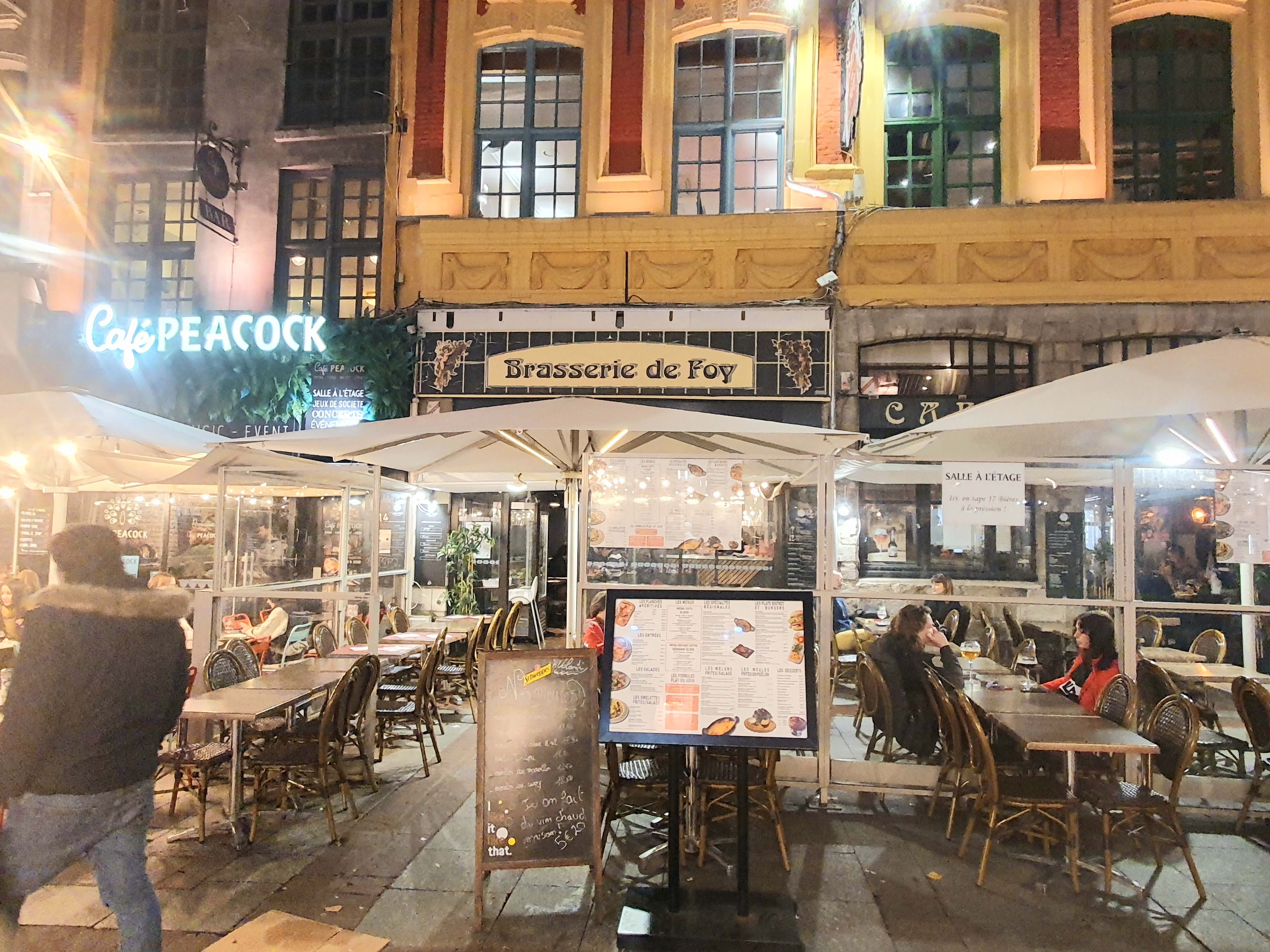 Je lis des avis très négatifs sur cet établissement '' café de Foy'' que je découvre... Pour notre part, un verre en terrasse. L'accueil, sûrement par le responsable était agréable et souriant. Peu de monde en ce dimanche midi frais sur la terrasse. Le service était rapide et efficace et tout en sourire aussi. 1 bière pression Moulin 4€ 1 bière pression Paix Dieu 7,50€ Oui, les bière pression sont devenues bien chères mais ce n'est pas que dans ce bar. En résumé, pour nous, un moment sympa en terrasse sur une rue piétonne, entre la place Rihour et la Grand Place de Lille