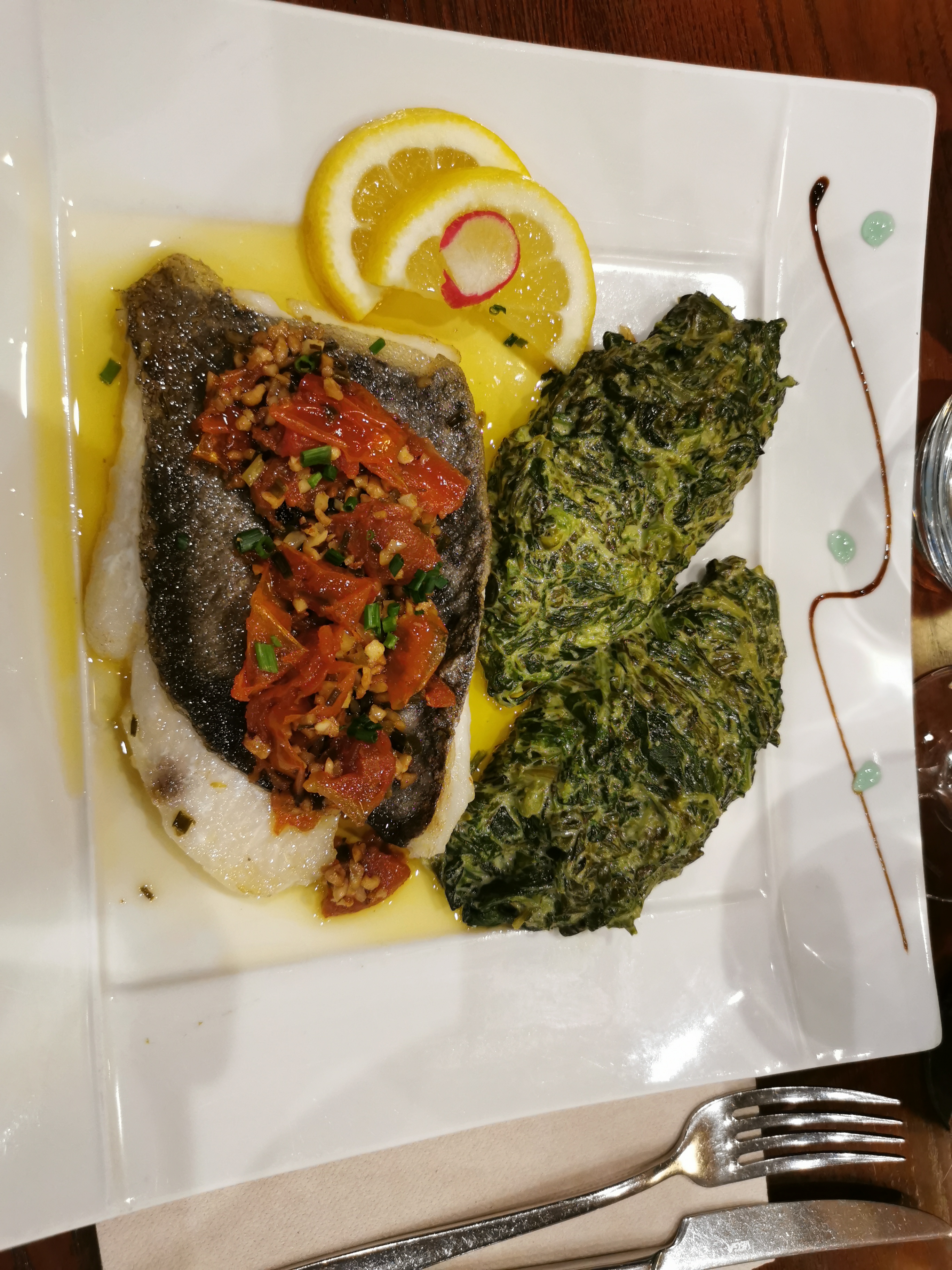 Dîner insipide. Soupe à l’oignon qui était un jus clair sans goût. Poisson ultra cuit sans saveur avec un accompagnement de tomates cuites coupées en deux avec de la chapelure … d’un autre temps.