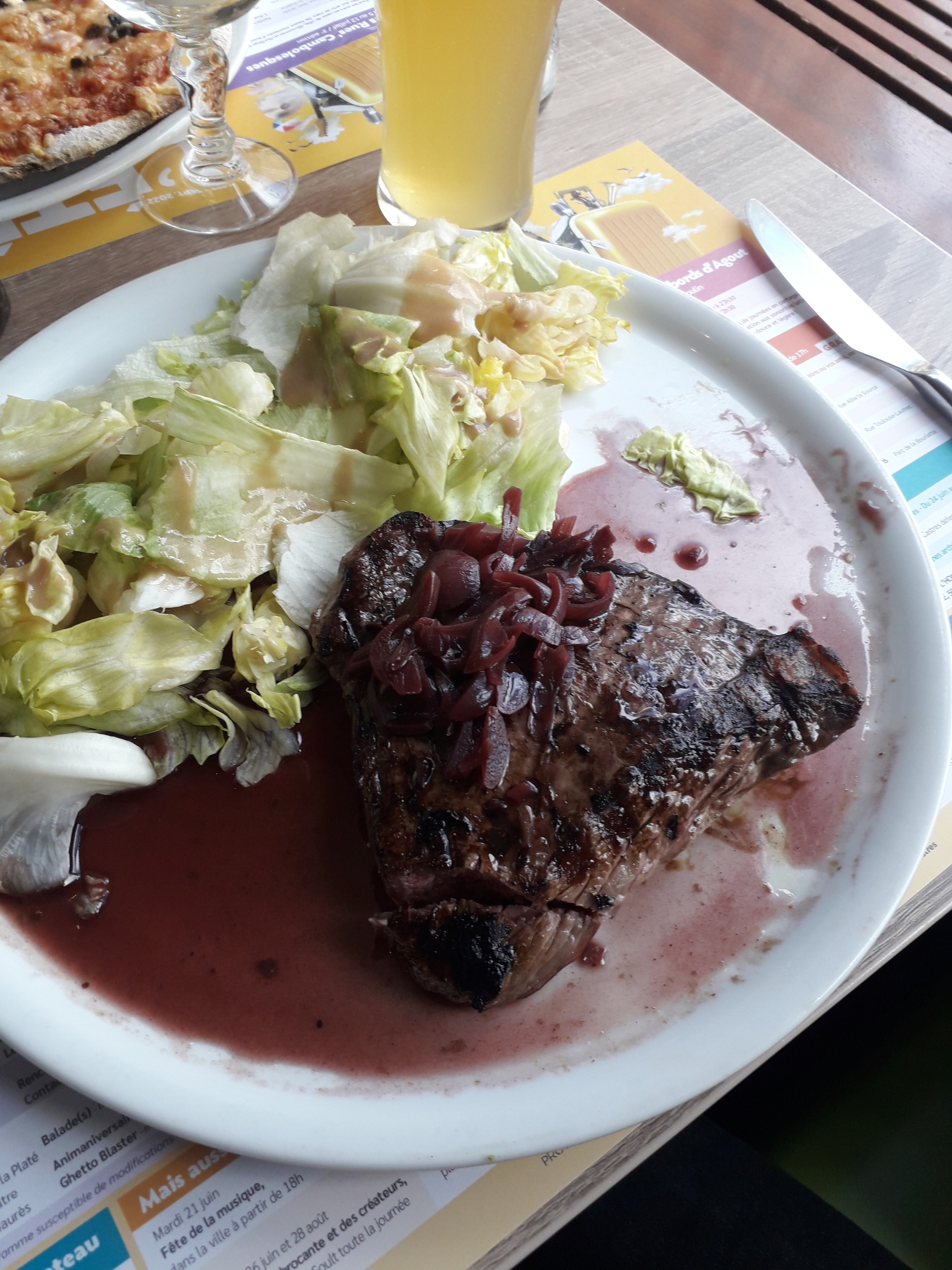 Il est très rare que je mette une mauvaise note pour un établissement, surtout s'il est situé dans ma ville de cœur. Le serveur et la serveuse ont très bien faits leur travail et étaient très agréables. Environ une heure d'attente pour une table de 6, à noter tout de même qu'on a passé toute la soirée avec la bouteille d'eau vide, sans avoir la possibilité d'en redemander une autre. - l'entrecôte est bonne et bien présentée à la cuisson souhaitée - 15,50€ l'assiette pasta, clairement c'est du vol, c'est la première fois de ma vie que je vais aller me commander un macdo parce que je pensais au moins manger à ma faim et non pas un menu enfant. - ne parlons pas des St Jacques. - les tranches d'oranges dans l'assiette, sortez des années 80 par pitié. Alors engagez des runners et arrêtez de prendre 200 personnes en terrasse si vous ne pouvez pas les assumer. Pour finir, ne pensez pas que si l'assiette revient vide dans la cuisine c'est parce que le client a apprécié, c'est plutôt que ça me fait bien ch**r de payer ce prix pour ce plat-là, pour le rendre à moitié mangé. Merci