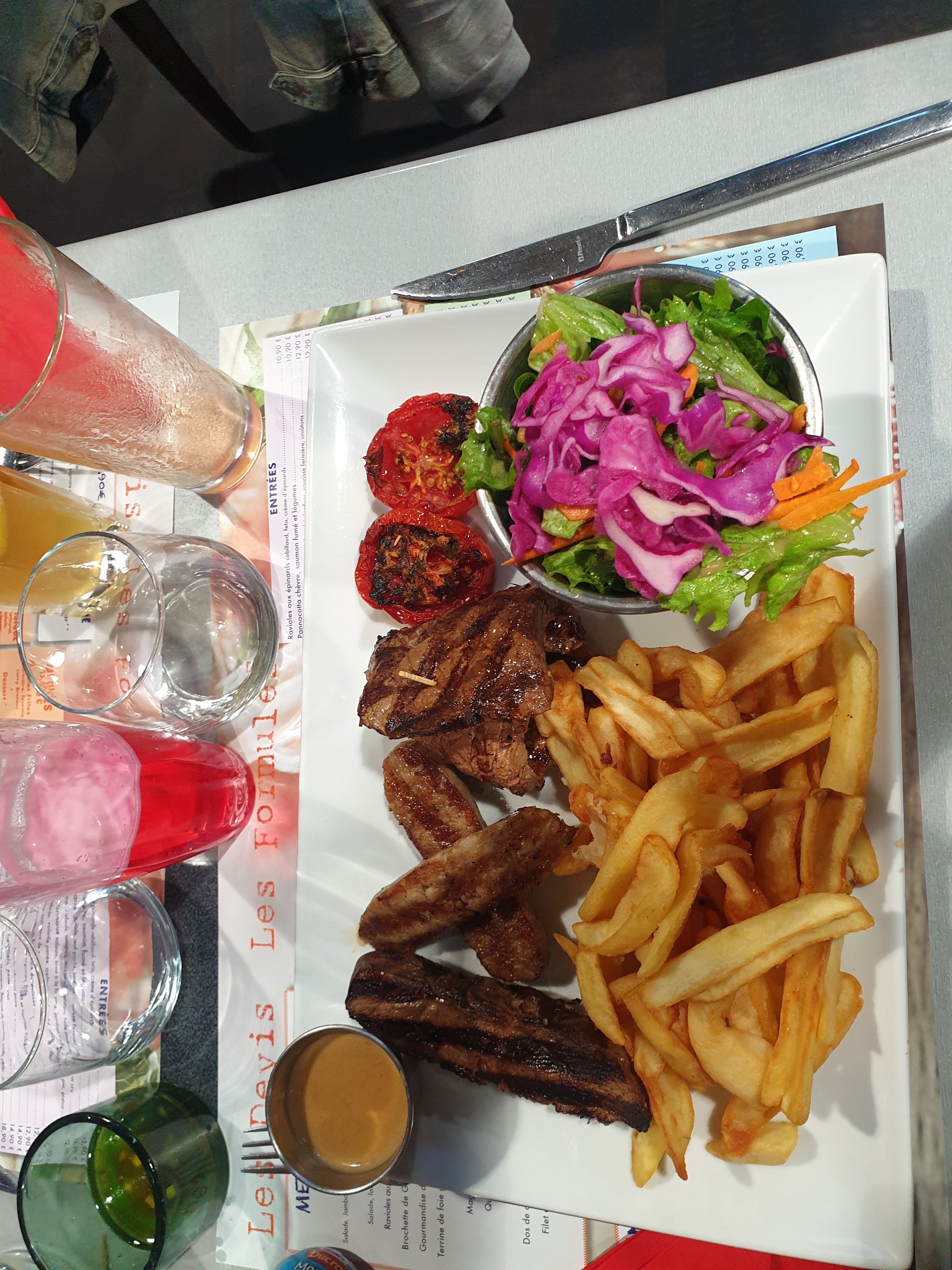 Comment dire… oublie d’un apéro pour une personne de notre table, ensuite manque de couverts et qui plus est étaient sales. Ensuite, nous avons pris un faux-filet (si il faisait 100g c’était le bout du monde, alors que sur le menu on rajoute 4€ tout de même). Ensuite, un filet de poulet gratiné à la fourme, heuuuuuu, un morceau de fourme posé sur un petit morceau de poulet (vive l’appellation « gratiné ») et pour finir j’aurai pu boucher les trous dans les murs avec ma mousse au chocolat. Complètement déçus.