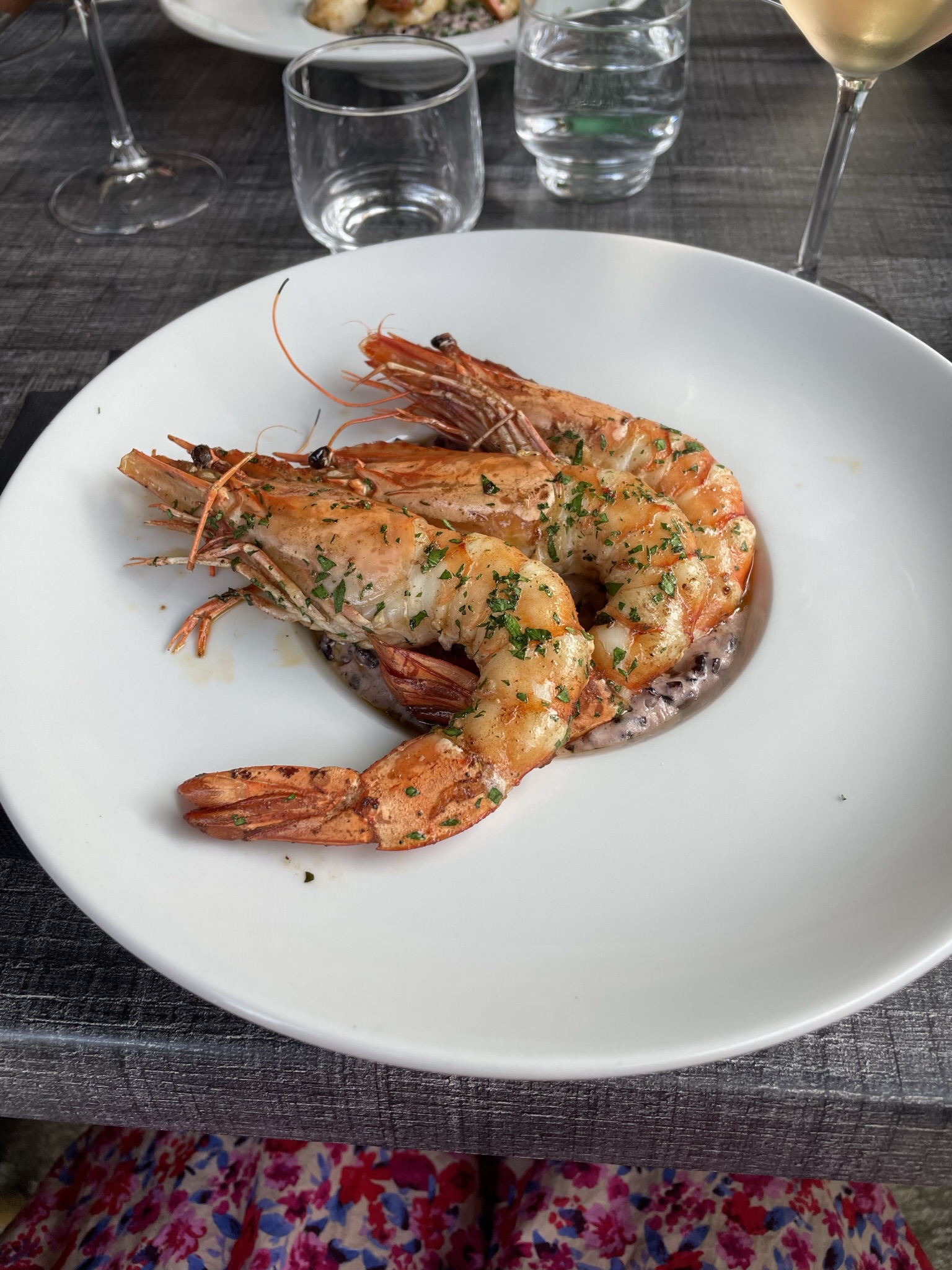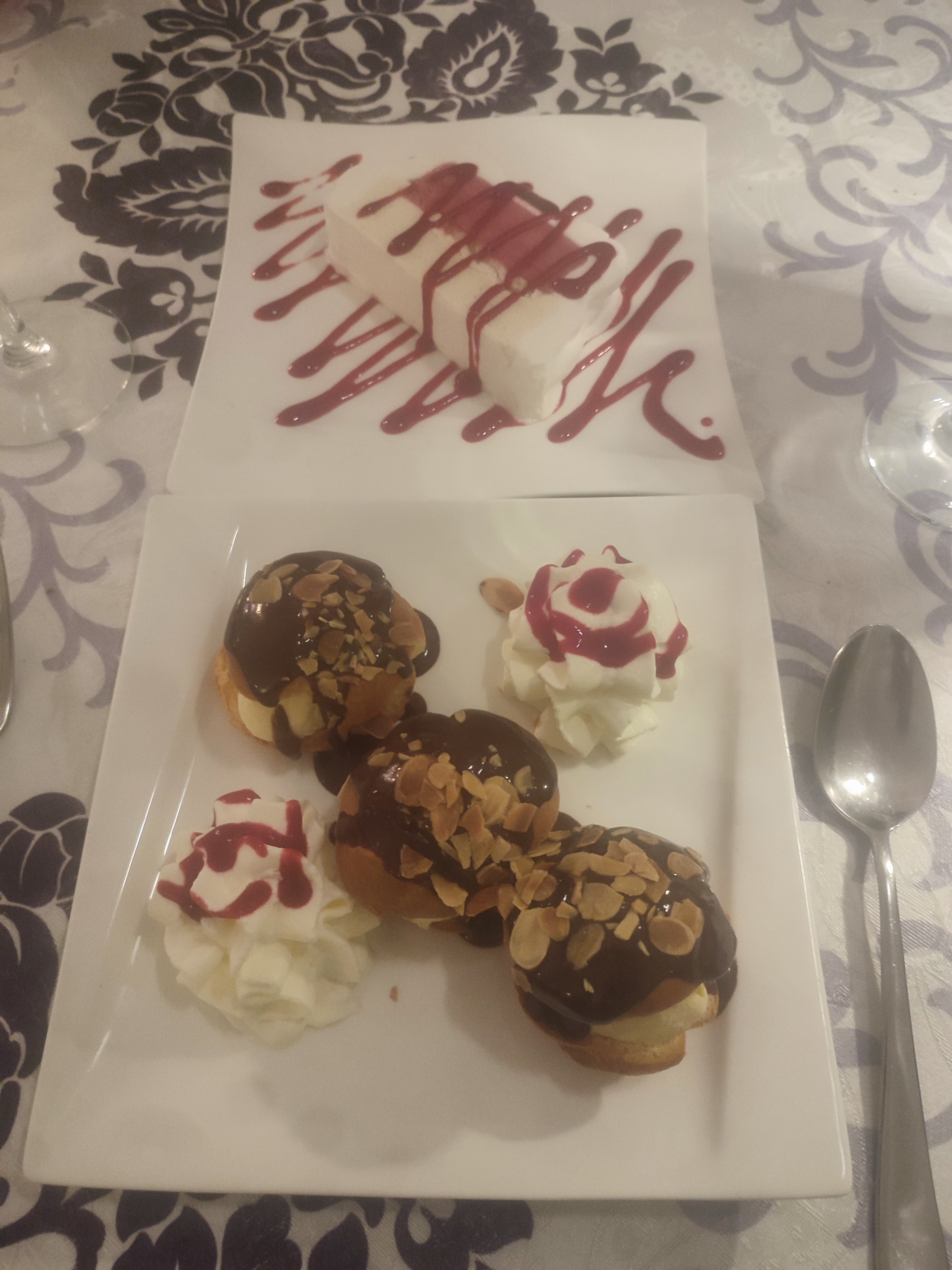 Nous étions un groupe de six. Mon mari et moi avons essayé 3 des repas (risotto aux crevettes, daurade et os de veau) et tous étaient exceptionnellement bons. Le poisson et le veau avaient un côté de légumes. Trois d'entre nous ont mangé une tarte aux framboises en dessert, également délicieuse. Il y avait une option de menu à trois plats. La dame qui servait ne parlait pas anglais, mais était très sympathique et le service était excellent. Le propriétaire parlait un peu anglais et était heureux de prendre des photos de notre groupe. Le restaurant a été recommandé par des amis qui y étaient allés quelques nuits plus tôt. Nous le recommandons également.