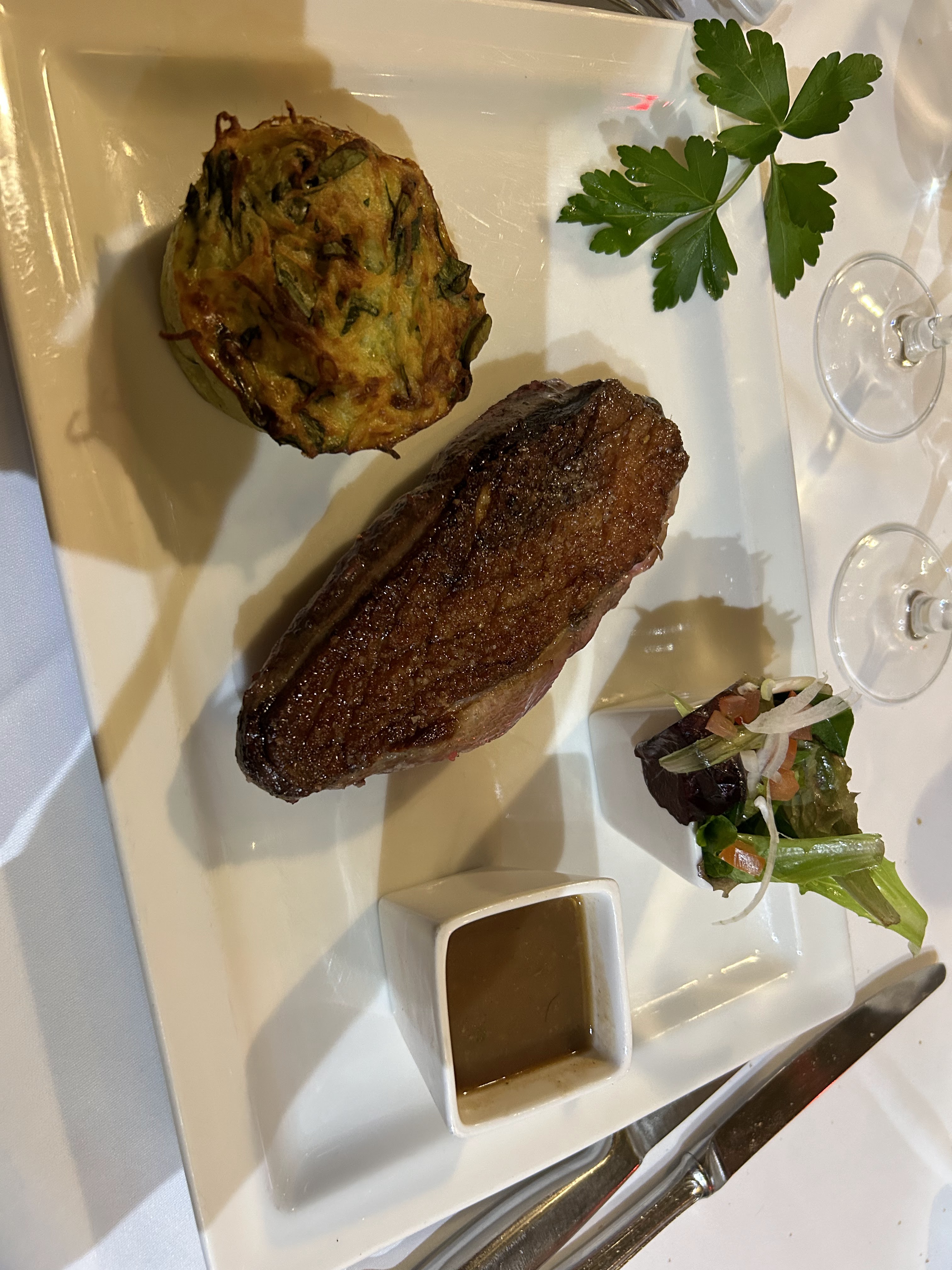Excellente nourriture. Il y avait du saumon fumé pour commencer. Puis steak avec purée de pommes de terre comme plat principal. Normalement, je n’aime pas mon bleu vapeur saignant, mais celui-ci était très tendre et coupé comme du beurre. La pâtisserie dessert était également excellente.