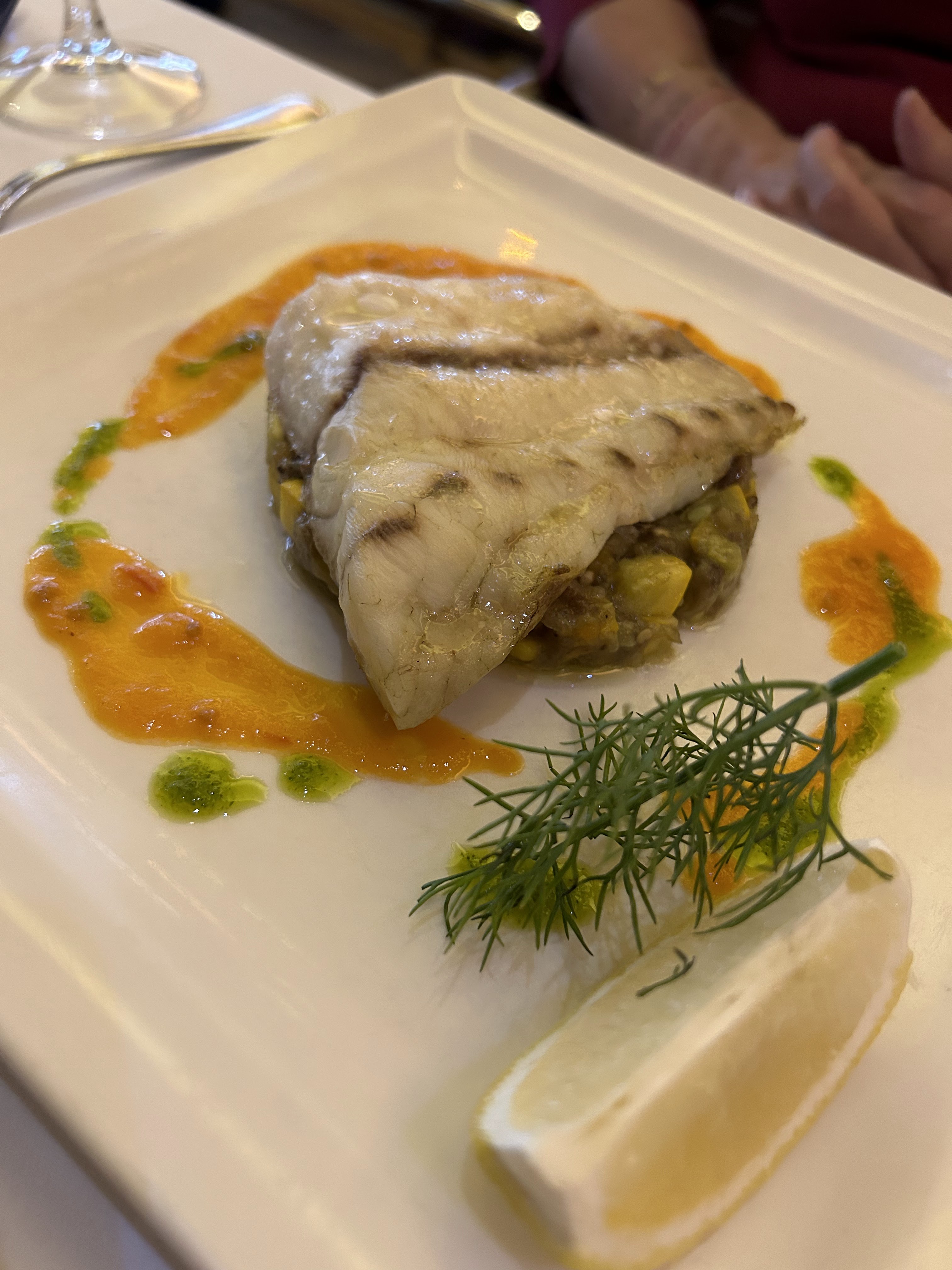 Repas 21h, le garçon nous conseille un filet maigre (30 euros) qui se révèle une portion congrue et fade, aves 3 asperges effilées ; l'autre choix est une volaille accompagnées de pommes sautées qui se présentent réchauffées... Repas très décevant. Nous ne reviendrons pas