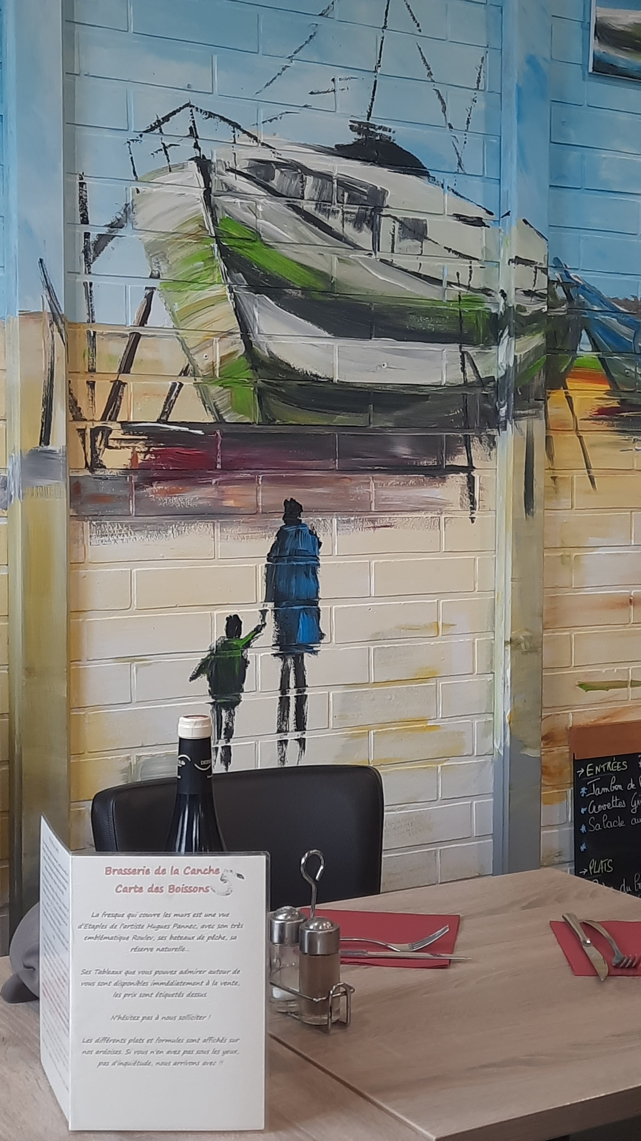 Accueil souriant, de la place, un plat du jour succulent (St Jacques snackées), une belle fresque peinte. Des moules dans le menu enfant :)