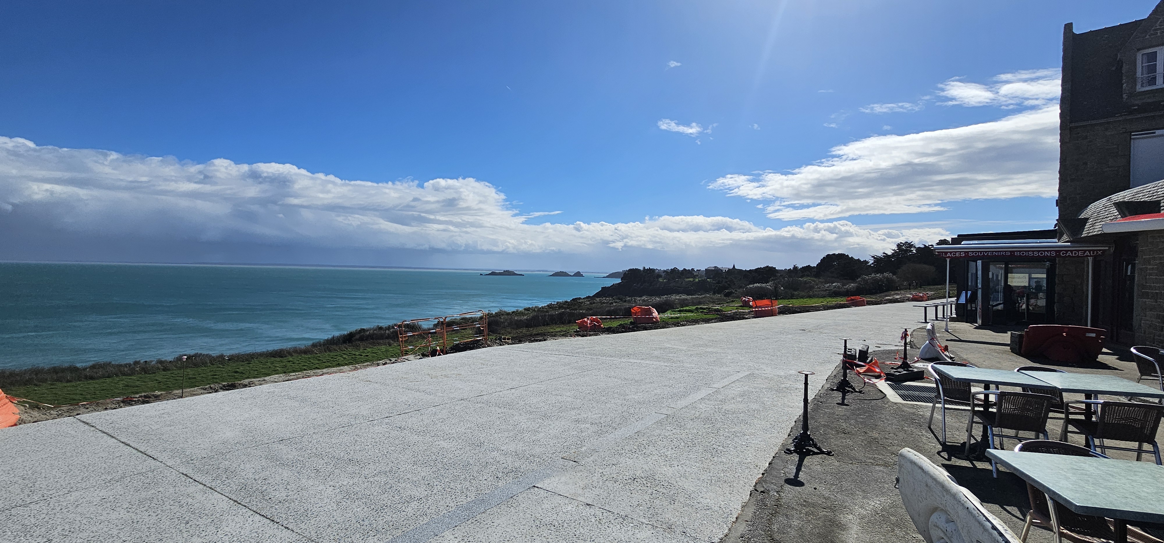 Cadre magnifique à l'abri du vent, malgré les travaux de rénovation du site (pointe du Grouin). Un petit bémol, le restaurant n'a pas accepté qu'une voyageuse utilise les toilettes, alors qu'il n'y a pas de toilettes publiques dans le coin.