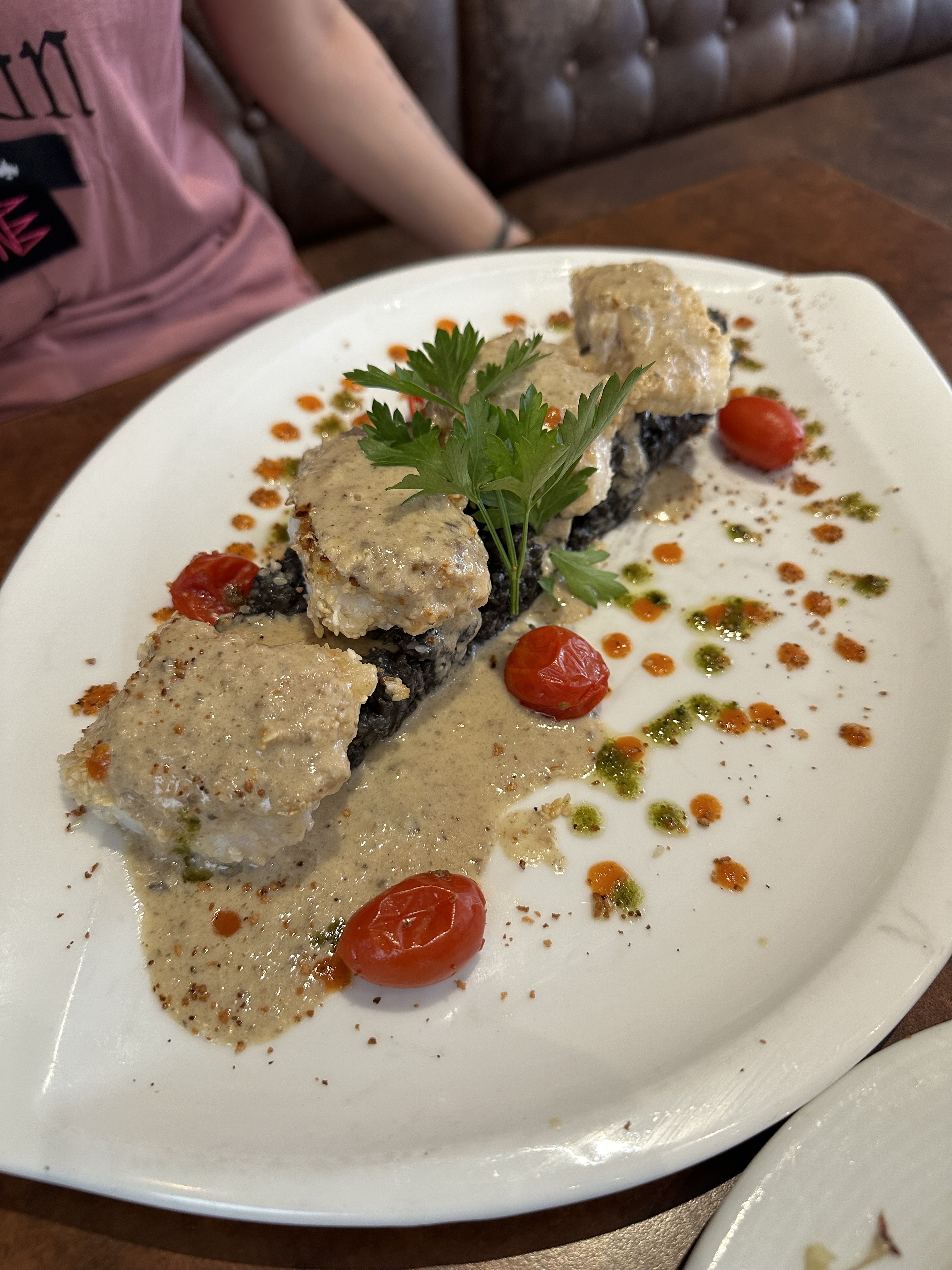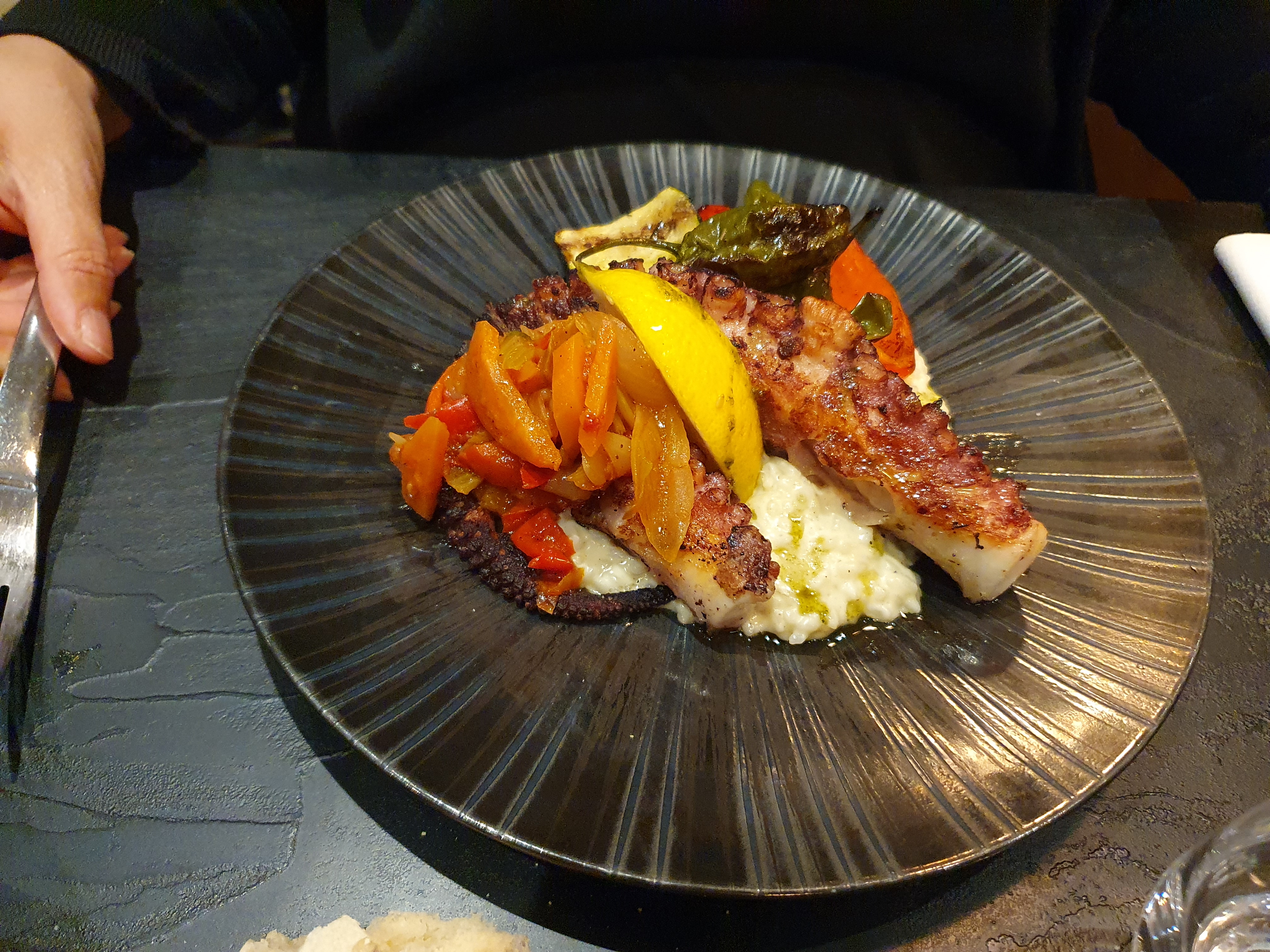Nous avons pris un seul plat à base de Poulpe et Risotto, excellent. Personnel très gentil. Endroit calme sans trop de bruit de fond. Les desserts sont également excellents.