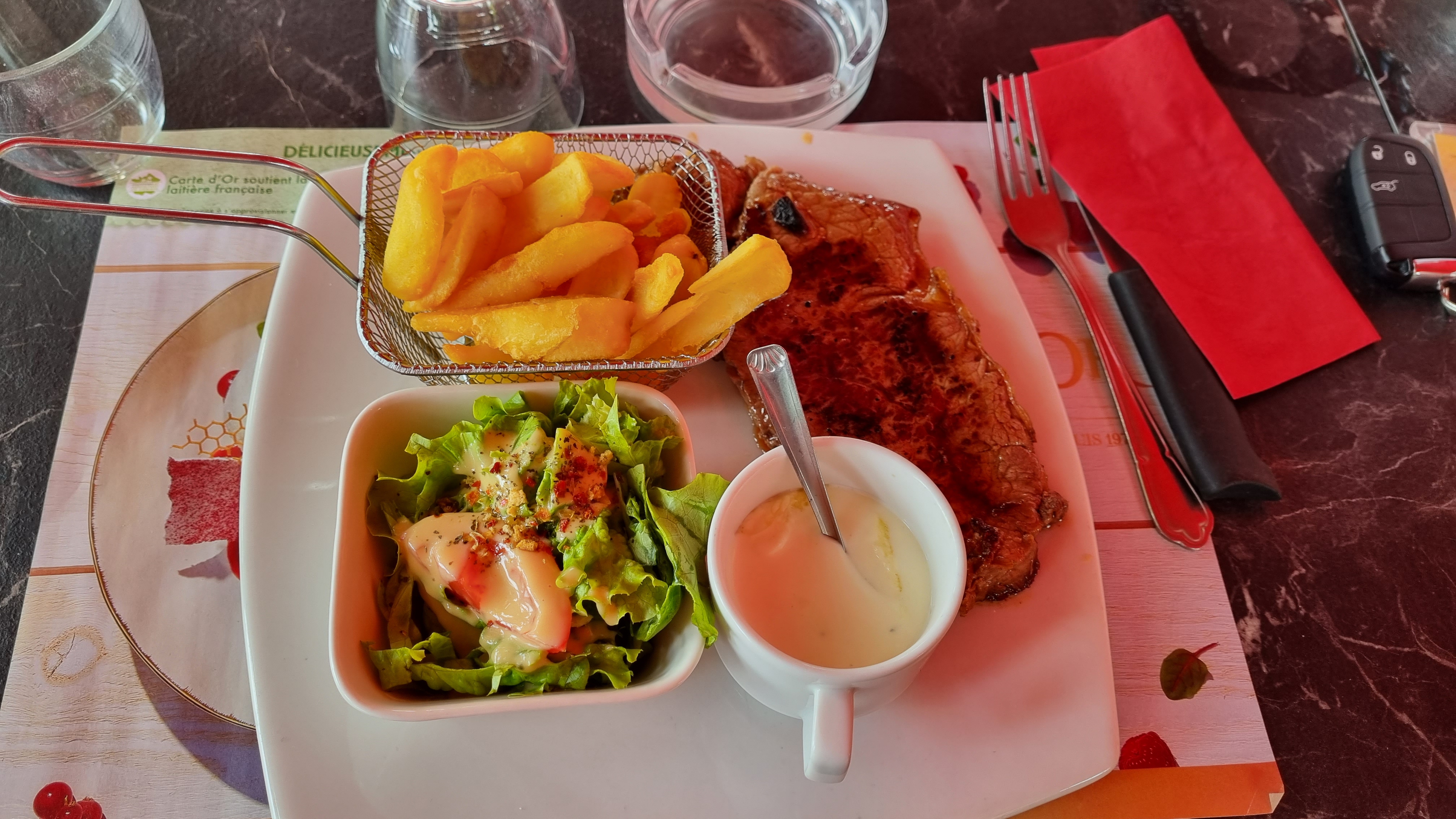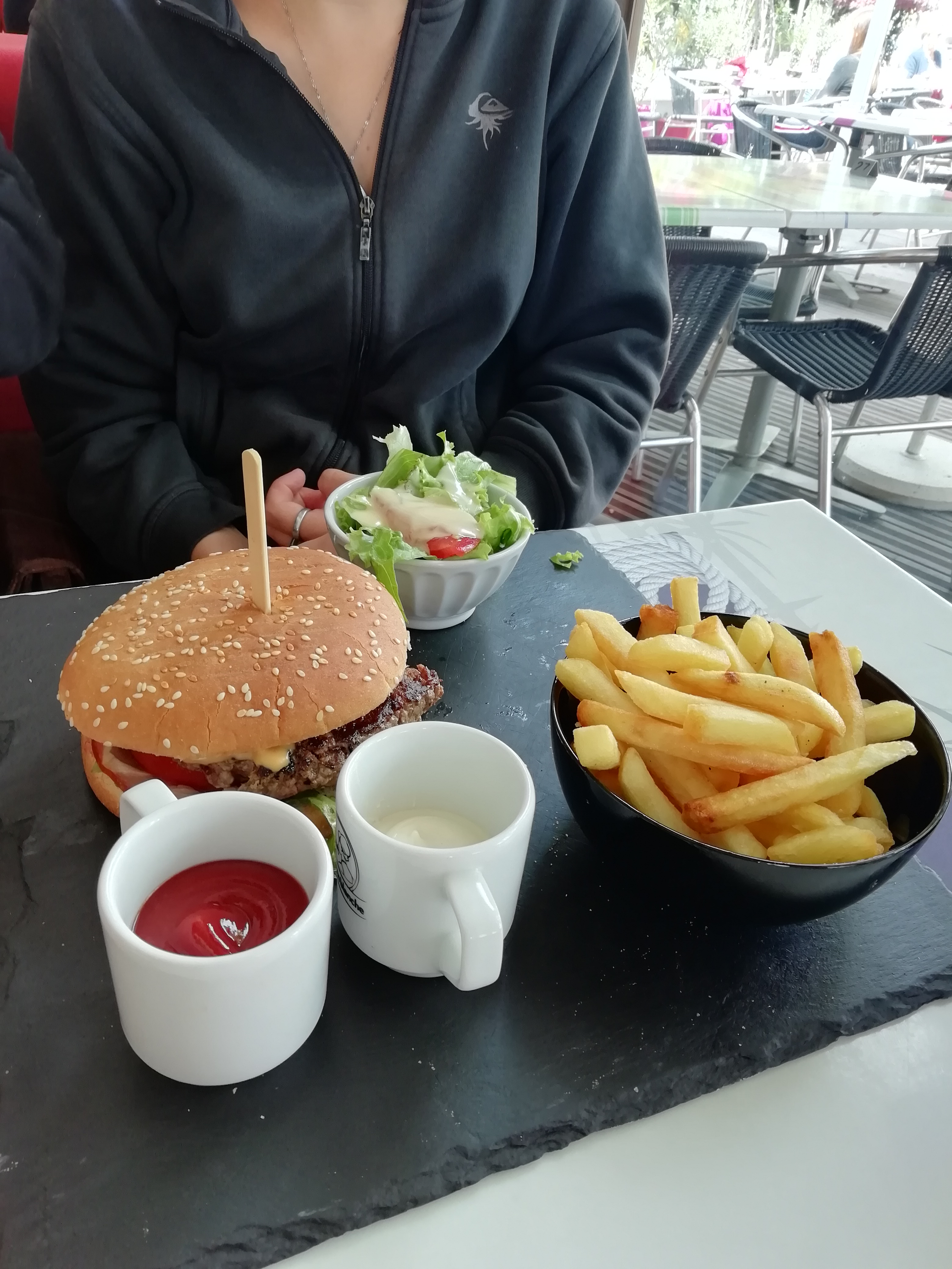 Un petit repas en terrasse, pas prévu, et c'était bien. On a pris la suggestion du jour, l'entrecôte tendre et les frites délicieuses, ou le burger bacon très copieux du menu nous ont régalé.