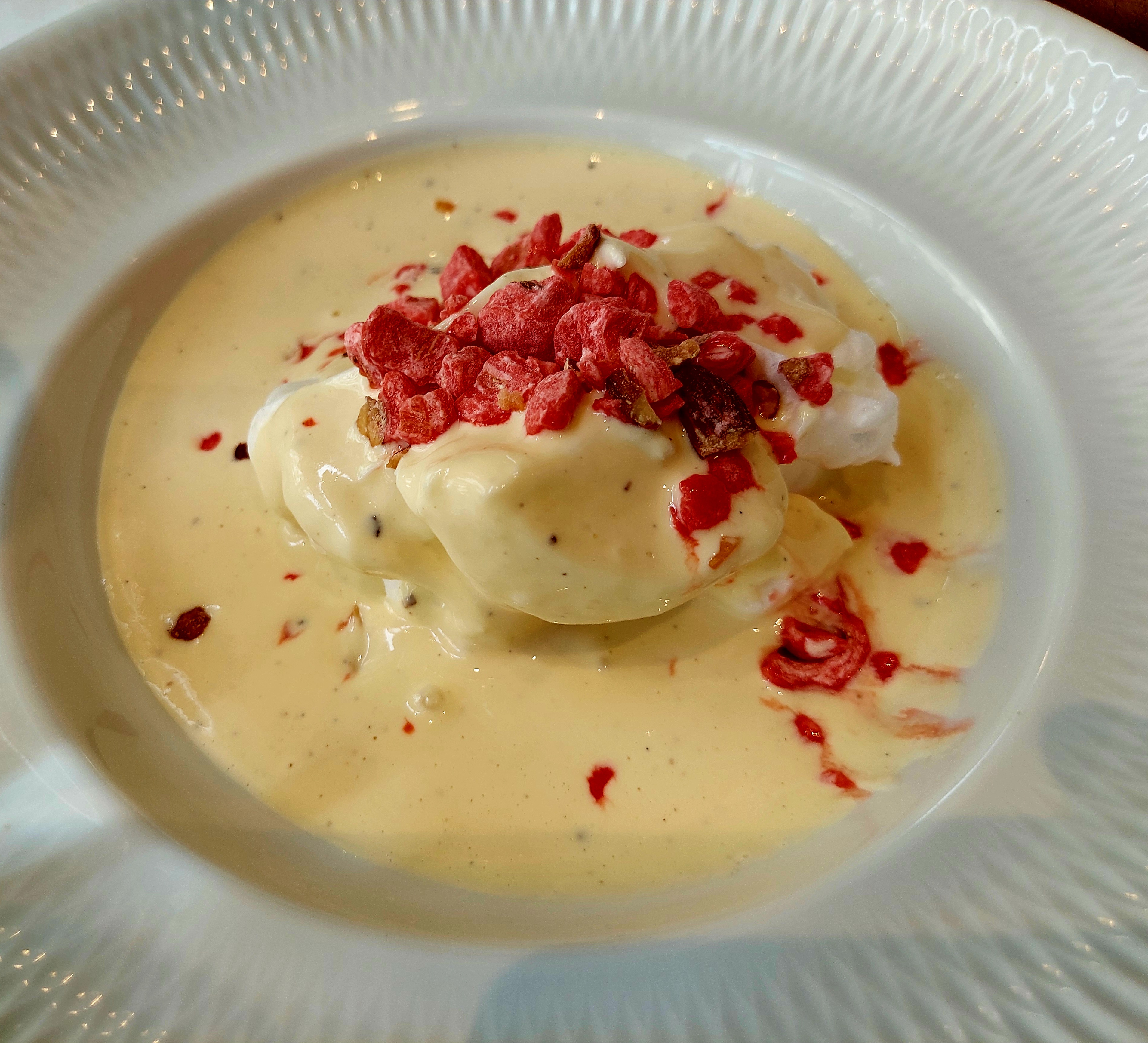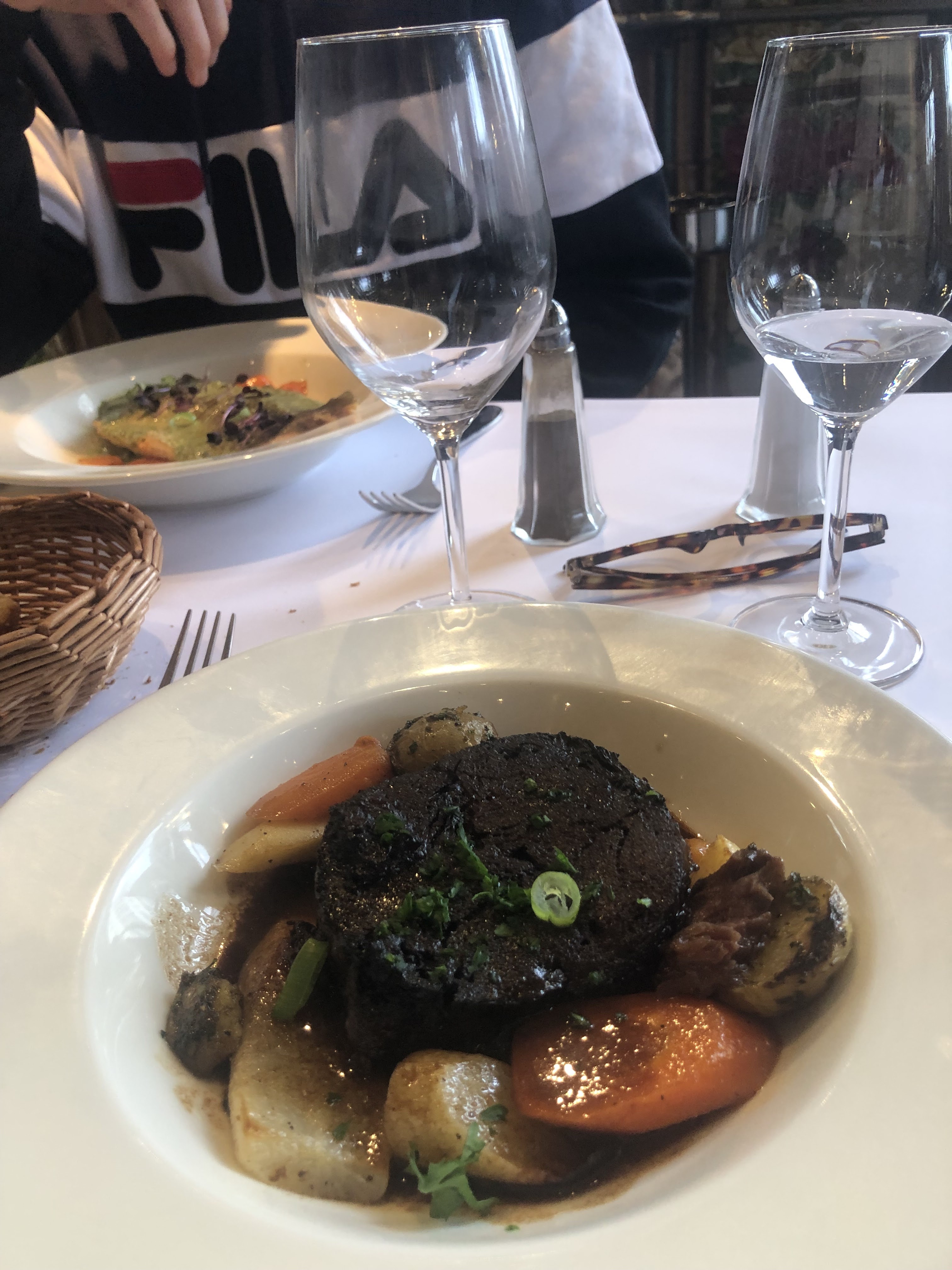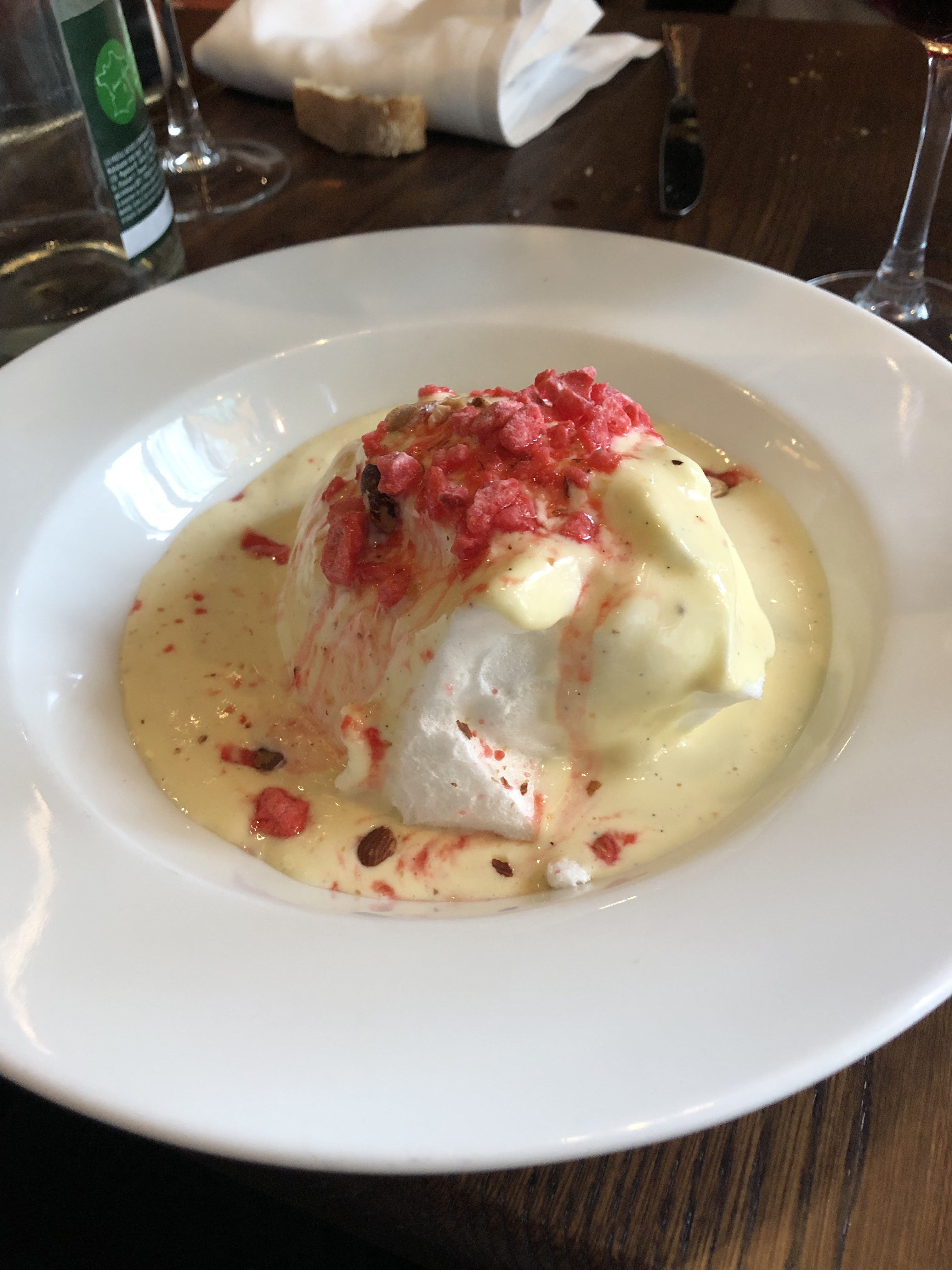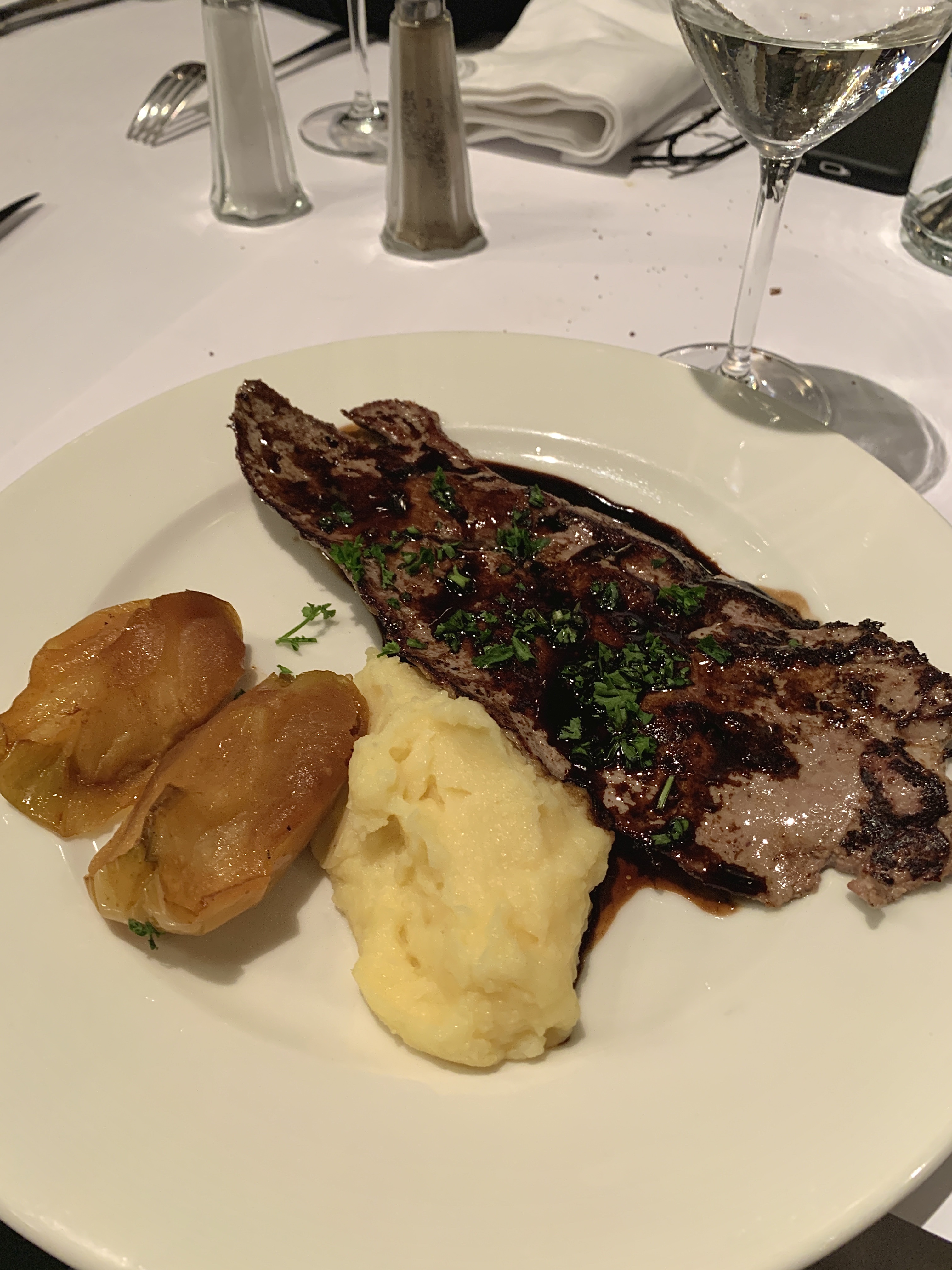 Elle avait du bœuf et moi de la truite. Les deux sont réalisés à la perfection. J'ai eu un dessert aux œufs enneigés. C'était super. Mon apéritif était un œuf à la coque sur de la viande et du pain. Encore une fois, la perfection. Personnel attentionné et nourriture de classe mondiale. Nous serons de retour!