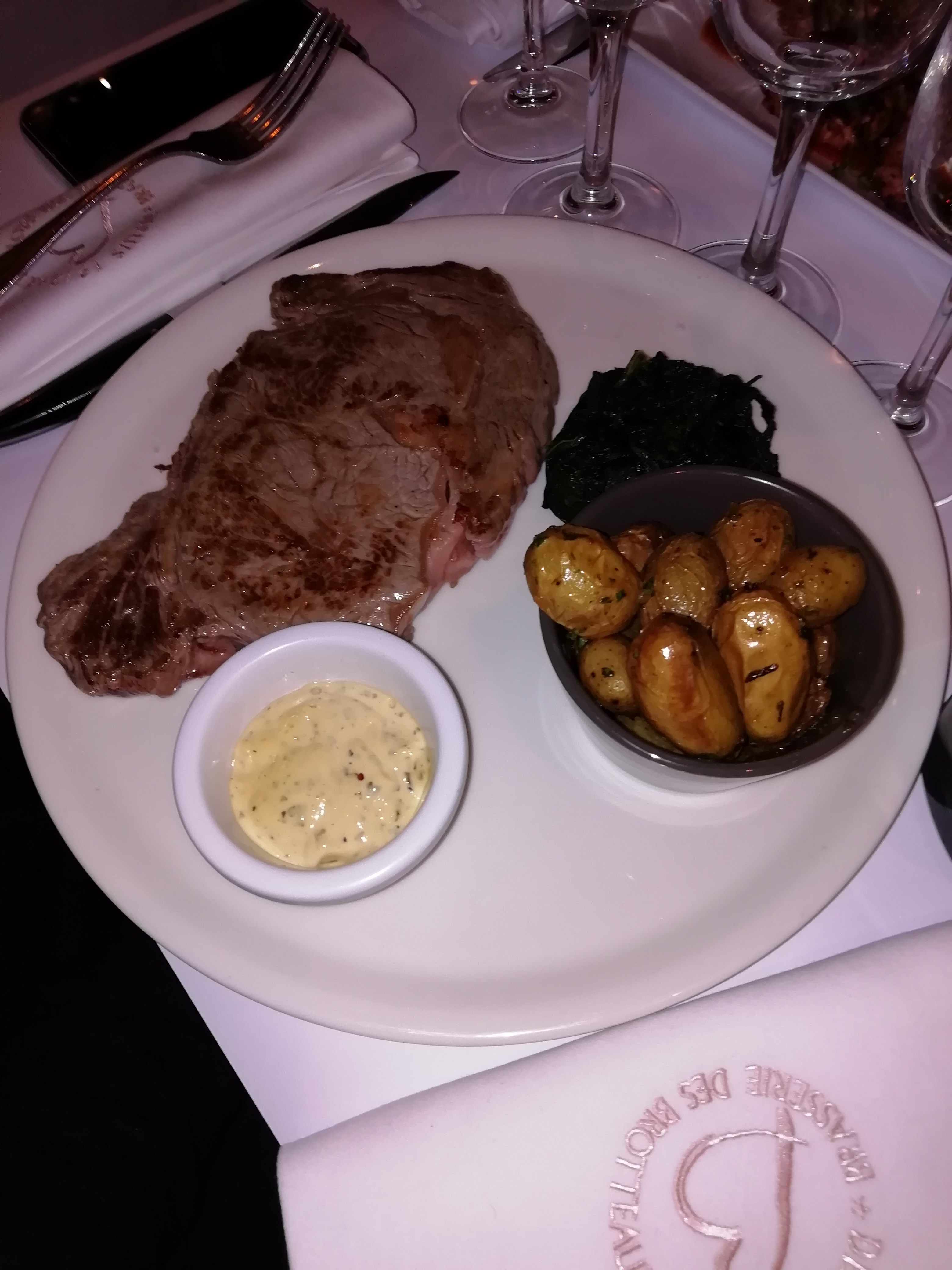 Amateur de viande, j'avais commandé une entrecôte sauce morilles. Cuisson bleue mais malheureusement, servie saignante. Le morceau n'était pas des plus tendre et surtout très très innervé. Compliqué à découper, j'ai d'ailleurs dû demander un autre couteau coupant... Le plat m'est arrivé tiède et les pommes de terre, à mon avis, ne venaient pas d'être juste rissolées. La sauce, elle, était parfaite, dommage..