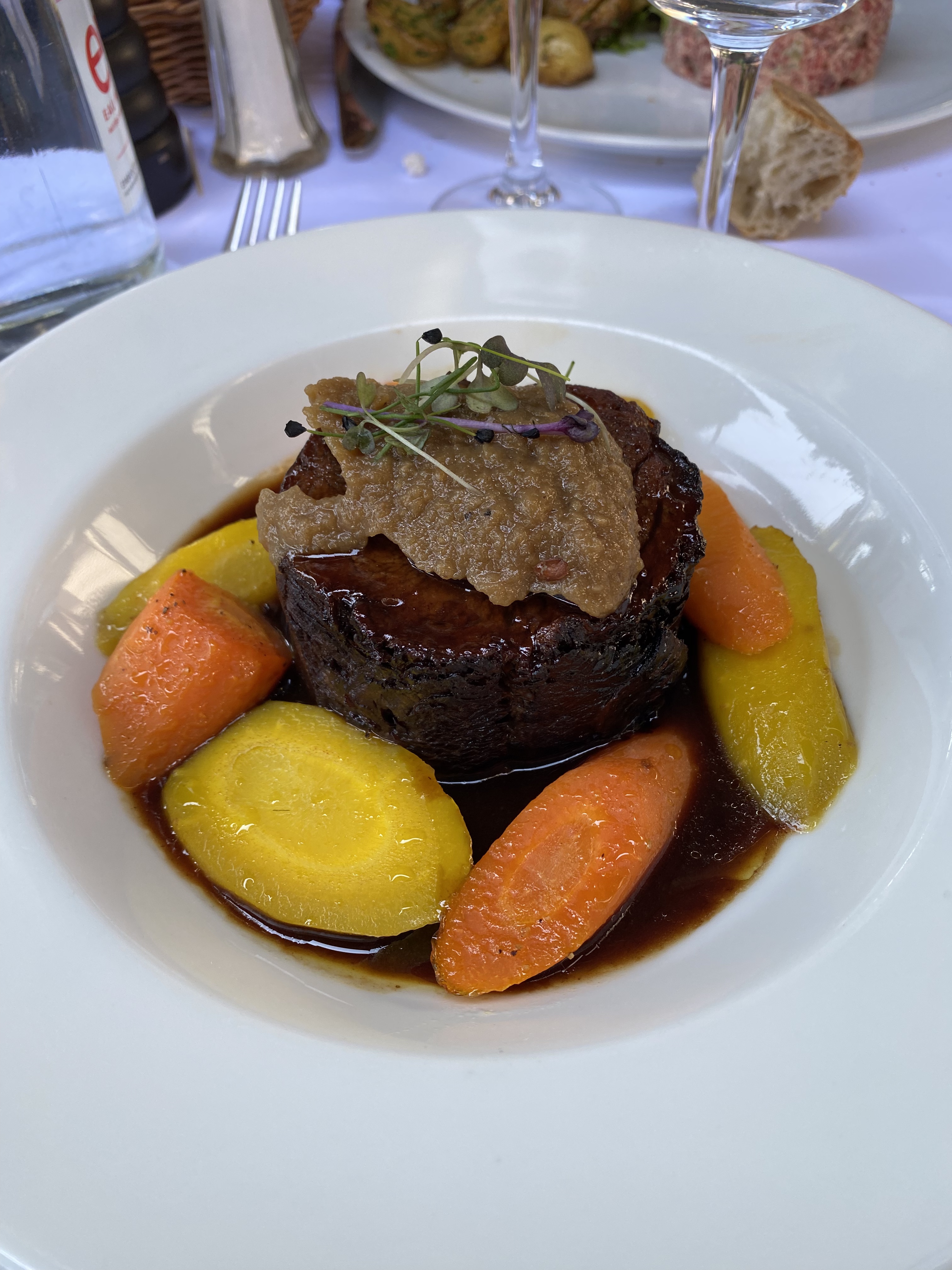 Délicieux plat. Confit de boeuf cuit 8h accompagné de légumes. Je n 'ai goûté que ça. Les desserts avaient l'air bien généreux j'y retournerai pour tester. Seul bémol le pot de rouge. Vraiment pas bon pour un cotes du Rhône et servi frais...🤨 Pas retrouvé le goût d'un vin rouge.
