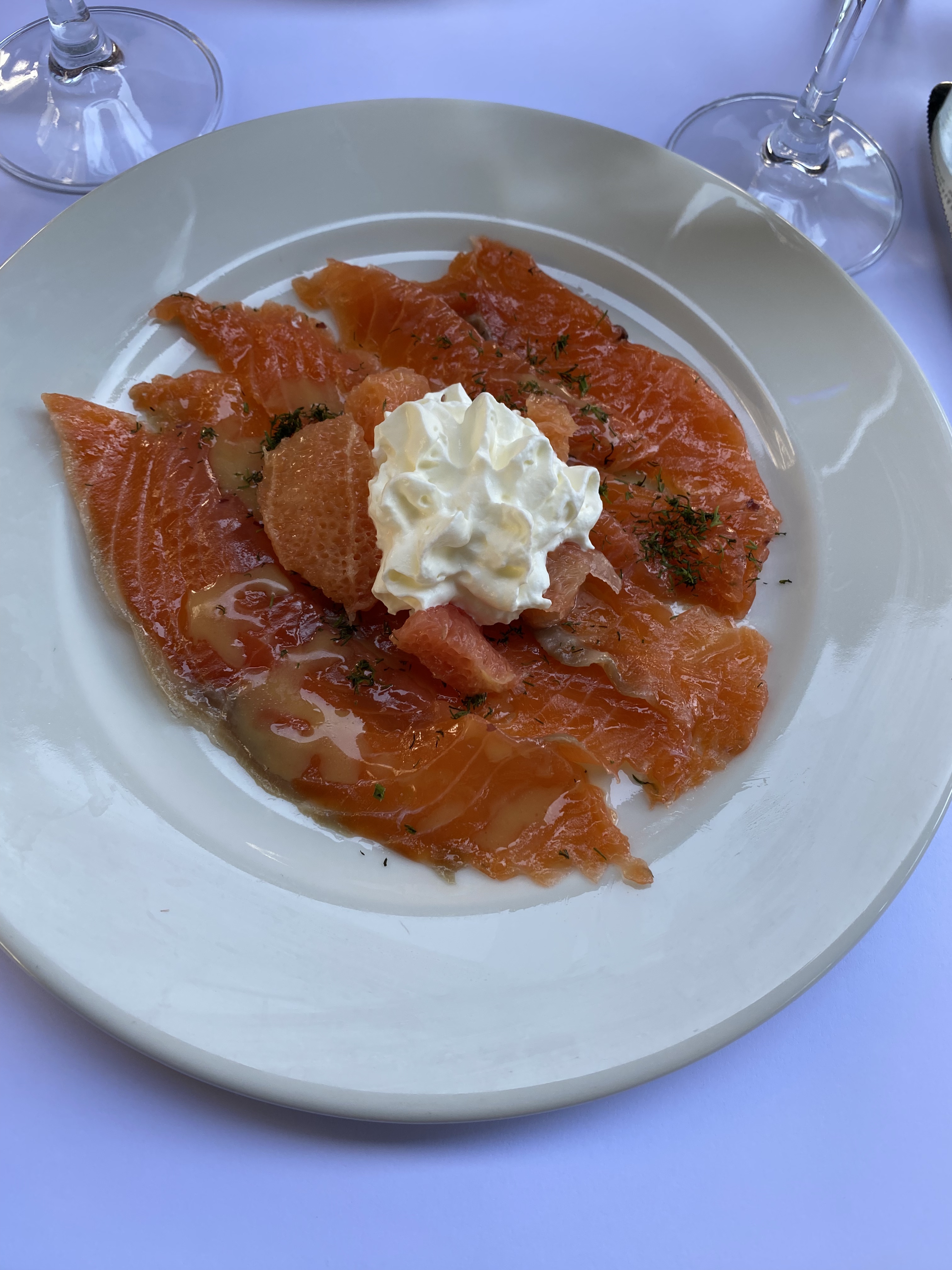 Pas top pour le prix Nous avons attendu 15min avant de recevoir la carte, 15min avant de recevoir l'entrée puis 30min avant de recevoir le plat principal. Il n'y a pas beaucoup de choix pour les boissons soft. La carte n'est pas très claire : ma compagne et moi avions eu 2 cartes légèrement différentes au niveau des plats. À moins de demander, on ne connait pas la composition du mocktail ou quels jus de fruits sont des pur jus ou des nectars. Le pain pourrait être très bon s'il n'était pas mou. La salade est basique au niveau du goût. Le poulet du suprême de volaille était un peu sec. La sauce de la truite saumonée était très bonne. Les oeufs à la neige étaient basiques. Globalement un peu déçu du goût général pour le prix. Le prix est probablement justifié par le lieu et le cadre.