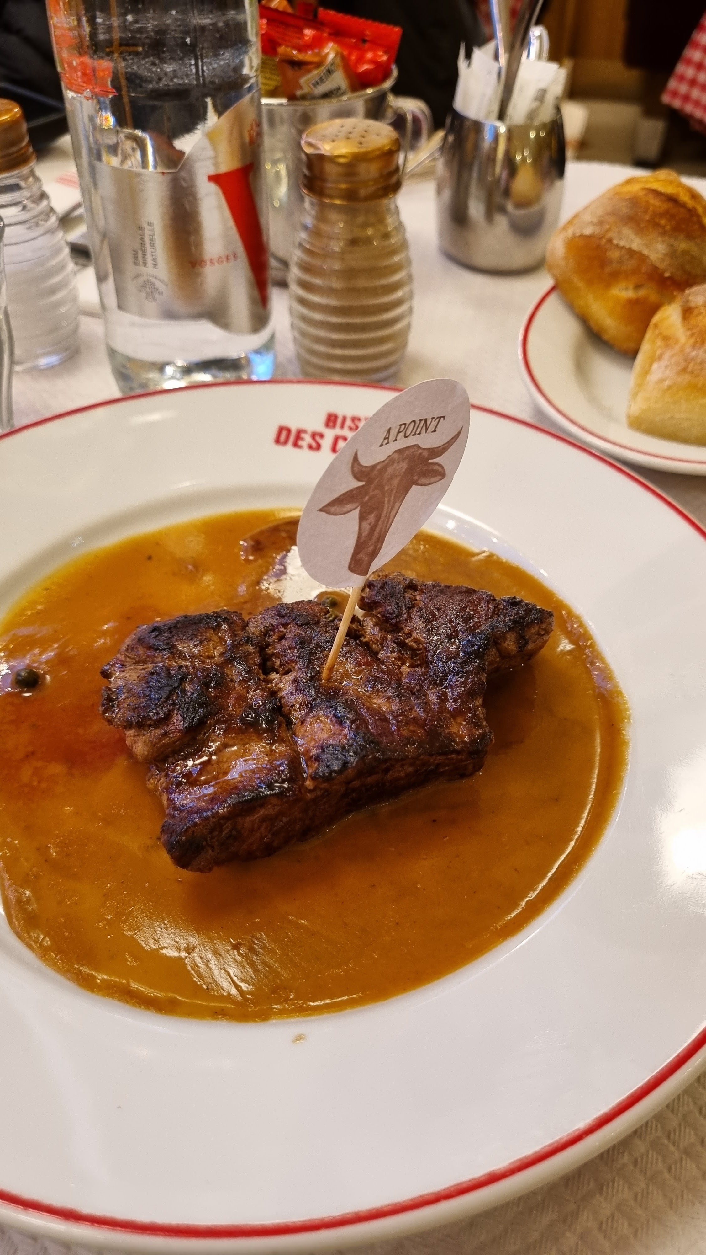 Assez mauvaise expérience ! Le service en général est mauvais, le serveur qui nous a reçus n'a pas dit un mot jusqu'à ce qu'il nous demande comment nous voulions que notre viande soit cuite. Assez impoli aussi, il a donné un coup de pied à l'un de nos sacs lorsque nous nous sommes assis juste pour le déplacer. La nourriture était assez moyenne, l'entrecôte était sèche (d'ailleurs j'ai dit au serveur que je la voulais saignante dans les deux langues), même si la soupe à l'oignon était bonne. C'est cher pour ce que l'on a mais après tout on mange en plein milieu des Champs Elysées donc je comprends bien ça. Je ne reviendrai pas cependant.