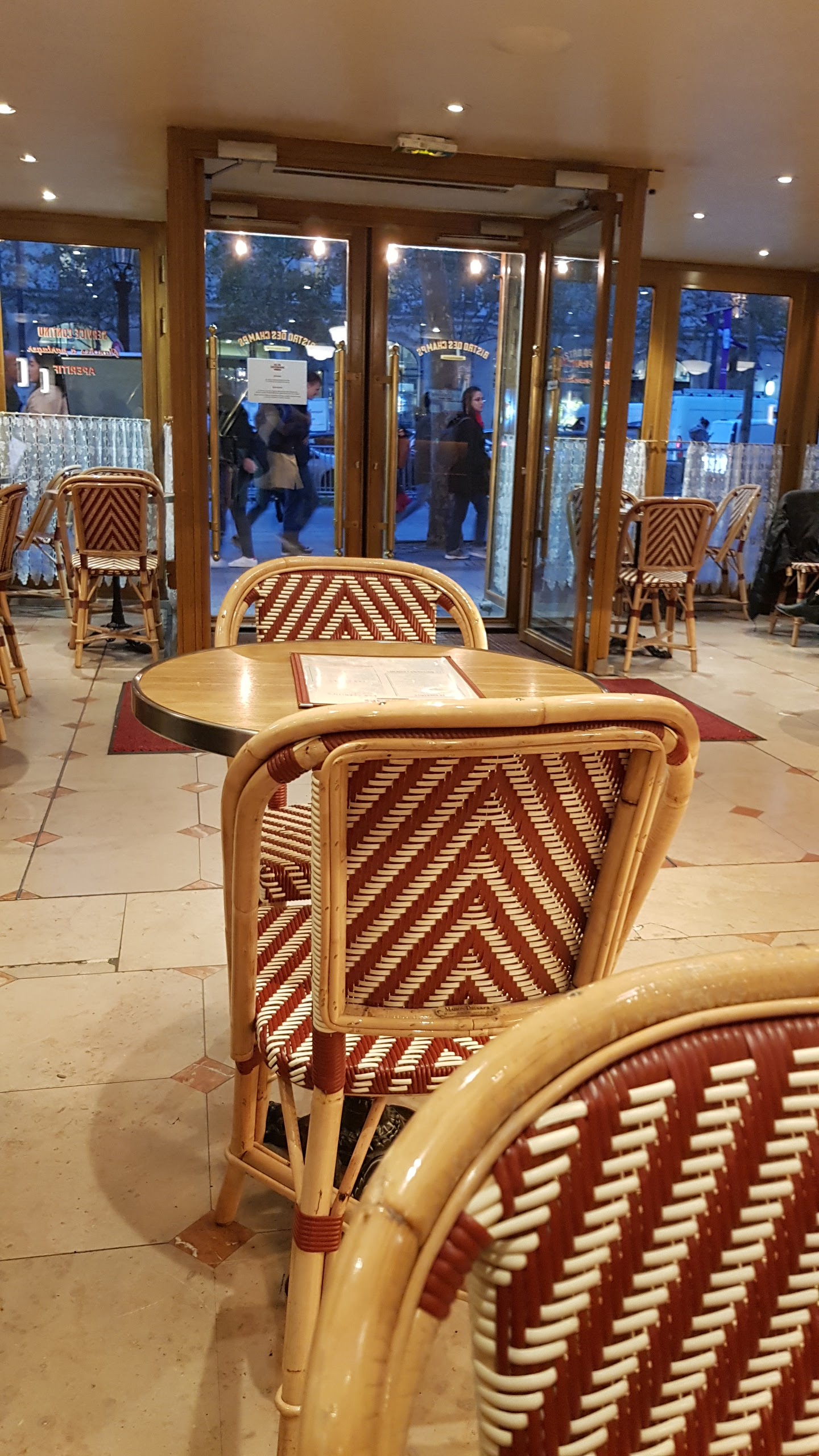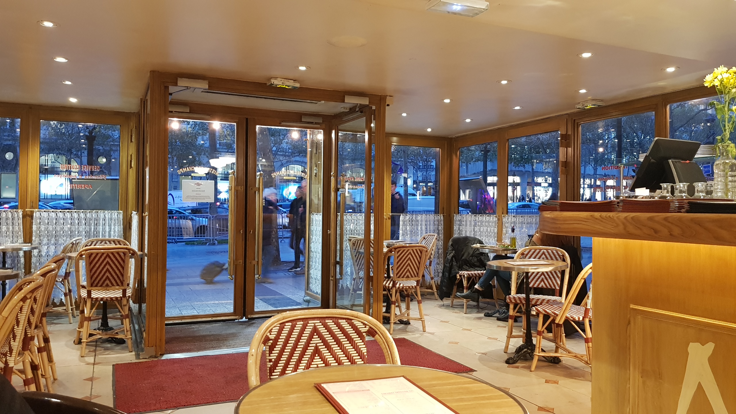 Ce bistrot, en plein cœur des Champs Élysées, dispose de trois niveaux de places assises et constitue un endroit agréable pour s'arrêter déjeuner après une promenade sur le célèbre boulevard. Le menu propose une bonne sélection de plats français, notamment des escargots, des moules, des hamburgers et des toasts. Les boissons sont trop chères et le café est moyen. Il semble s'adresser aux touristes, d'où les tarifs touristiques.