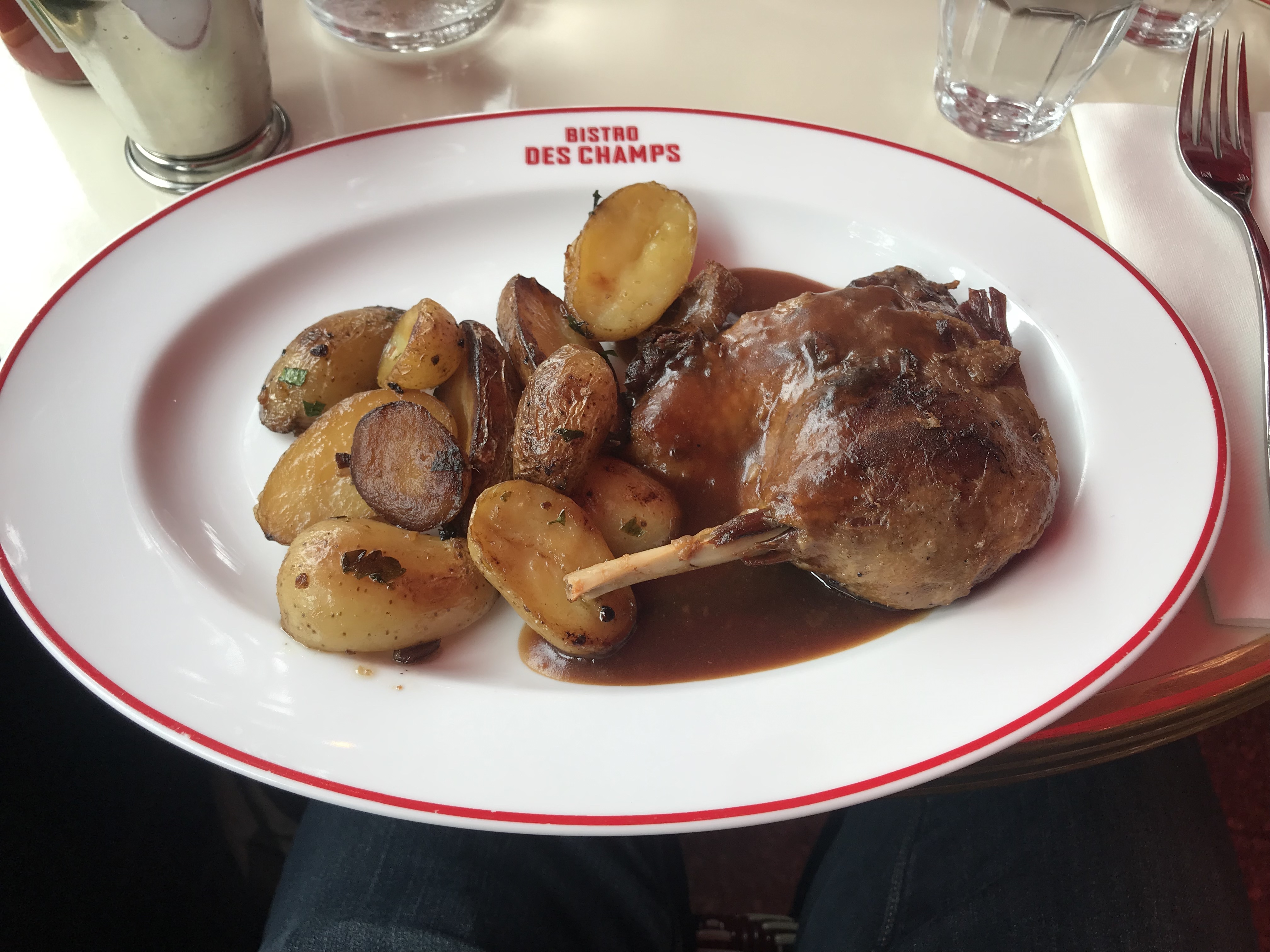 Le Comfit Canard (canard rôti aux petites pommes de terre) était délicieux. Le restaurant est fier de ses standards très élevés (d'accord... c'est les Champs Elysées alors c'est peut-être prévu). Le serveur, M. Robert, a mis beaucoup de temps et de patience pour expliquer les plats. Le tout avec un grand sourire bienveillant ! Il m'a même dissuadé de manger d'autres plats chers, la Planche de Charcutailles de la maison Conquet (plateau de fromages et de charcuterie) et un autre plat français à base de bœuf cru, même si j'y suis habitué en provenance d'Italie.