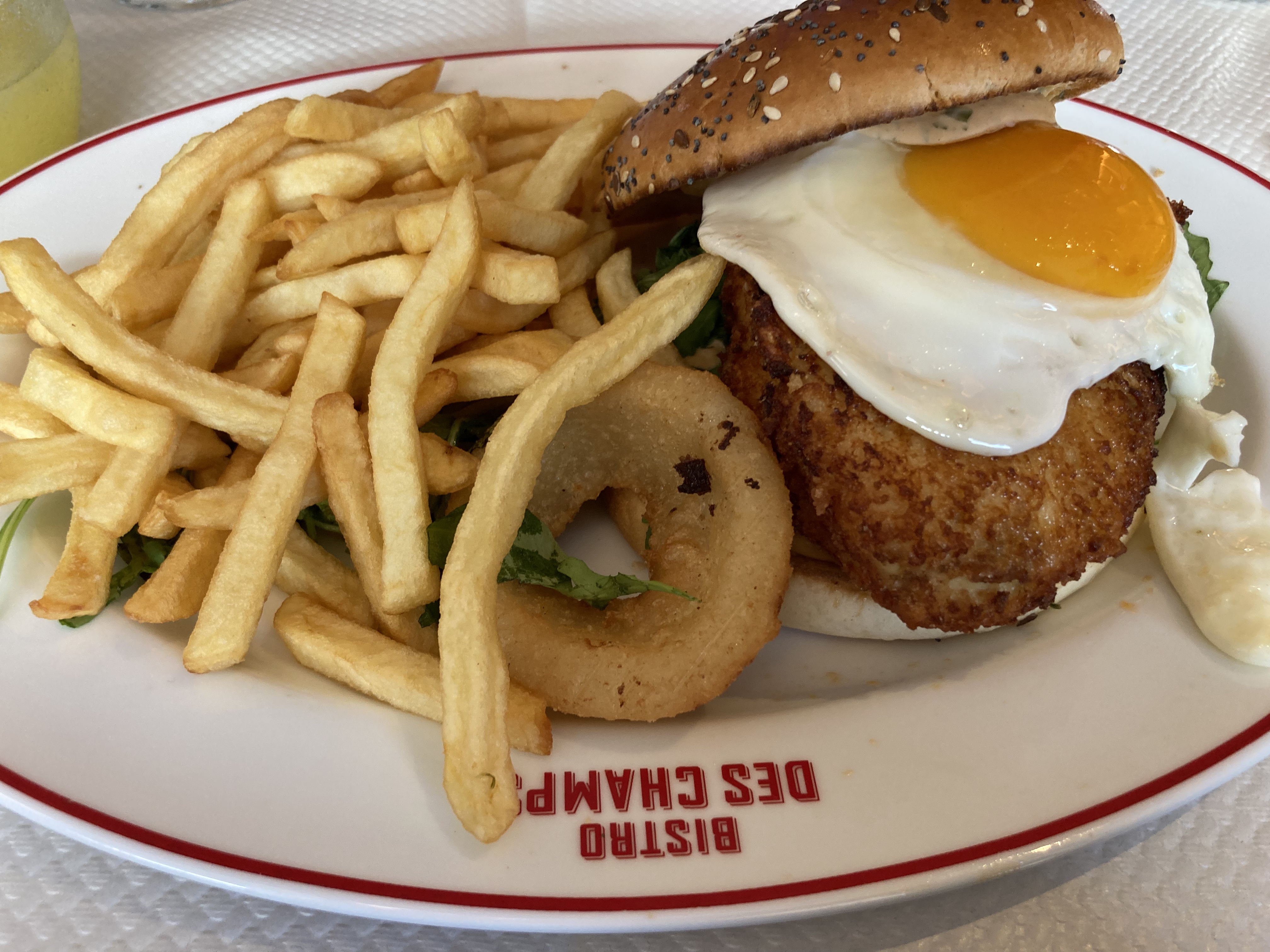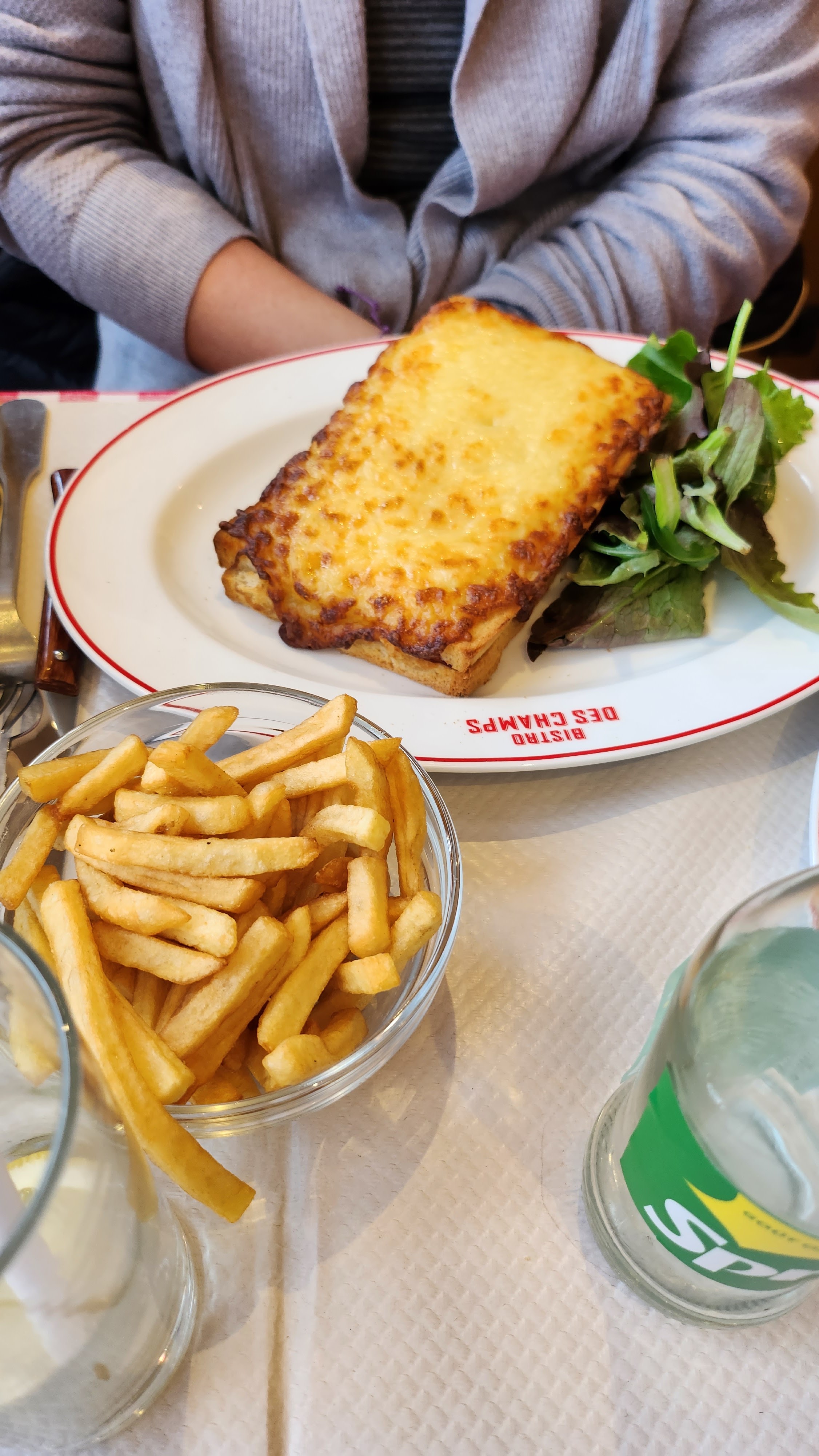 Nous hésitons entre fast food et le bistro des champs. Nous aurions dû aller au fast food. Frites congelées et mal cuites. Pas d'accompagnement végétal avec le steak. Croque monsieur au pain de mie écoeurant