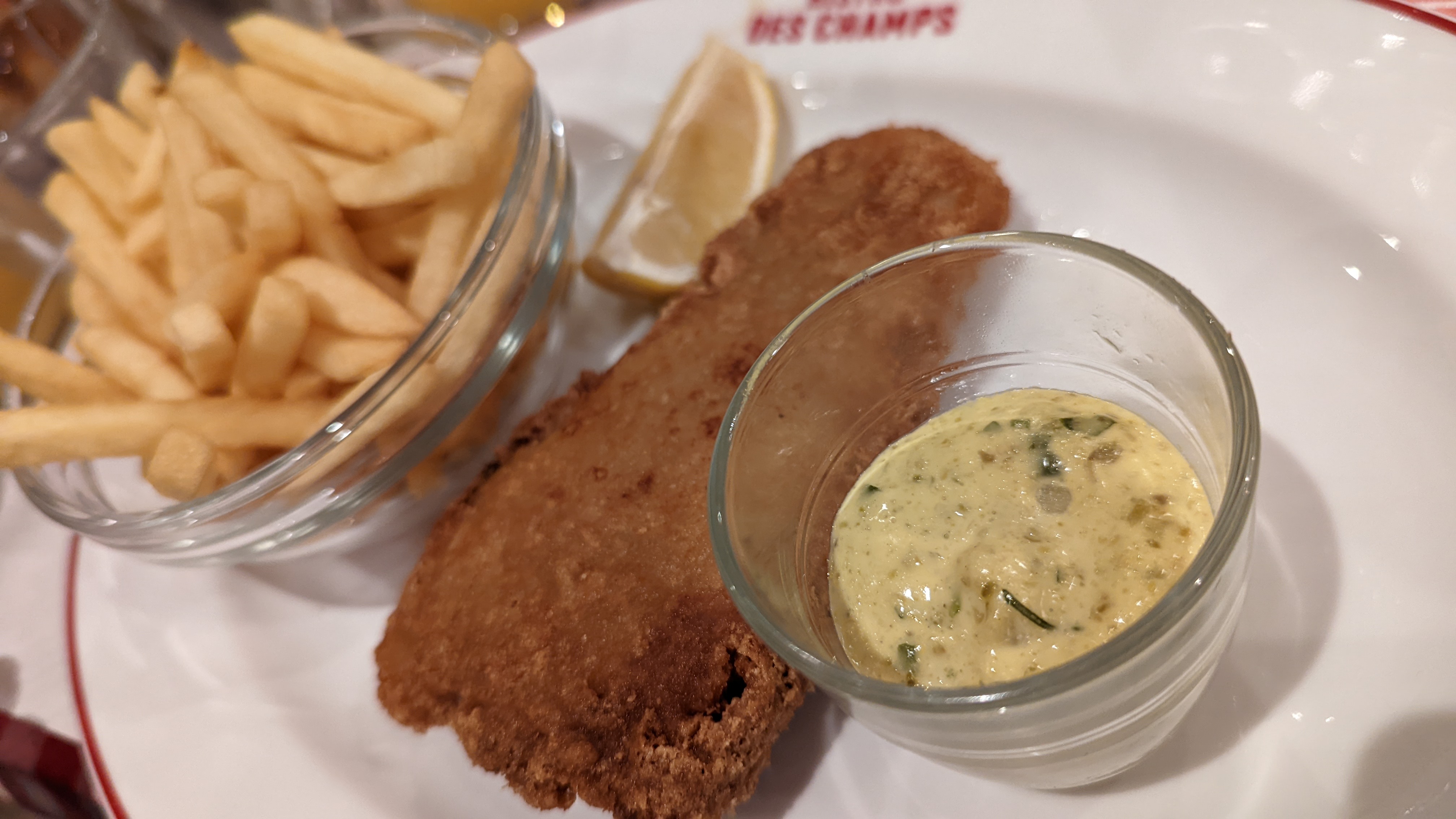 Si vous voulez manger du surgelé a un prix de lux c'est l'adresse qu'il faut! 19€50 un filet de poisson pané congelé et des frites surgelés une honte.....serveuse sympa et quand on lui a fait la réflexion ( poliment ce n'est pas elle qui cuisine et décide) elle est devenu très désagréable et nous a jeté l'addition sur la table au bout de 10min . Ou il a fallu attendre autant pour payer. Ni fait ni a refaire ! N'a pas sa place sur les champs Elysées ! Attrape touristes !
