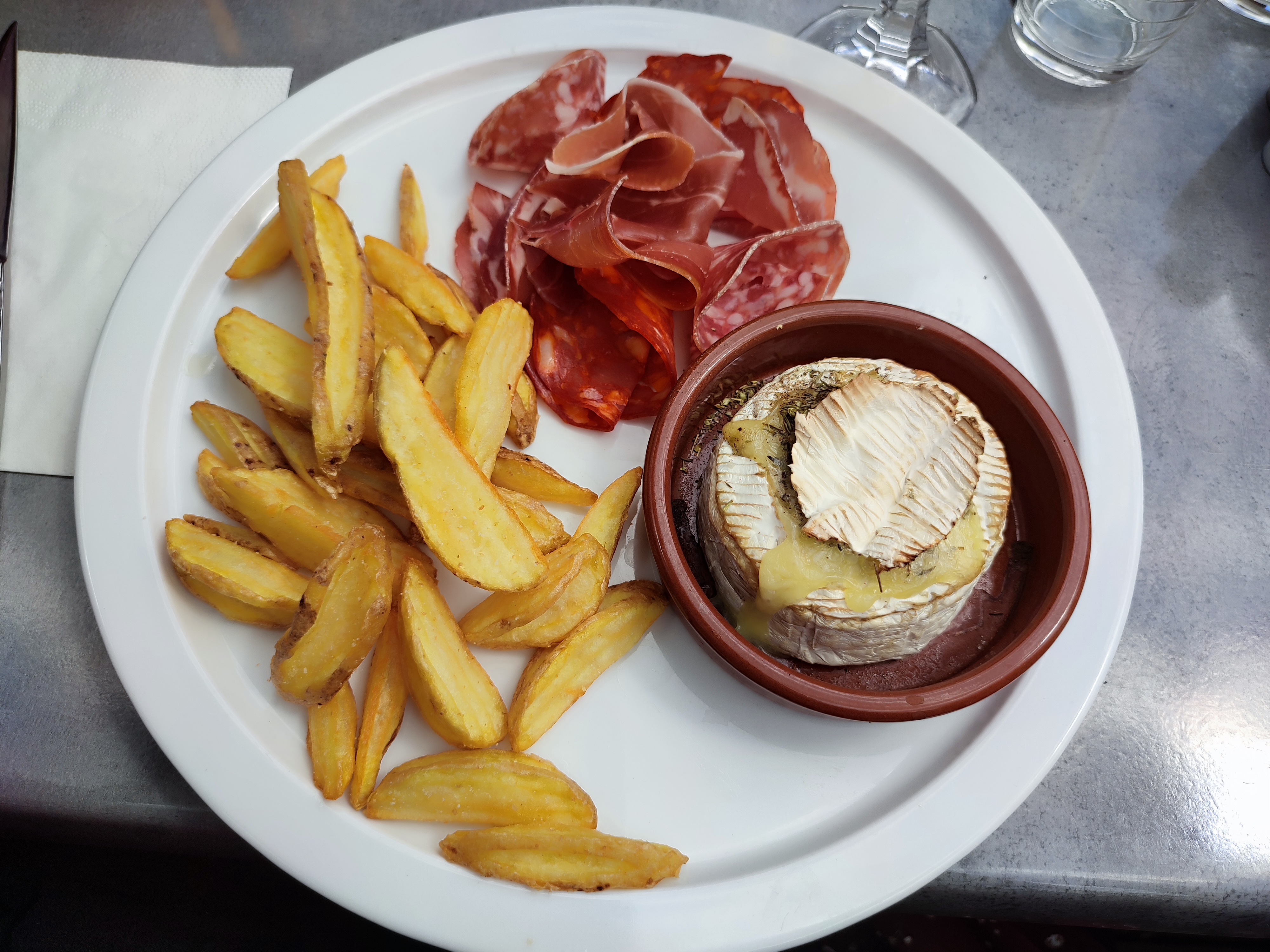 Accueil sympathique, cuisine trop simple ! Un cornichon et une feuille de laitue dans une assiette de charcuterie serait un plus. Croque monsieur mal cuit à 5,50€ Et 2.80€ de supplément pour remplacer la salade par des frites pour un enfant de 4 ans !! 🙏 Attention la rentabilité à des limites !