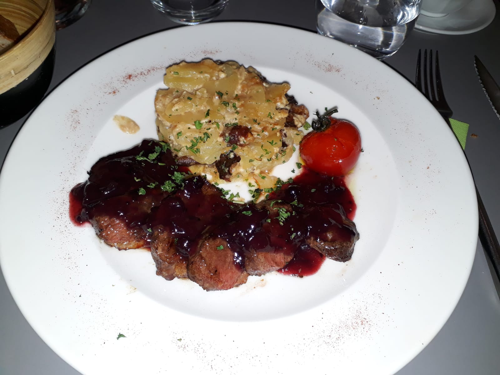 Accueil moyen.. Table pas encore nettoyé.. Rizzoto sec et le jambon de parme dur comme du bois et trop epais.. Le dessert un tiramisu vraiment passable ,dessous liquide ,mascarpone fade et le pompon saupoudré de chocolat en poudre type nesquik ...et les 2 ptites chose qui manque et je trouve dommage.. Pas de petites choses a grignoté avec l apero et le fait de ne pas avoir le meme serveur tout le long du repas 3 differents et ils avaient l air dépassé..
