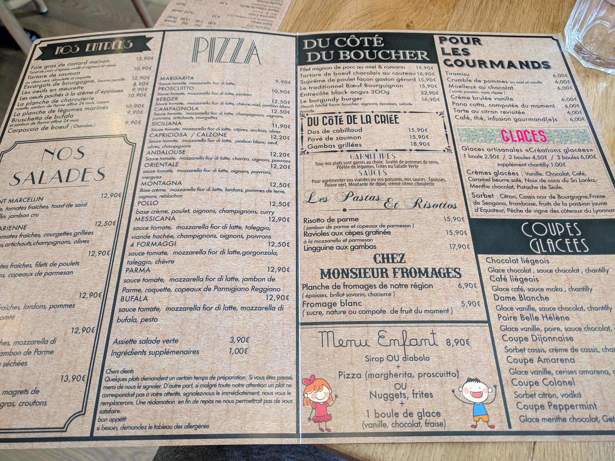 Arrivé à 7 un lundi soir (5 adultes et 2 enfants) Apero maison servi pas frais. Mais ce n est pas le plus grave. Lors de la commande de l apero prise de commande pour repas des enfants (6 et 3 ans) nugets frites. Nous avons eu le temps de boire l apero et nous avons été servi avant les enfants malgré 3 relances et une commande prise lors de l apéritif. Être servis avant les enfants et attendre 10 min pour voir leurs plats arrivés est honteux ... Commentaire sur les plats : -salade caesar, salade fatiguée... Que je n oserait jamais servir chez moi, en quantité digne d'une entrée plutôt que d'un plat .... Malgré le prix. - salade Saint Marcellin très légère idem malgré le prix -poulet Gaston Gérard sec avec un dé à coudre de sauce. Pour des nugets enfants et des frites rien à redire. En conclusion aucune excuse: ils ont offert les plats enfants mais au vu du résultat pour un repas famille... Nous avons changé de resto pour le dessert sans que cela chagrine les employés... Je ne recommande pas du tout le resto ...