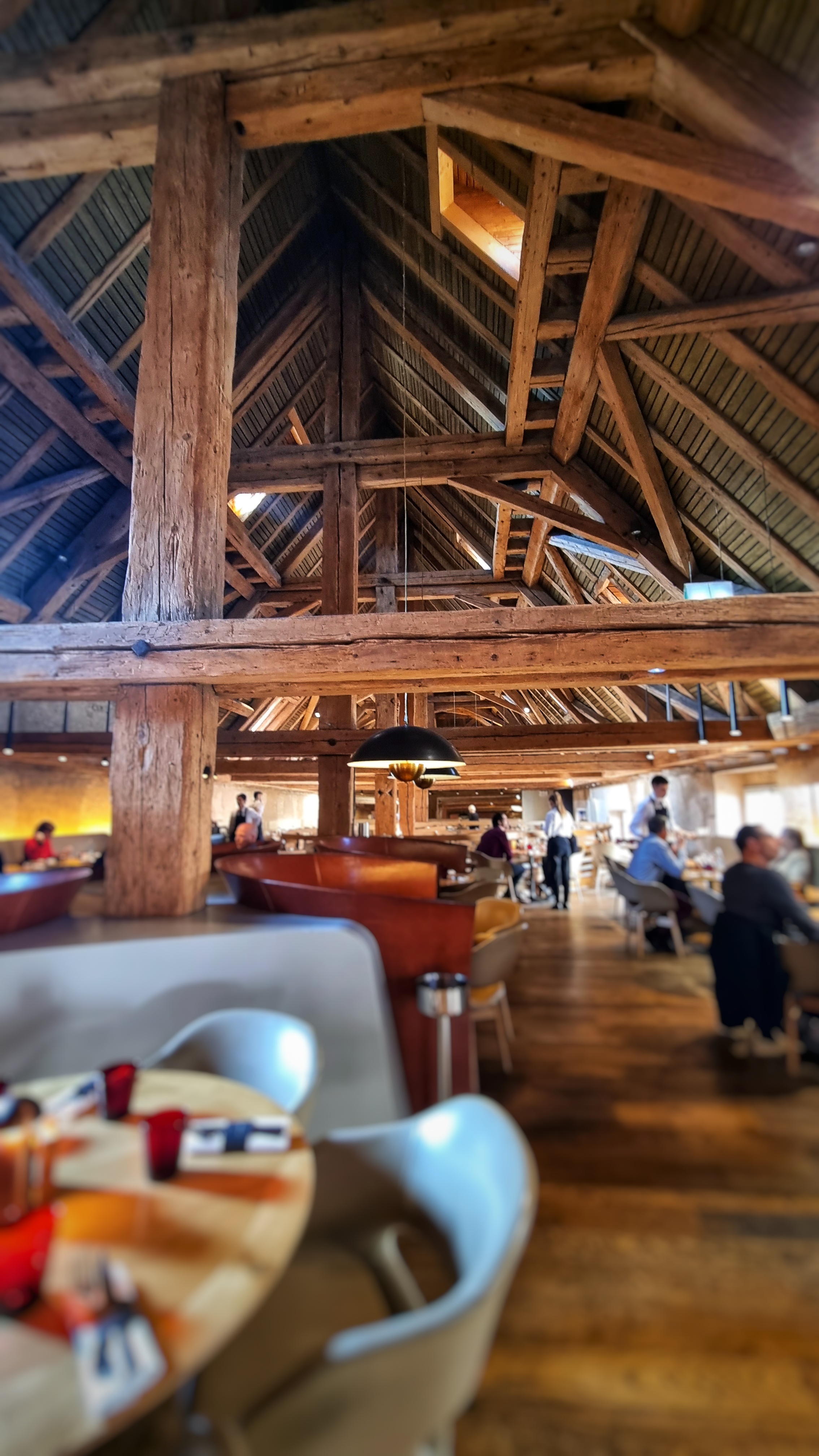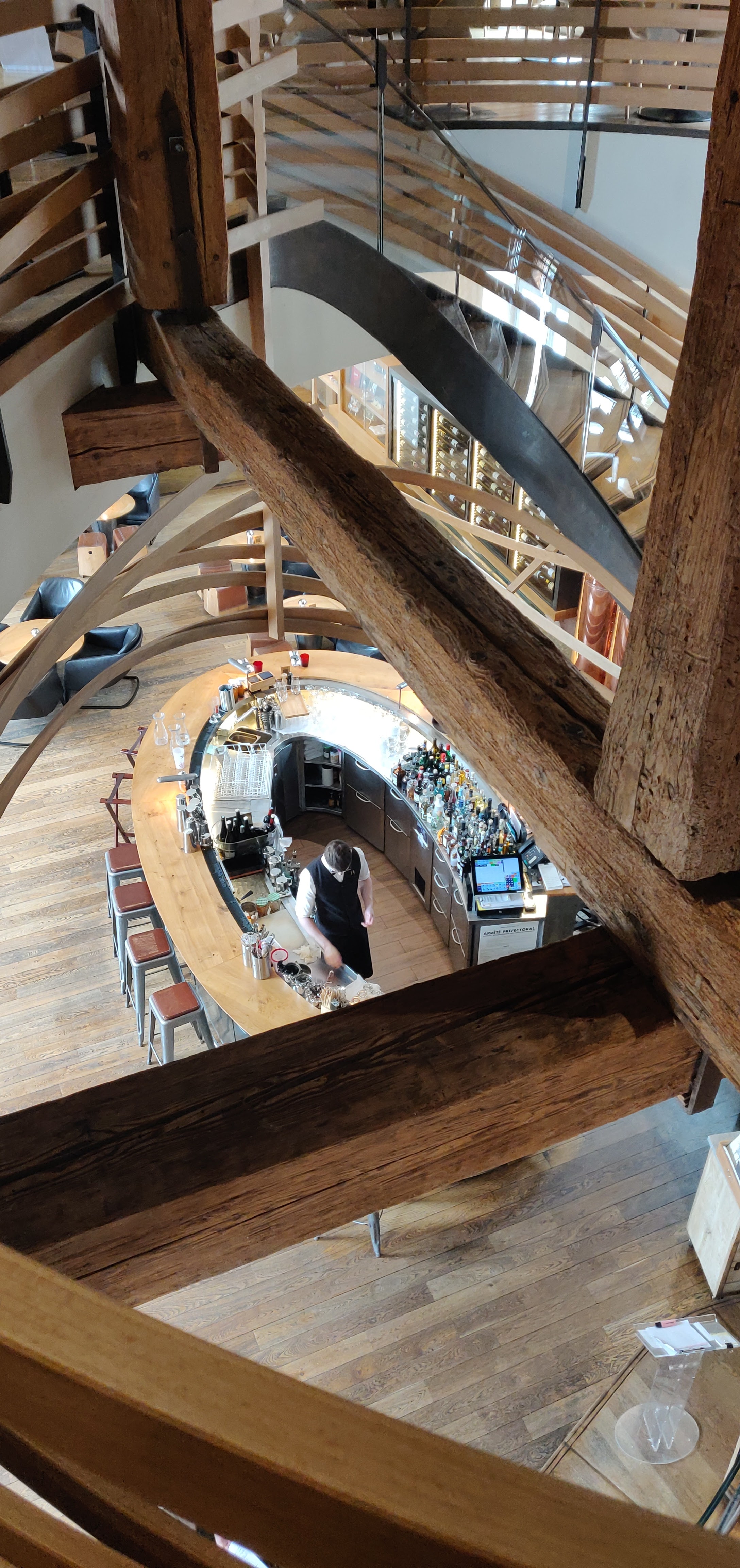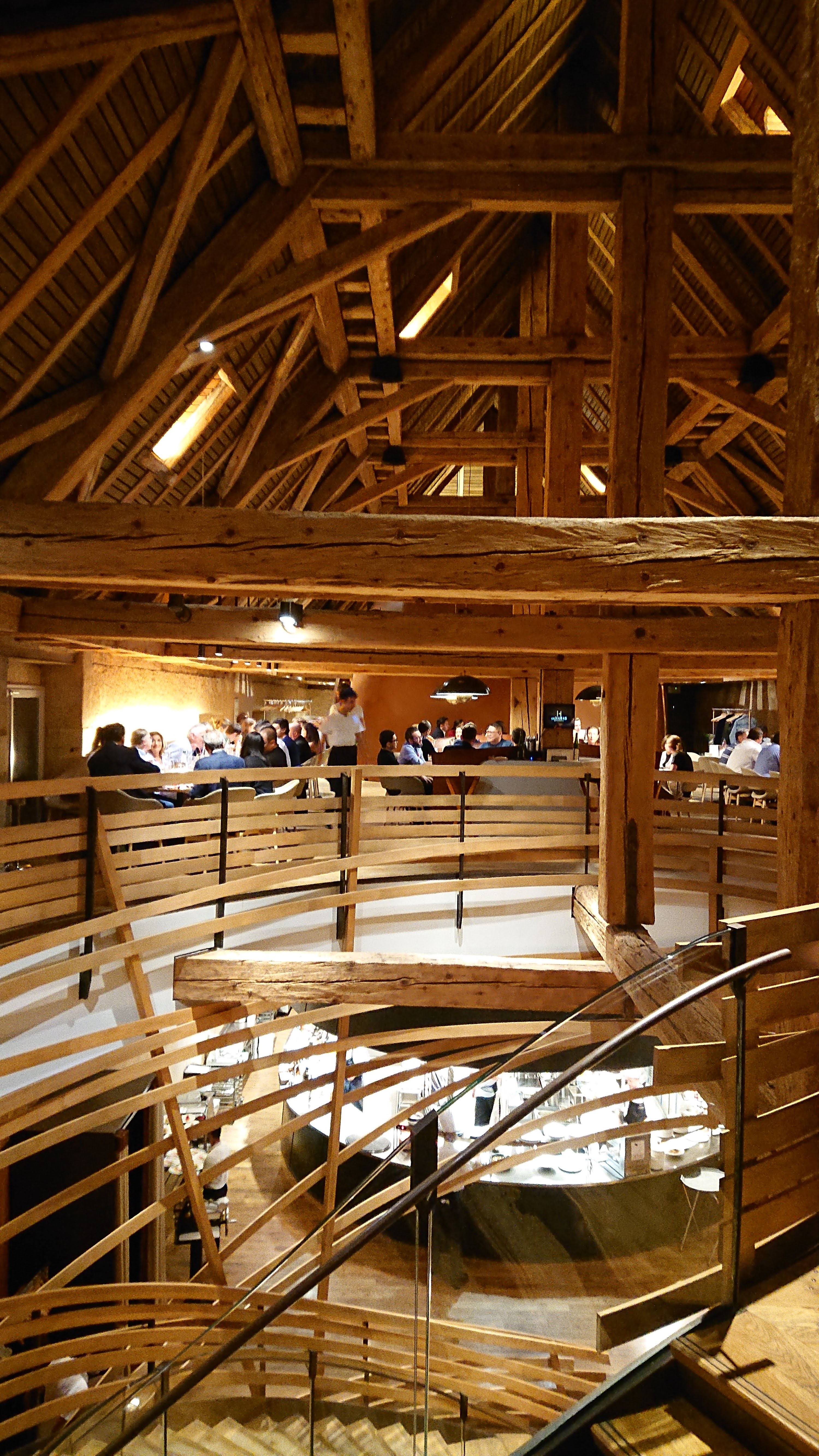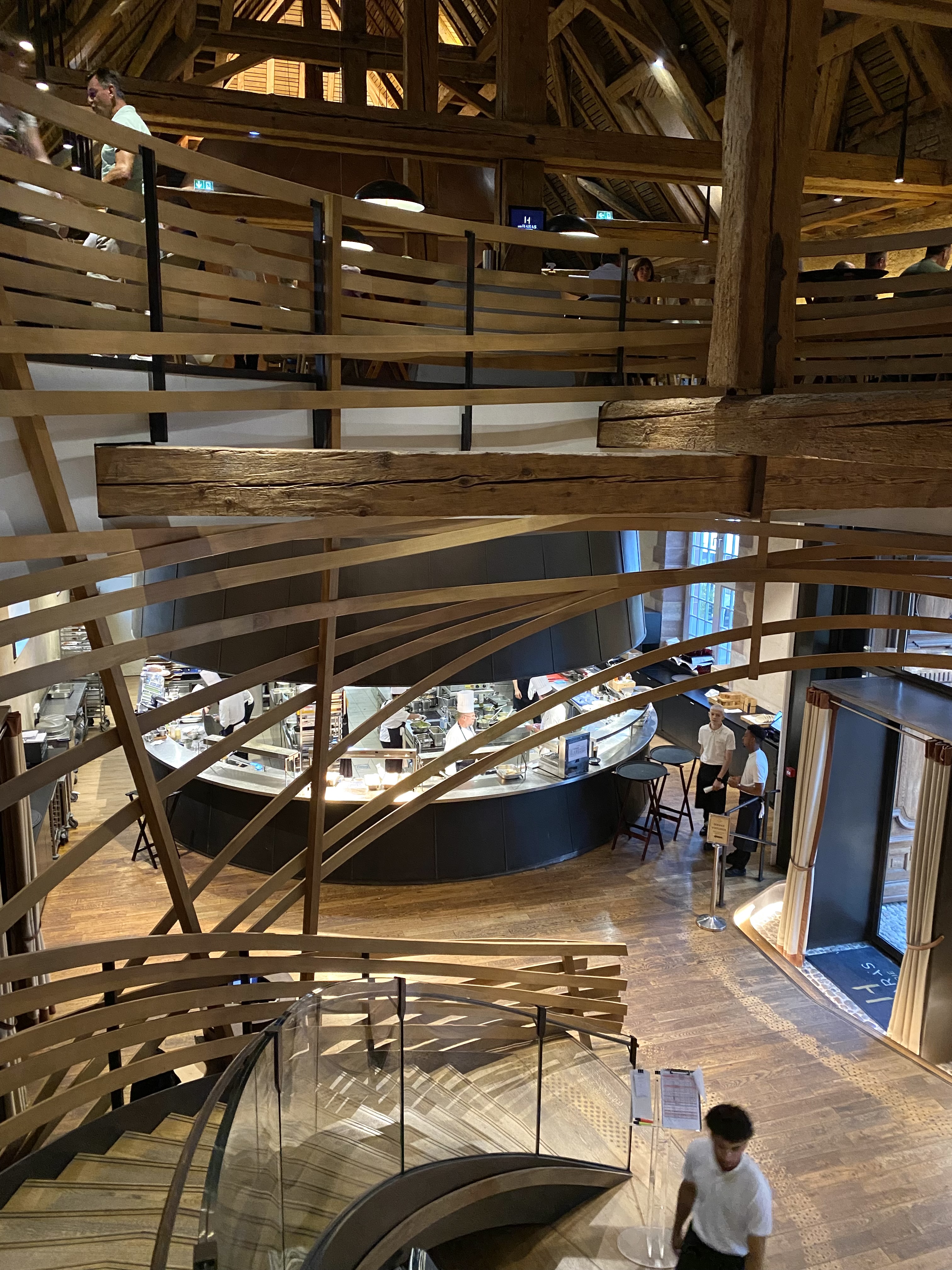 Très beau cadre, j’étais au premier étage au fond et j’ai bien pu admirer le ballet des serveurs et la charpente du bâtiment