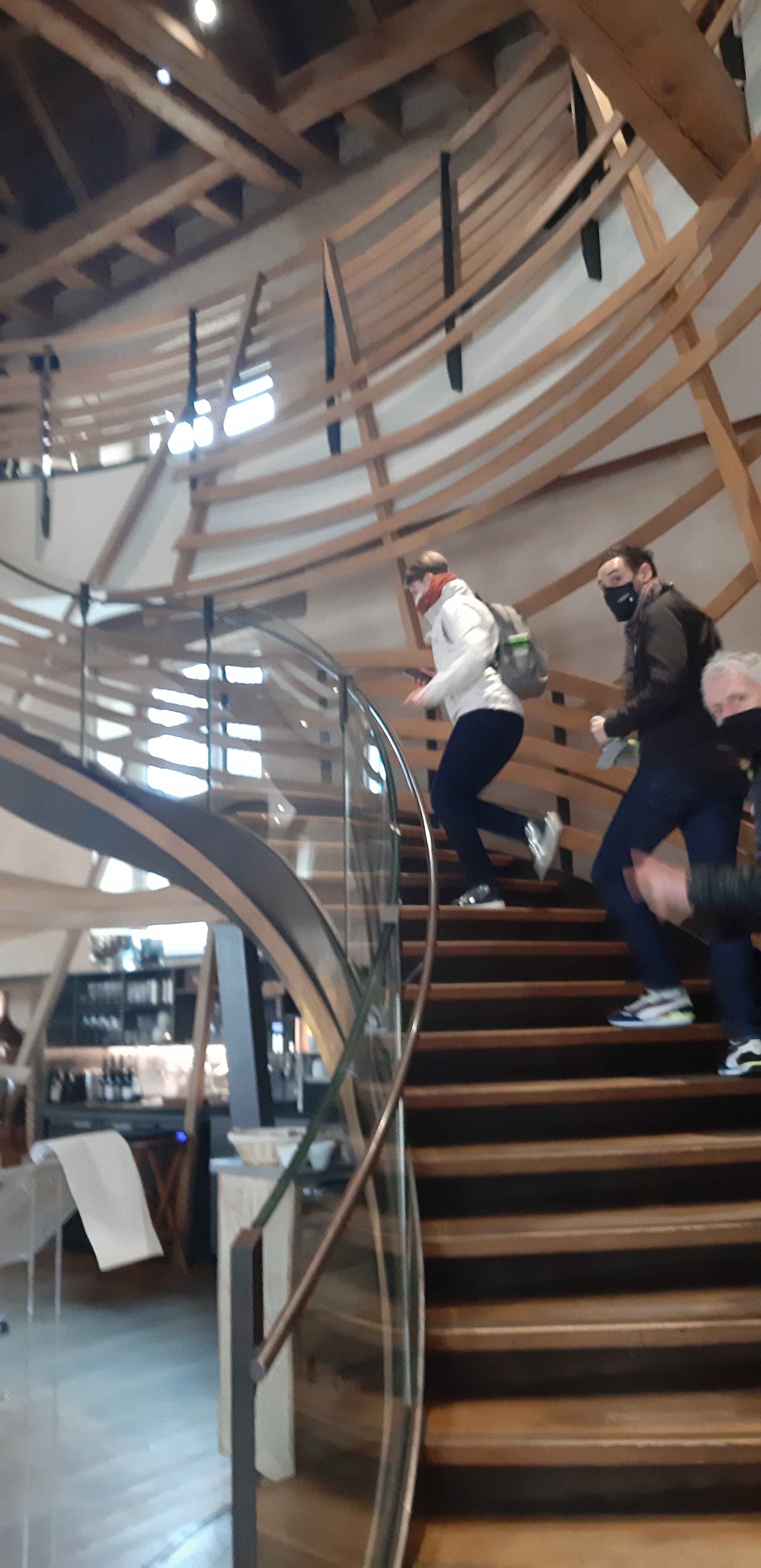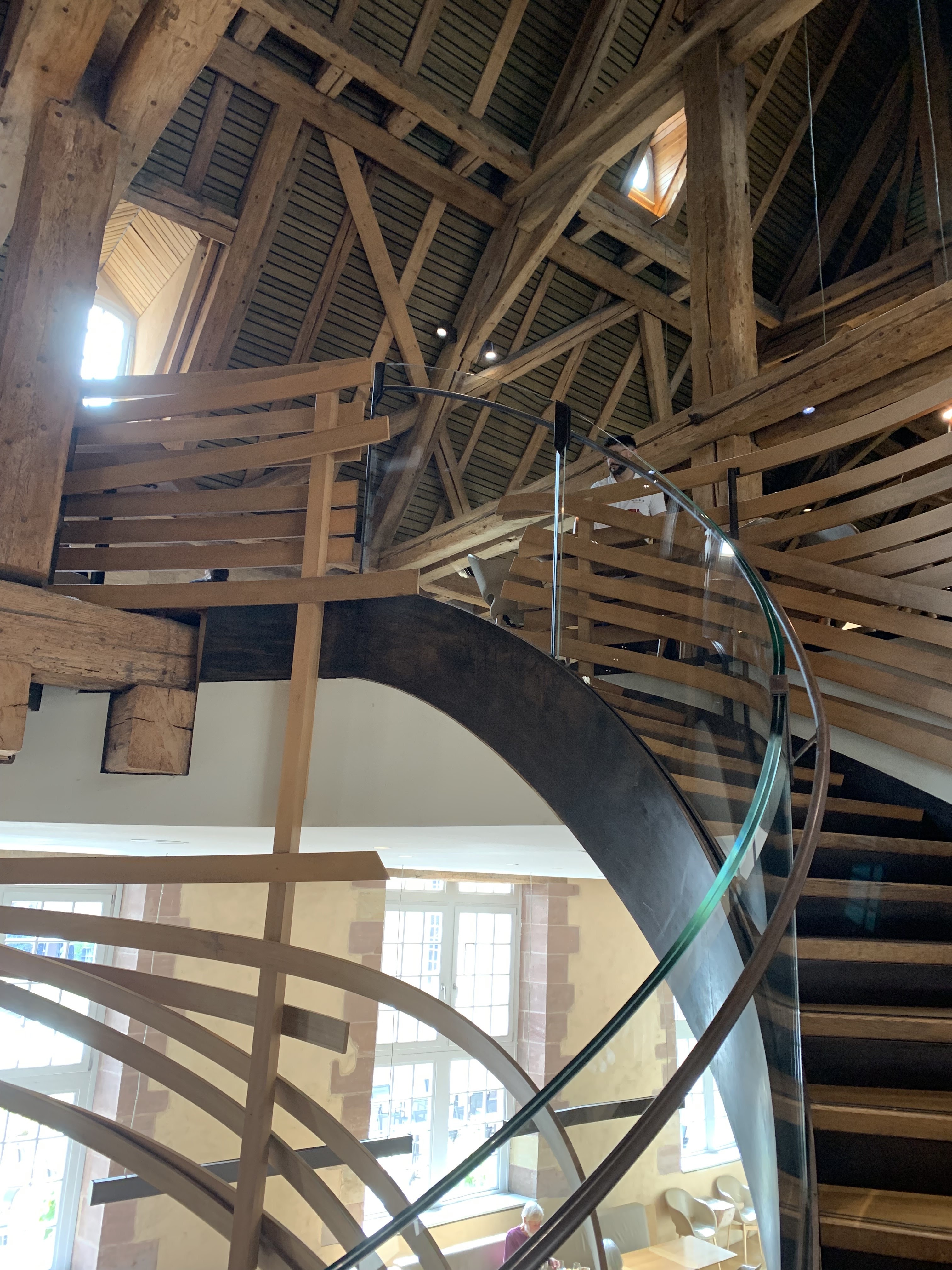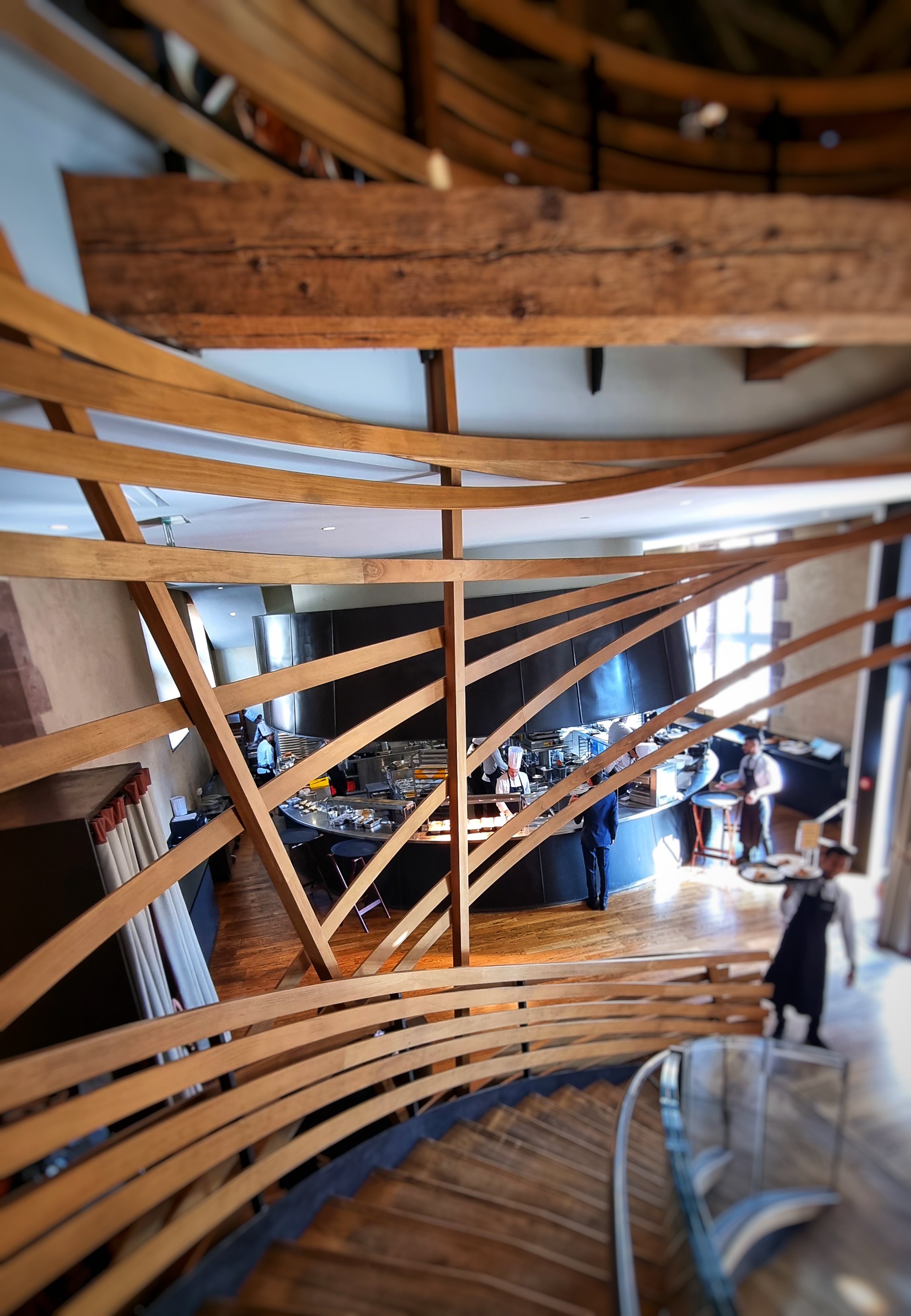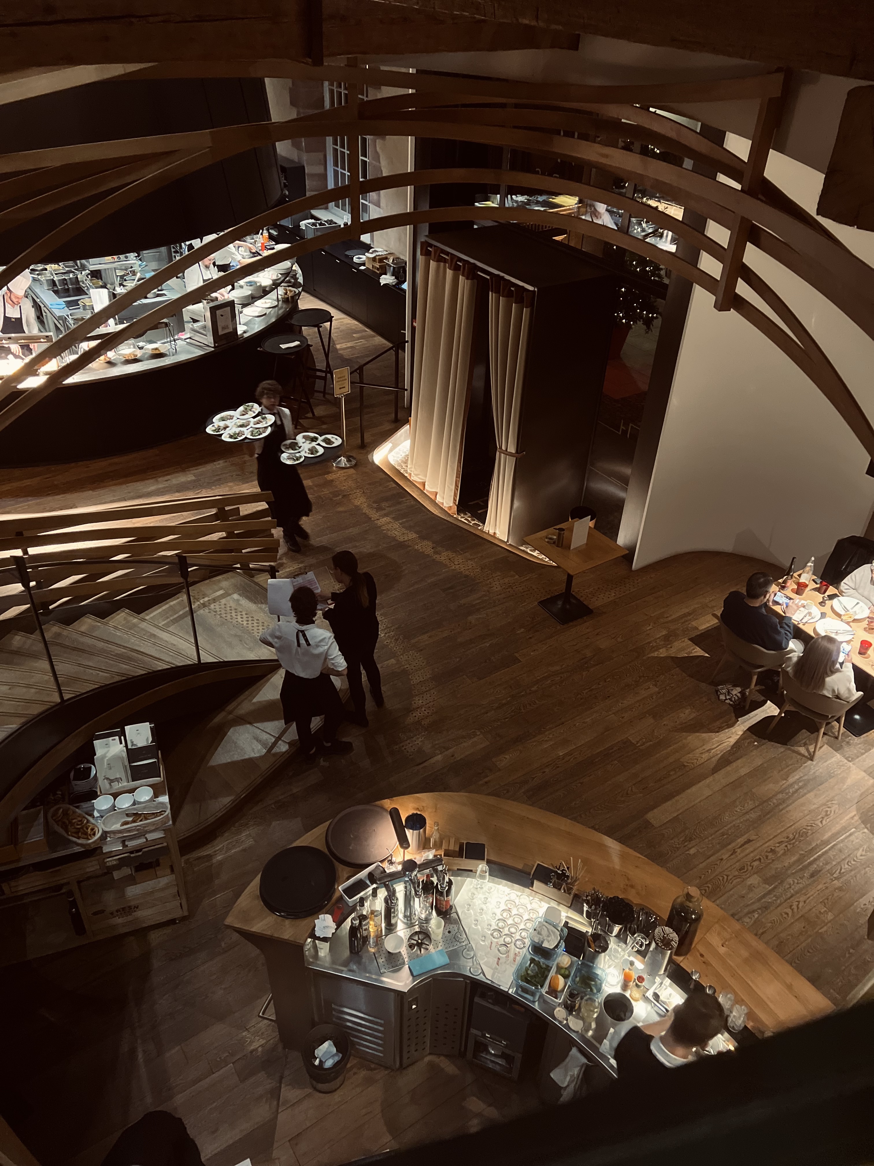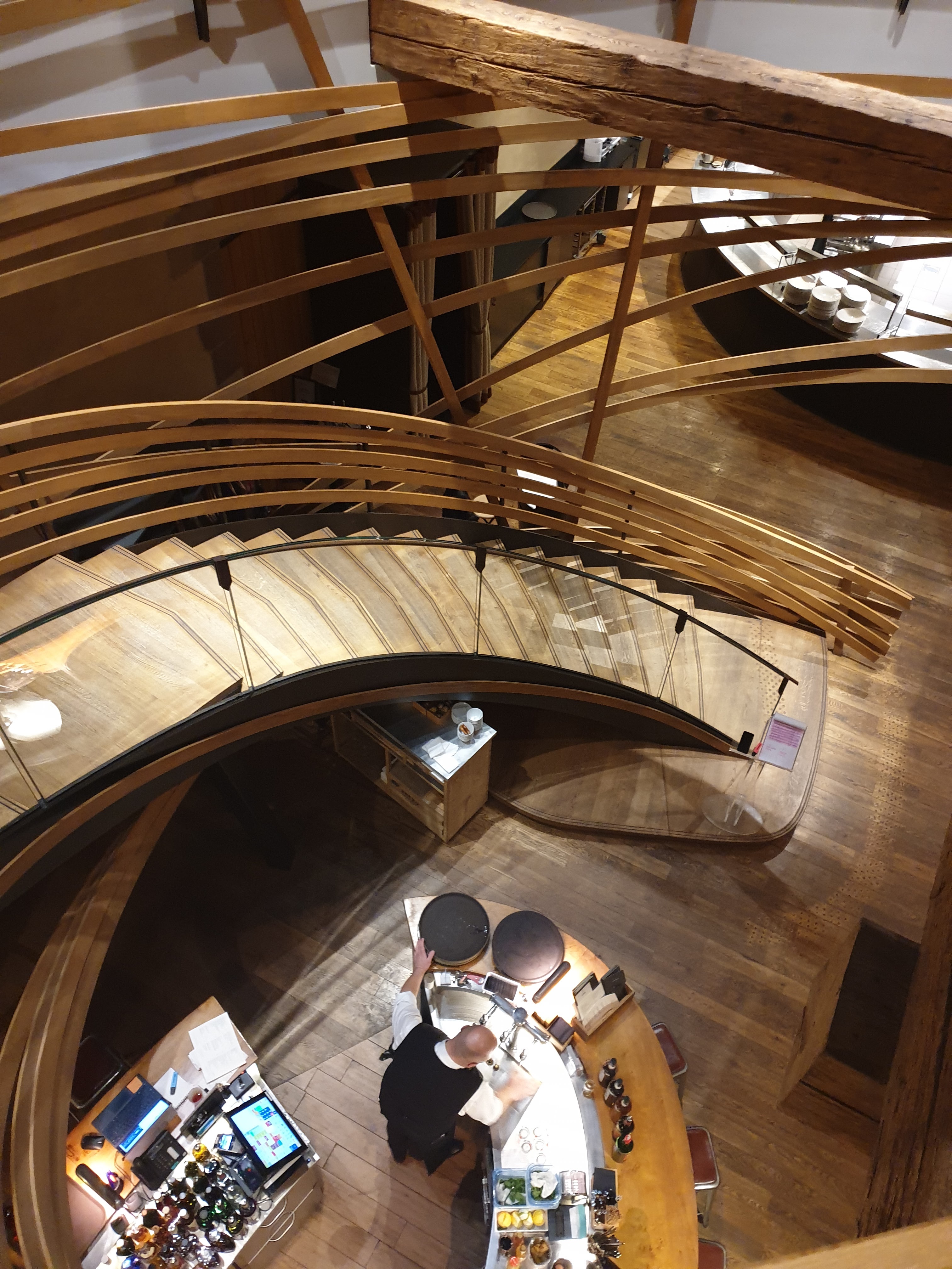 Très beau cadre, j’étais au premier étage au fond et j’ai bien pu admirer le ballet des serveurs et la charpente du bâtiment
