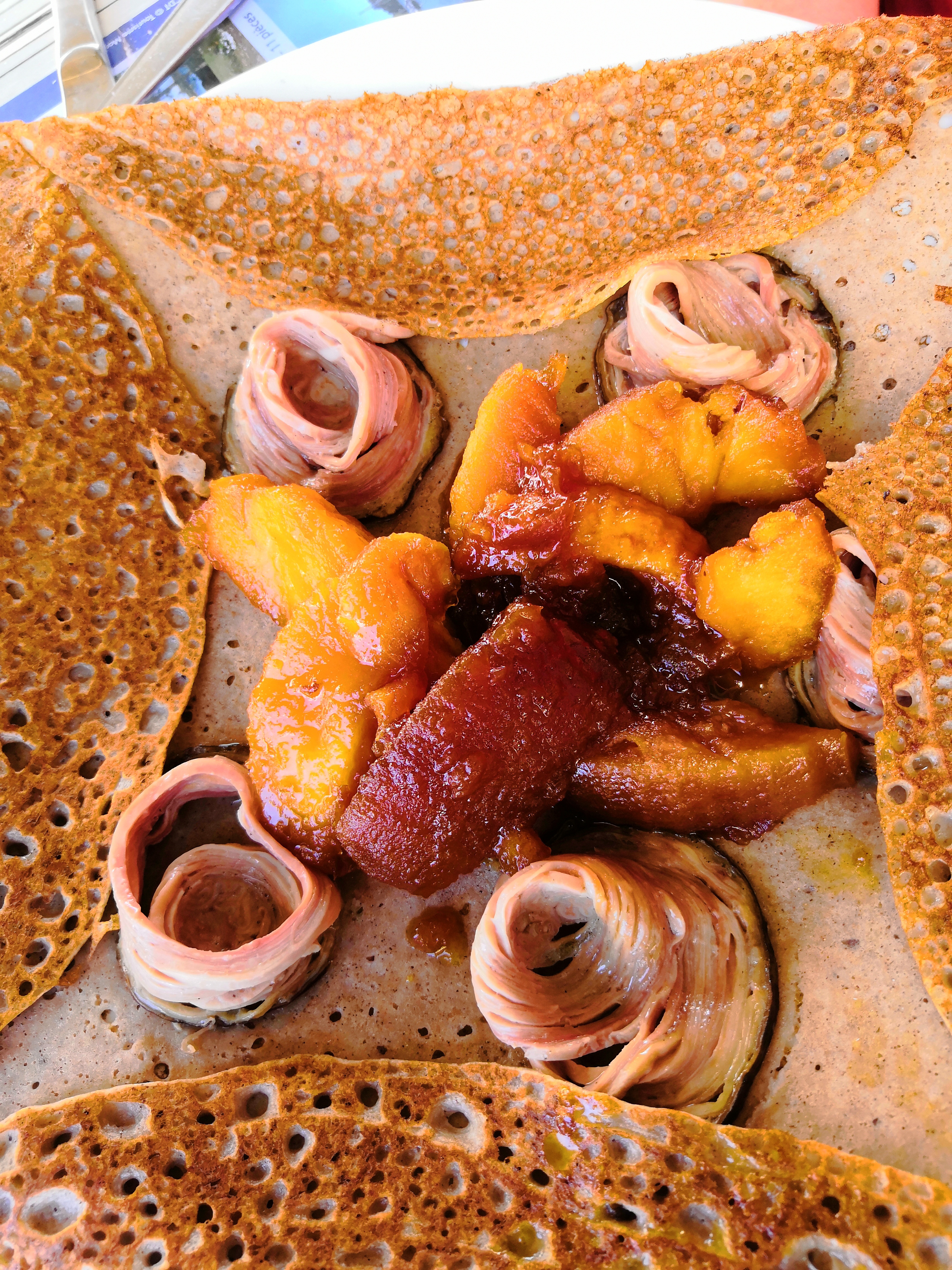 Galette super complète andouille : un délice gourmand qui sent bon la Bretagne avec une petite vue sur la port de plaisance immergé au soleil. Le cidre coule tout seul avant d'attaquer la classique galette beurre salé !