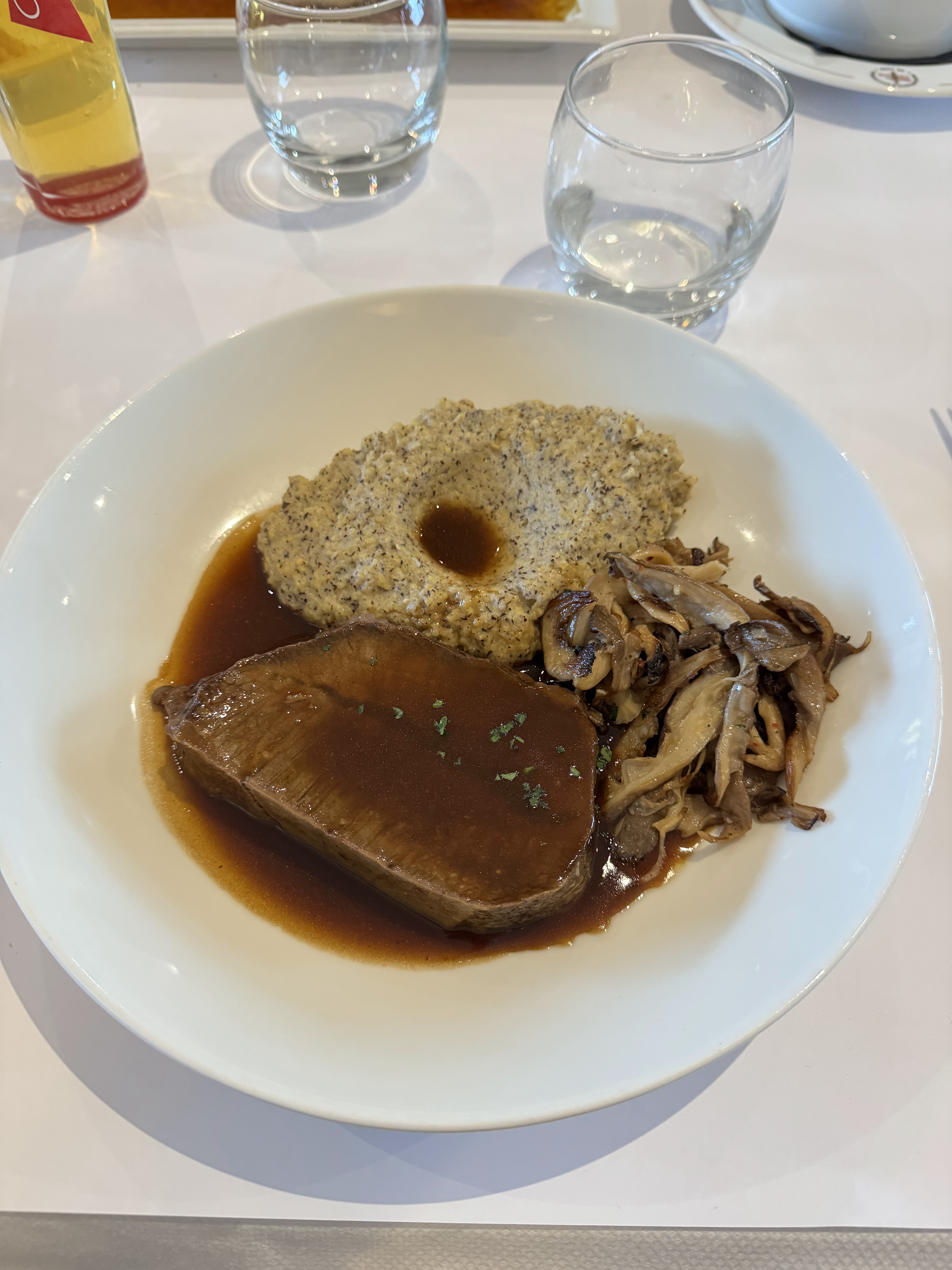Le plat du jour (poisson ) sur écrasé de 🥔 très fin un vrai délice. Par contre les desserts très décevants. Le fondant au chocolat trop réchauffé donc très sec et pas du tout coulant, heureusement qu’il y avait la boule de glace. Quand à la meringue très volumineuse mais là aussi rien d’extraordinaire … dommage!!!