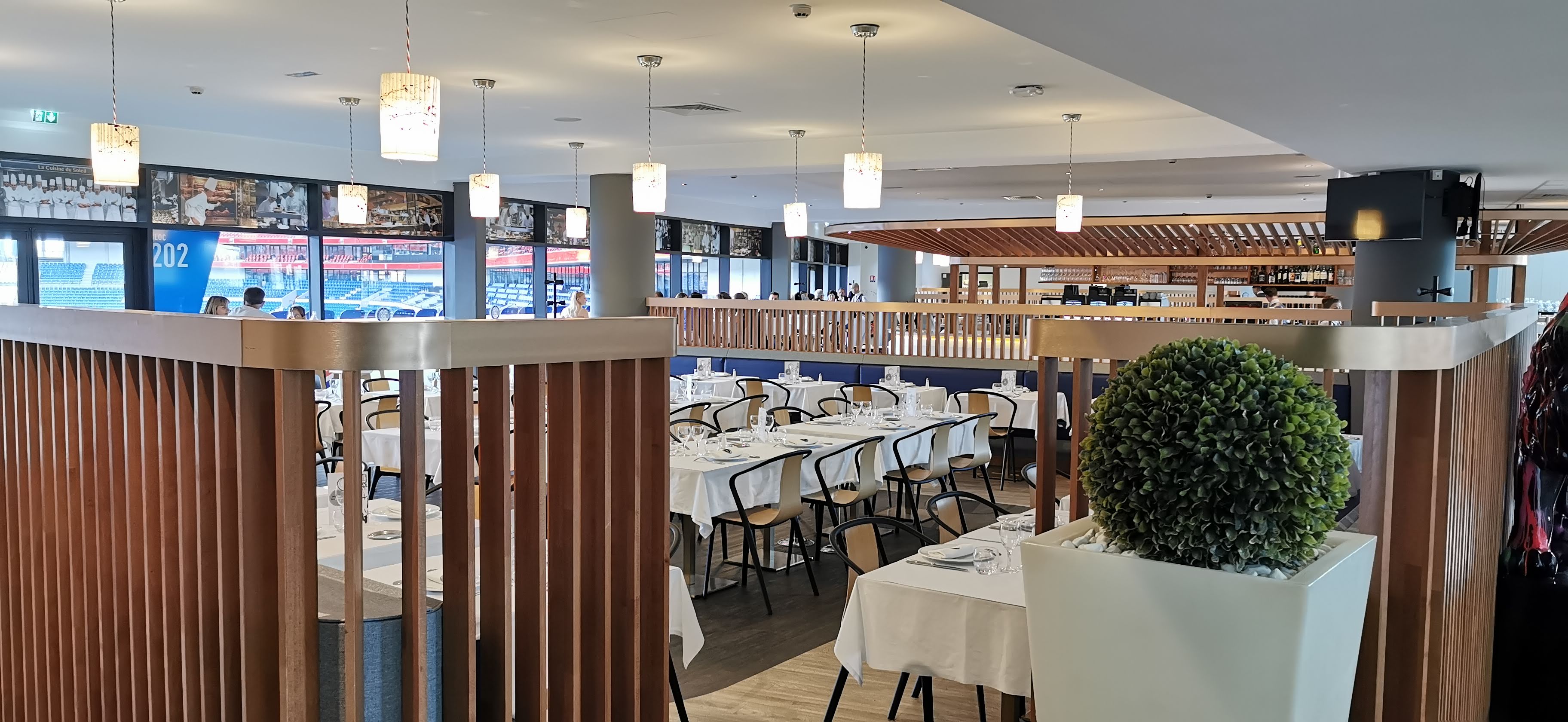 ❝ Hauteur sous plafond, nappes blanches et cadre contemporain pour cette brasserie installée dans le stade. ❞