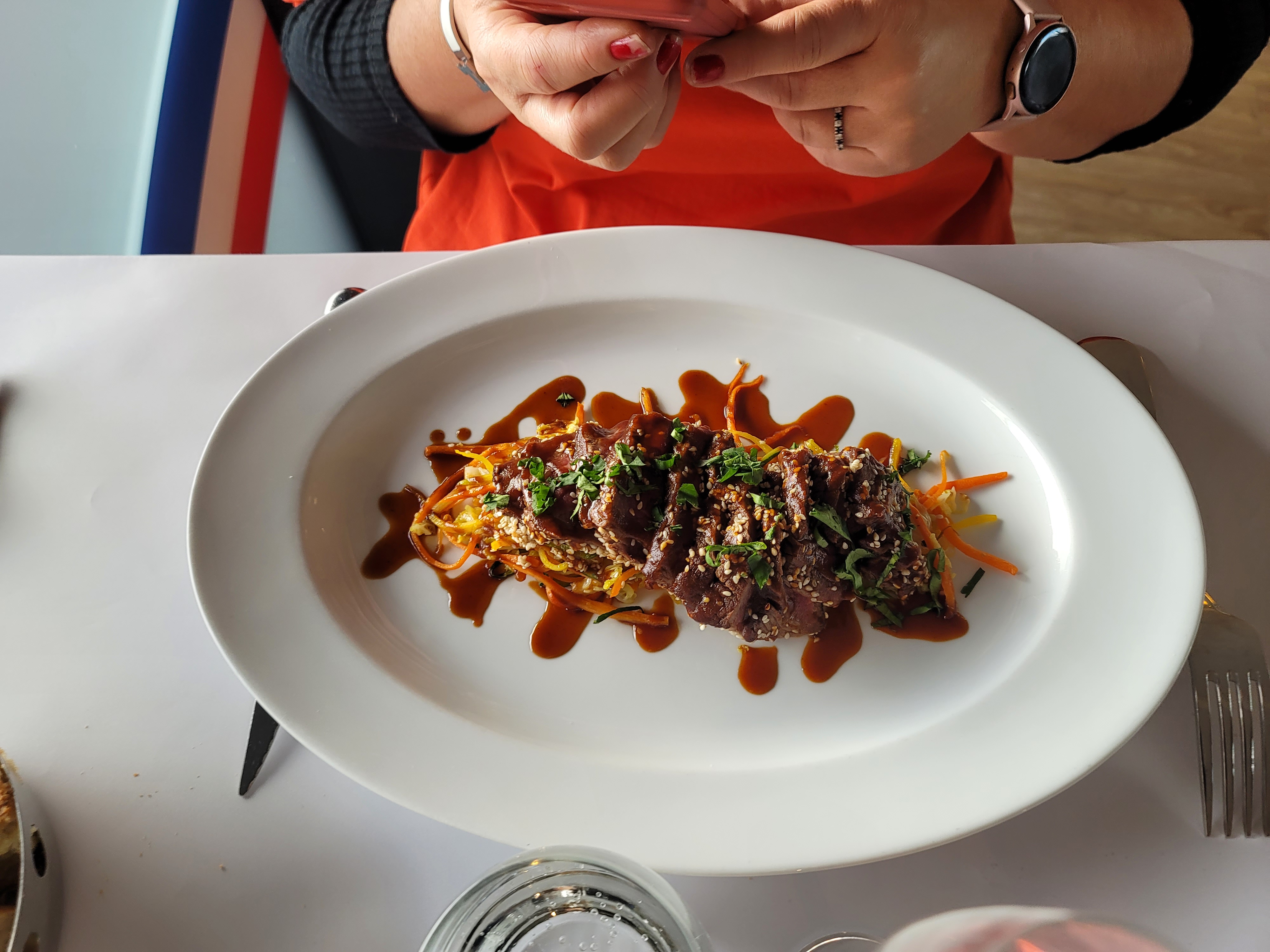 Le repas était délicieux. Le seul bémol serait le service. Le serveur n'a pas apprécié qu'on lui fasse remarquer qu'il ne m'avait pas servie, une fois chose faite, il ne m'a pas servie ce que j'avais demandé. Nous avons donc demandé à ce qu'il m'apporte ce qu'on avait commandé... Et plusieurs l'on entendu faire un commentaire très désagréable à mon encontre. Pas très professionnel... C'est dommage.