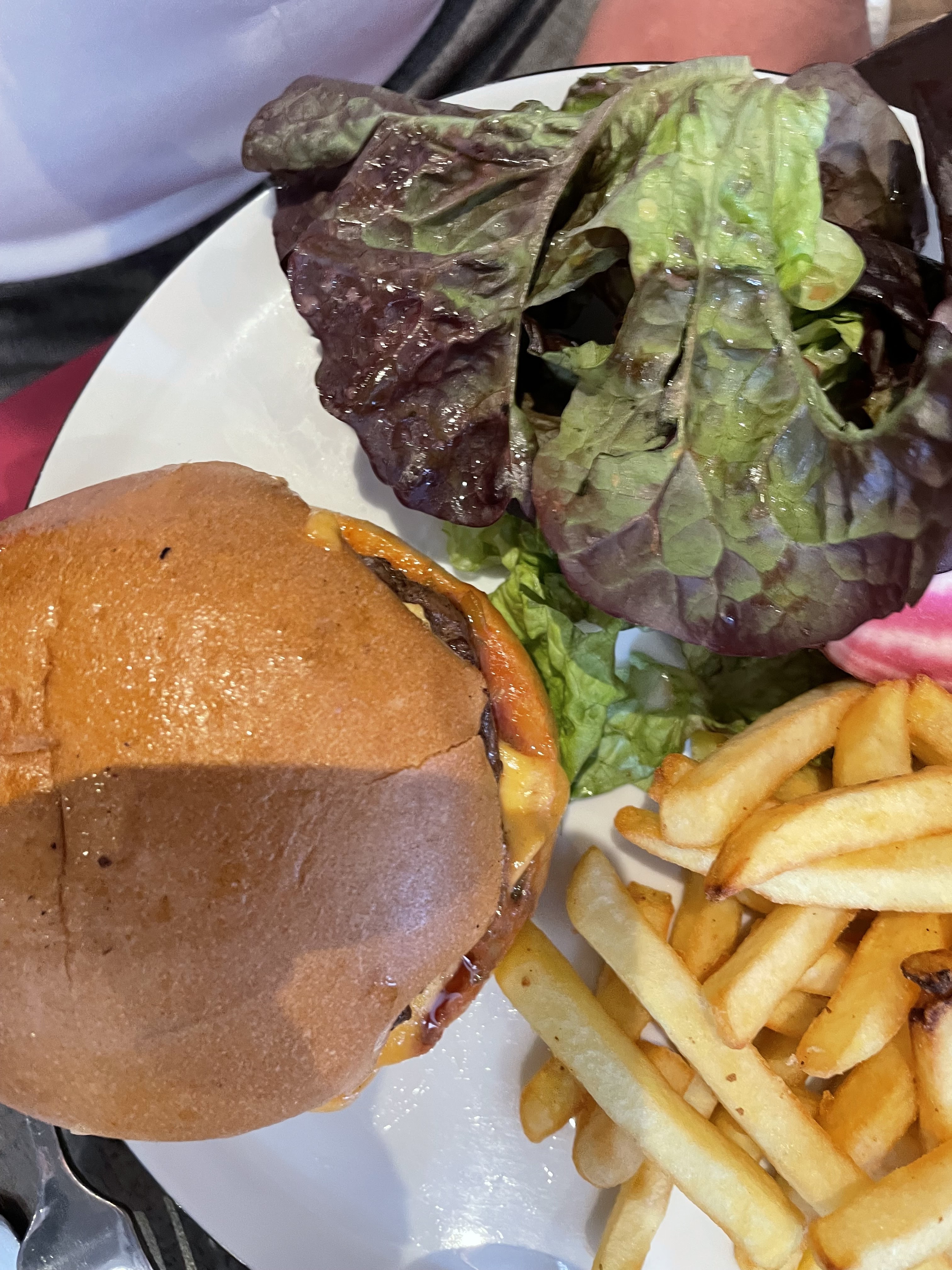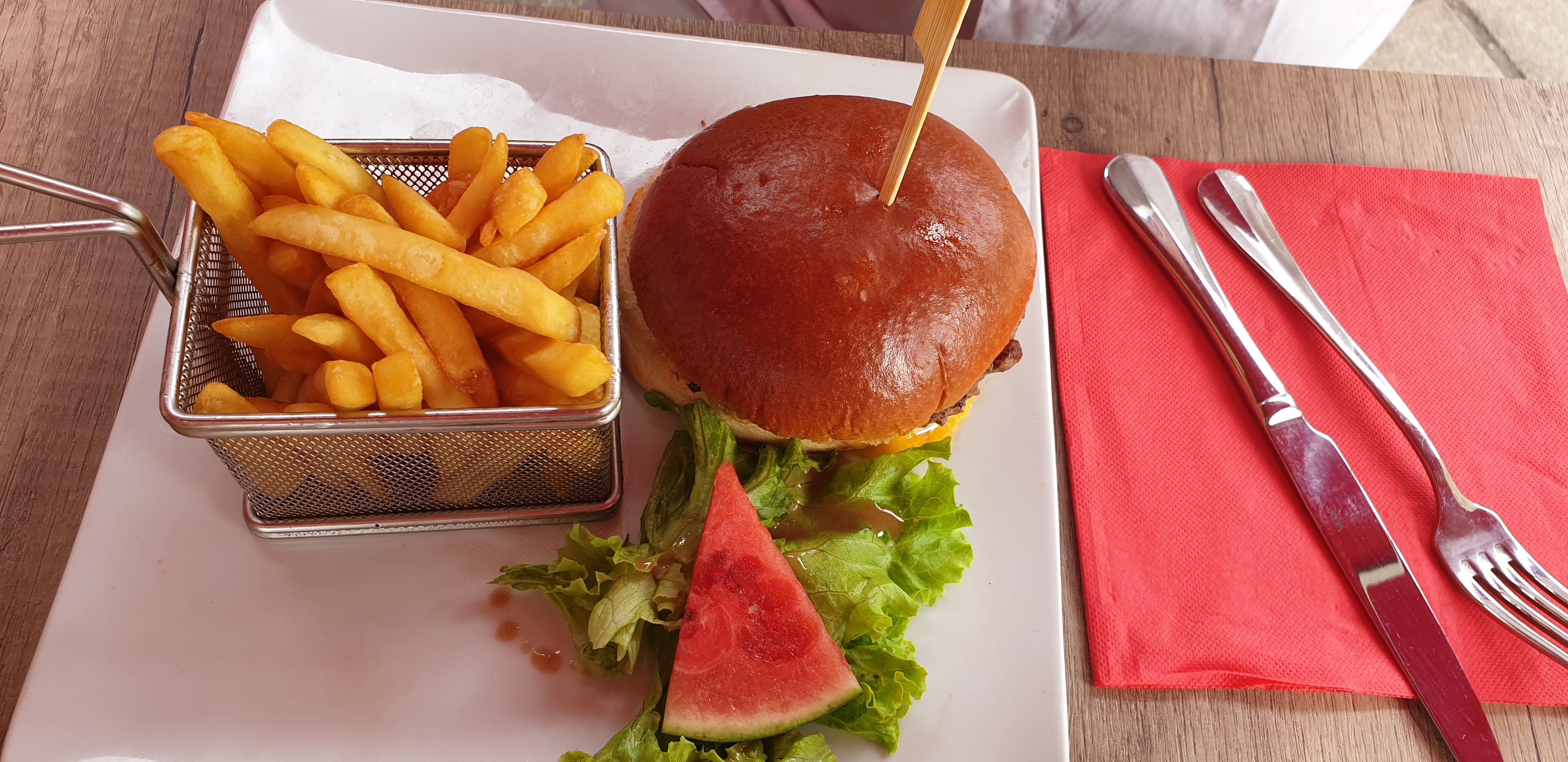 Extrêmement déçu Je ne sais pas si c'est l'effet pleine saison mais pas de pain.. En restauration on envoie quelqu'un en acheter directement... Surtout quand la boulangerie est à 5m Viande 50%de gras . Demi barquette de frites hors saison c'était pas comme sa...