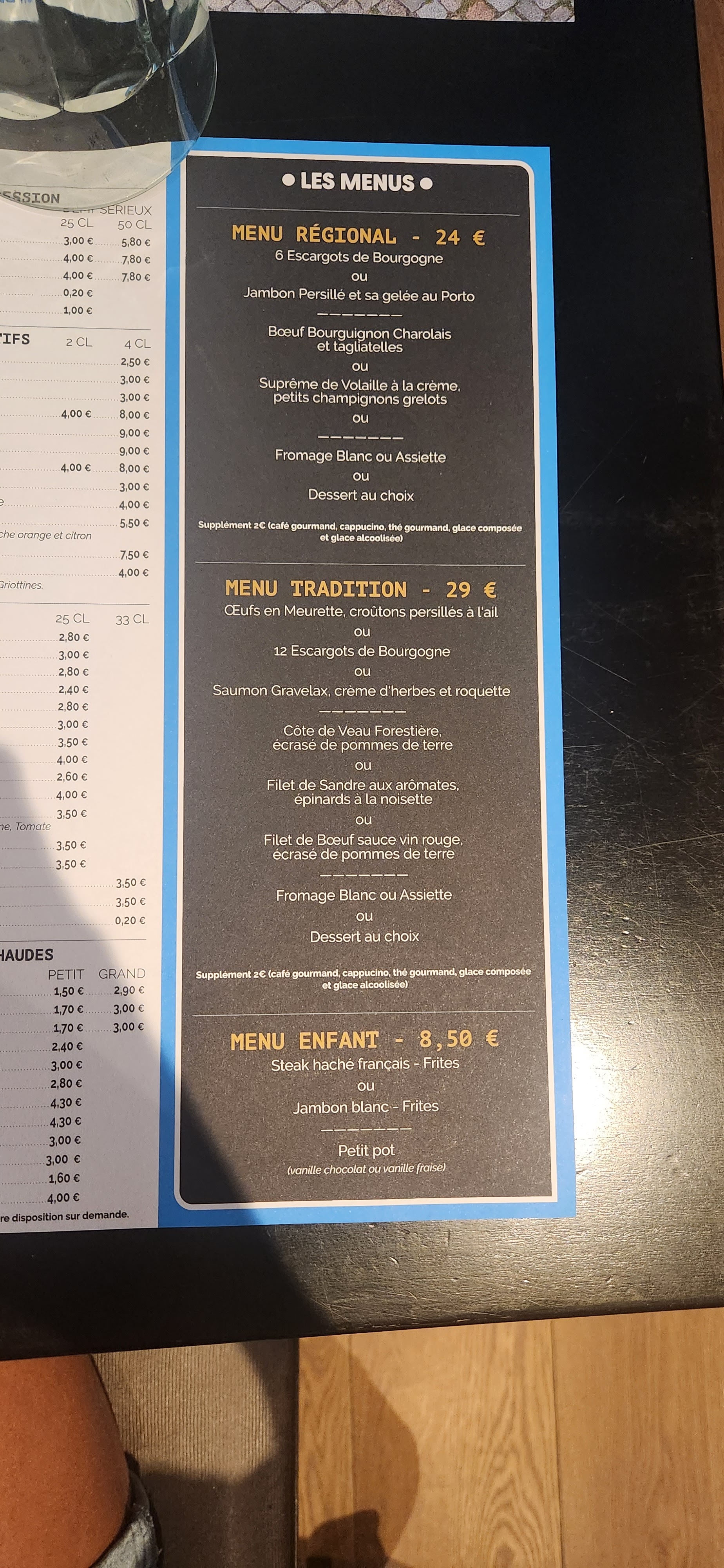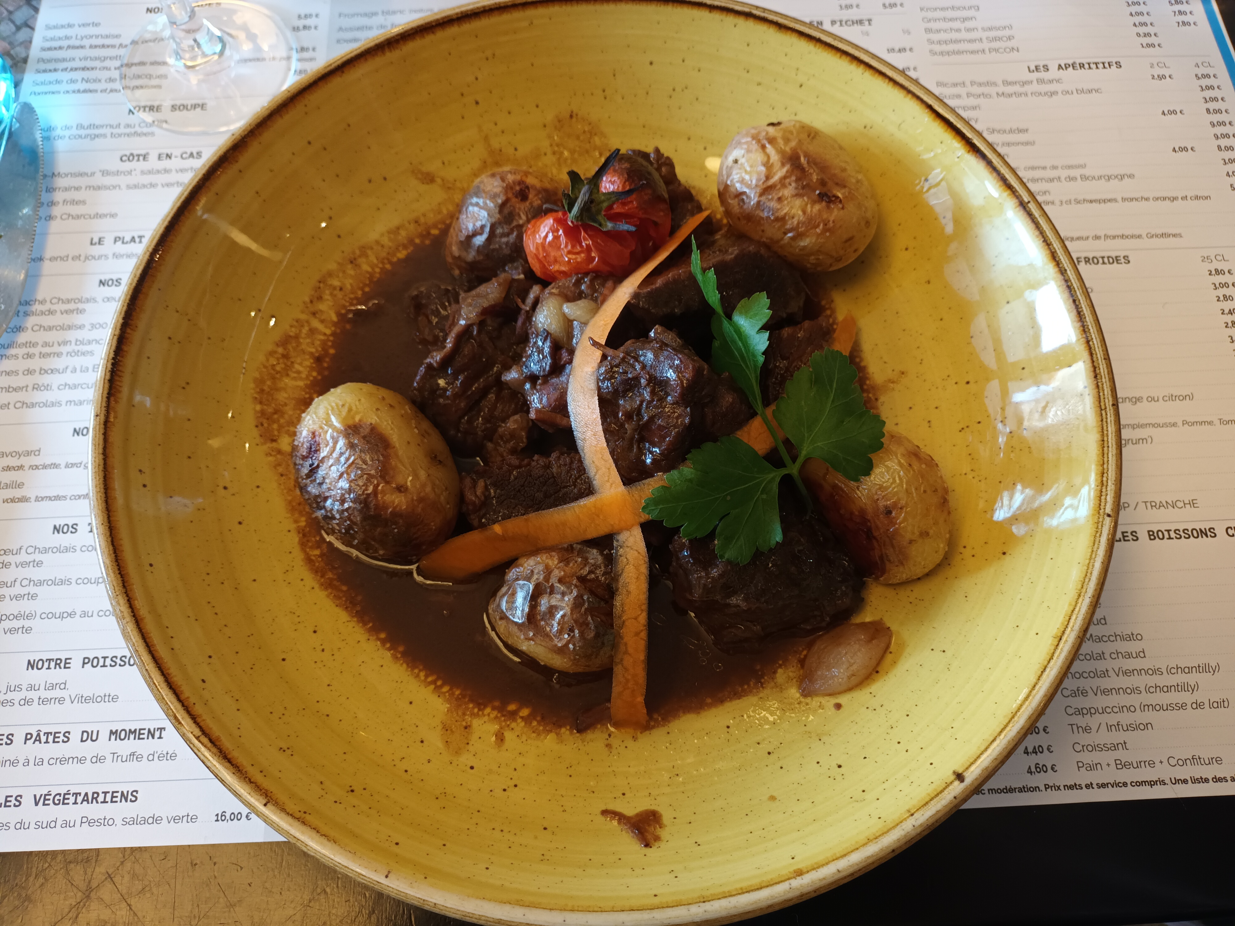 Prix corrects, bonne qualité des plats : foie gras, araignée de boeuf, escargots, très bon boeuf bourgignon, pichet, desserts. Diner fin juin 2021, donc pas bondé, pas de touristes, serveurs et cuisiniers pas débordés.