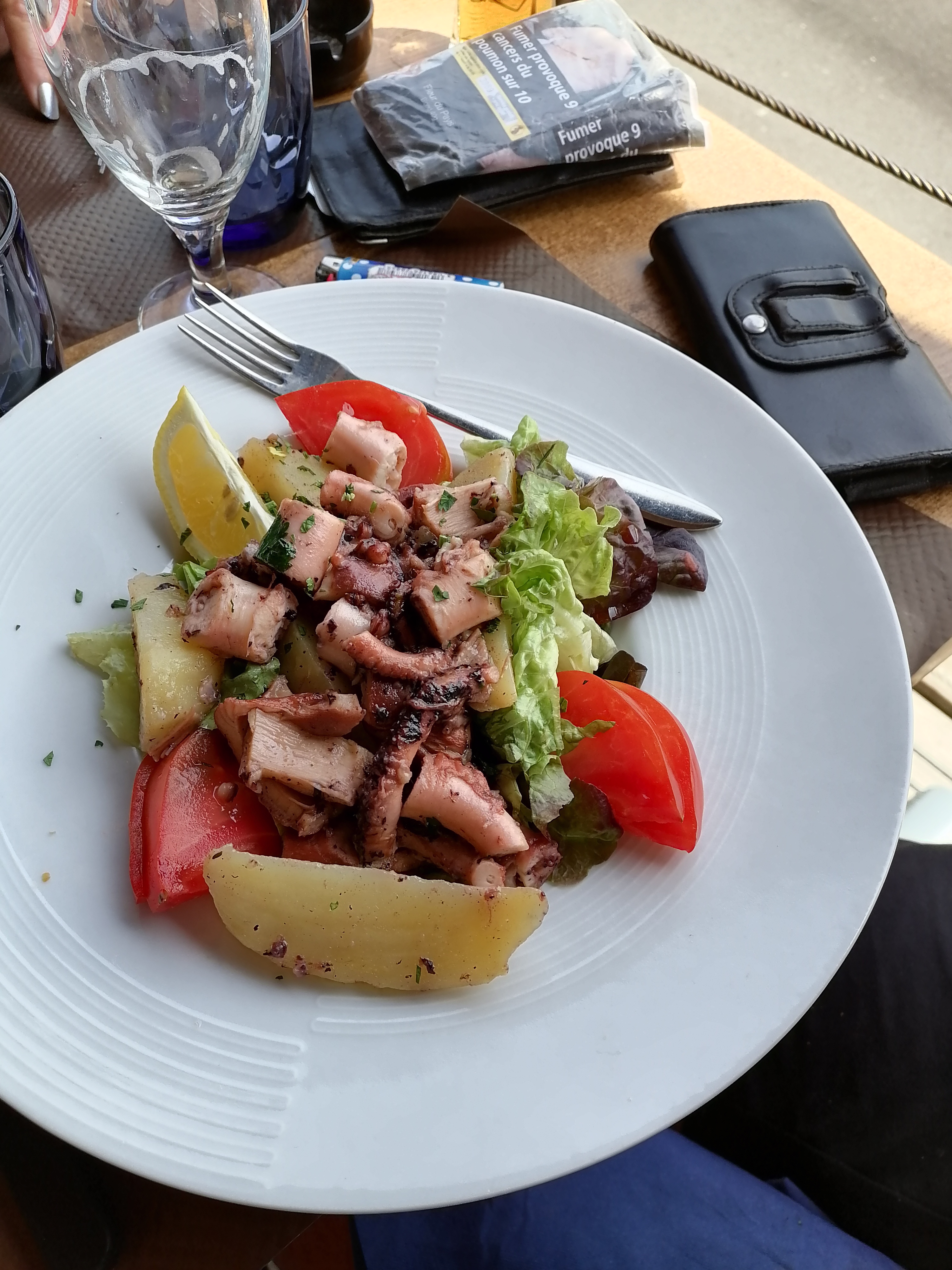 On a prit 2 salades : salade du port et salade césar : infectes !! rien à manger à part de la salade !! tomates orange et oeufs durs sans goût !! on a attendu très longtemps pour avoir une carte, puis pour que le serveur revienne pour la commande de nos boissons, puis pour qu'il nous prenne la commande des plats !!! l'attente pour payer a été longue au comptoir et en plus il est parti sans nous rendre la monnaie, on a du lui rappeler qu'on lui avait donné 40€ pour une addition de 33€ !!! je ne recommande pas du tout, le resto un peu plus loin (à droite) à l'air franchement mieux et celui un peu plus loin encore mieux (sur la gauche en repartant sur le centre ) je suis obligée de mettre une étoile sinon ça ne peut être publié