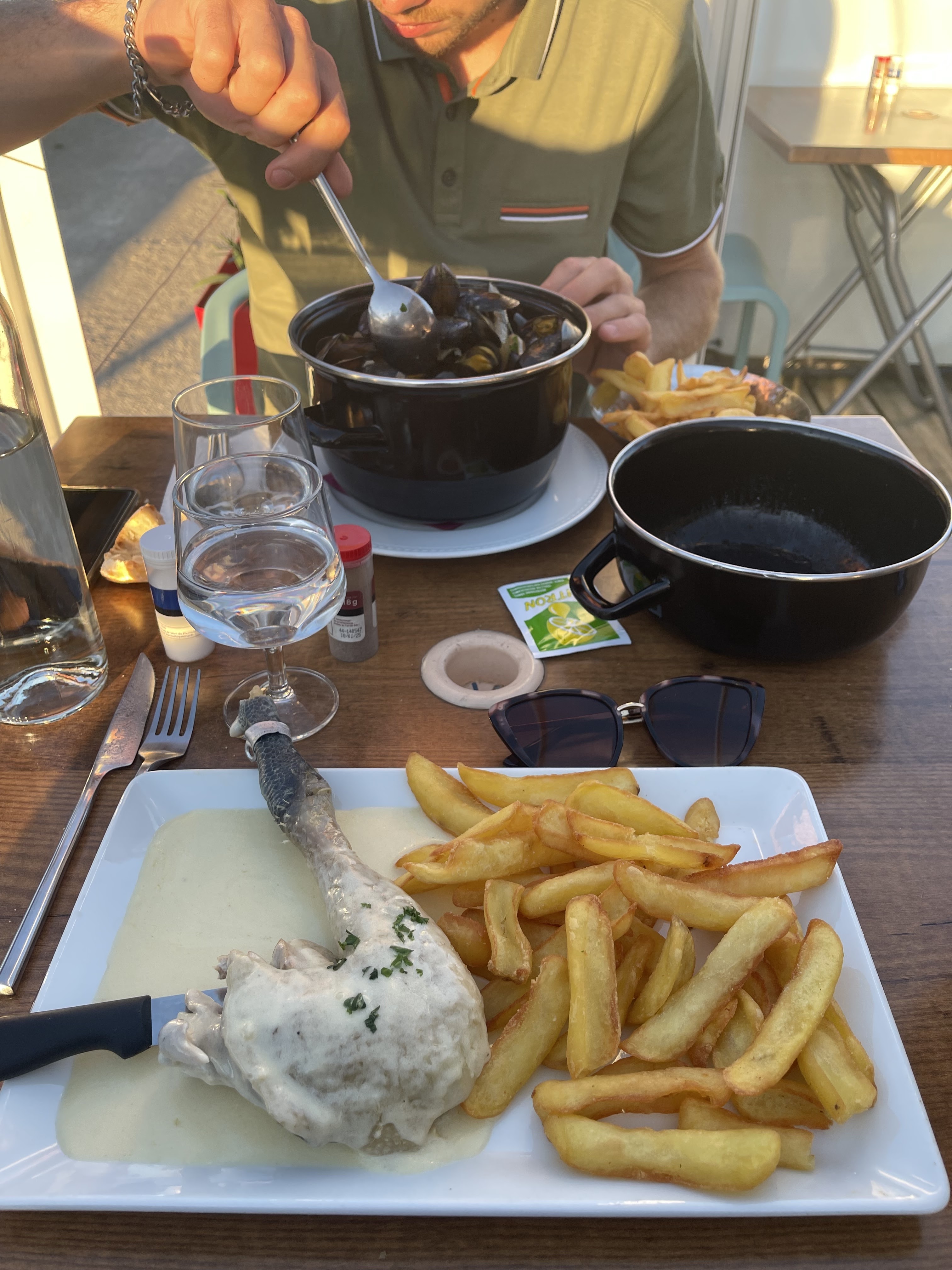 Soirée très sympa sur terrasse bien aménagée au bord de l'eau (mais sans moustiques ce soir!!) Joli coucher de soleil Service sympa Cuisine simple et bonne, bons produits