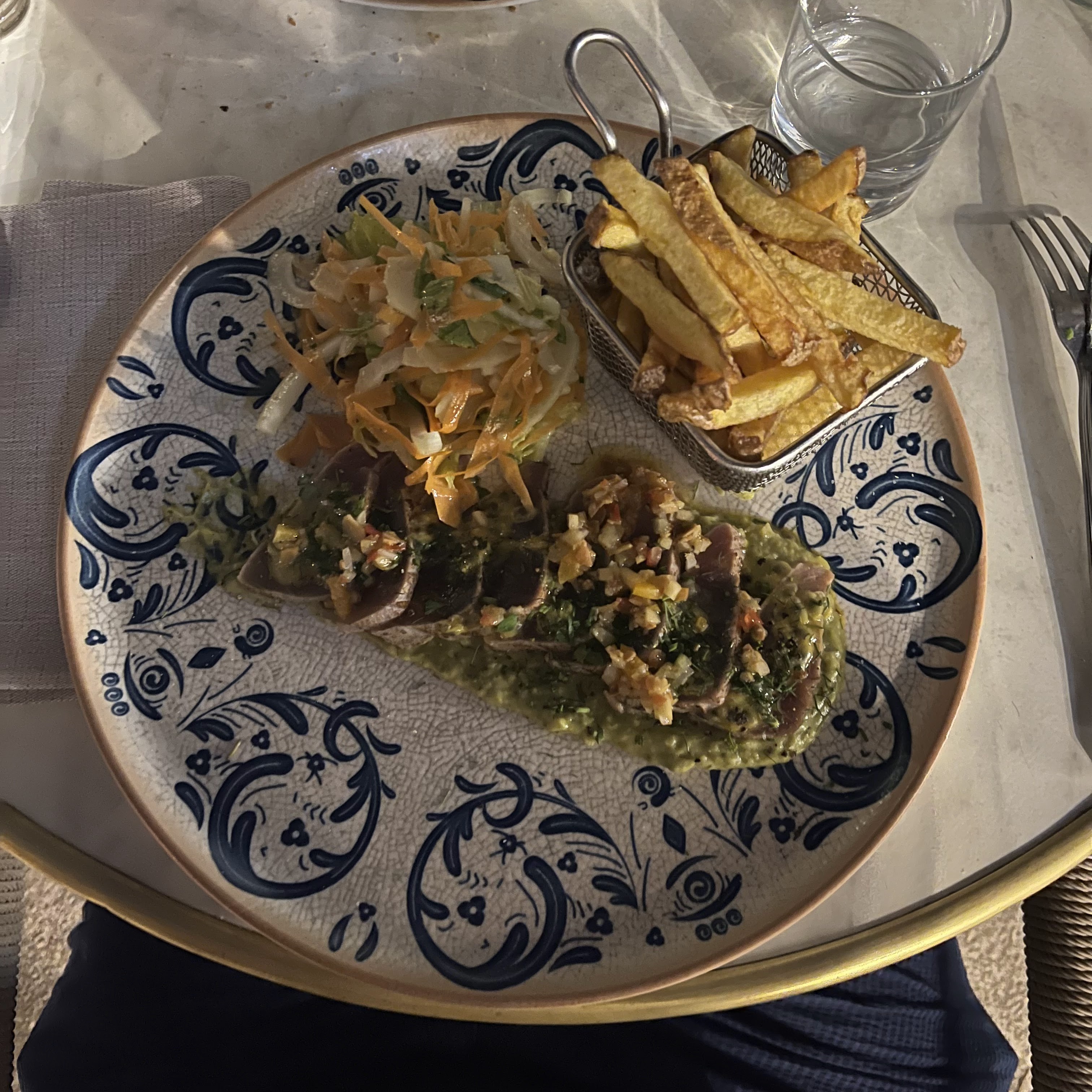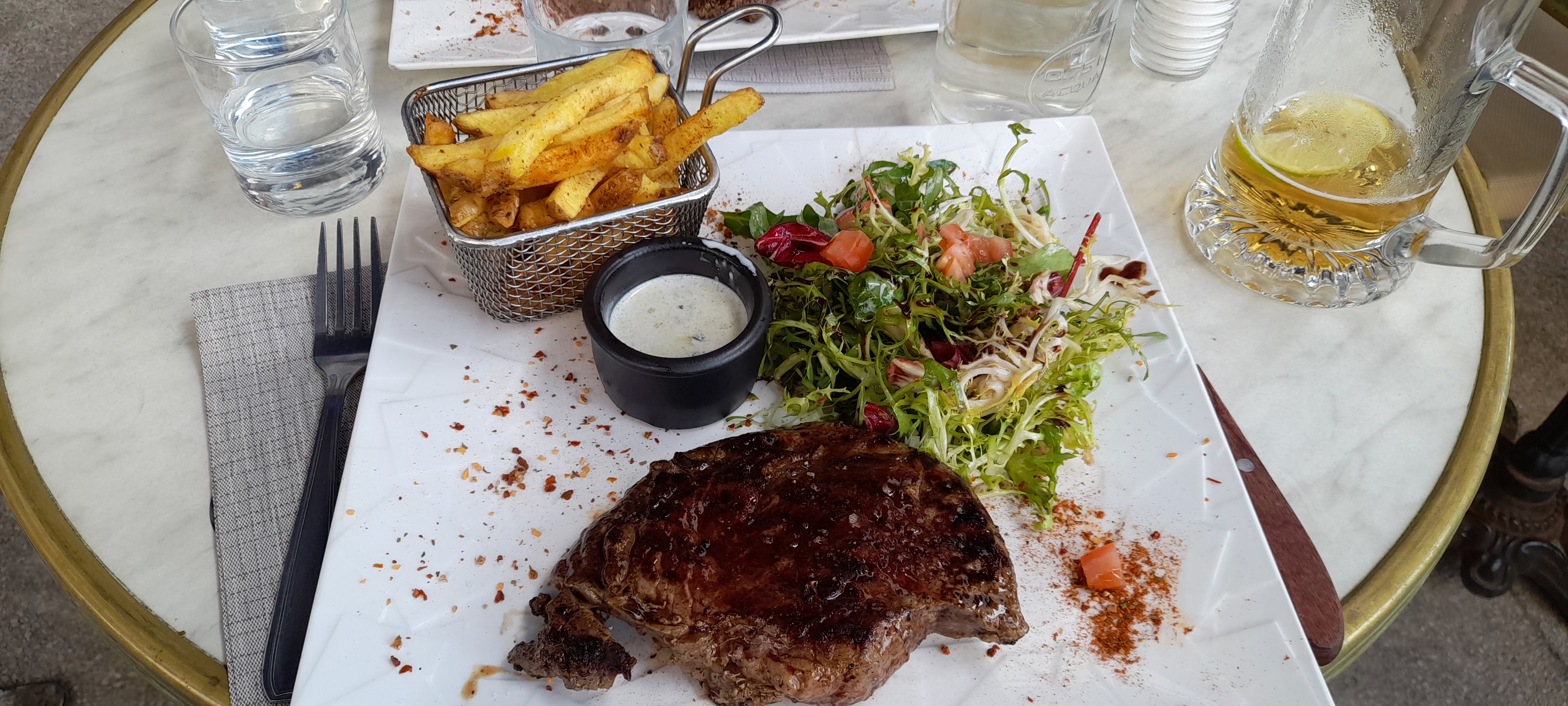 La nourriture est très bonne, les frites, la salade et la viande sont délicieuses. Très bonne prestation Il y a des tables basses sur la terrasse