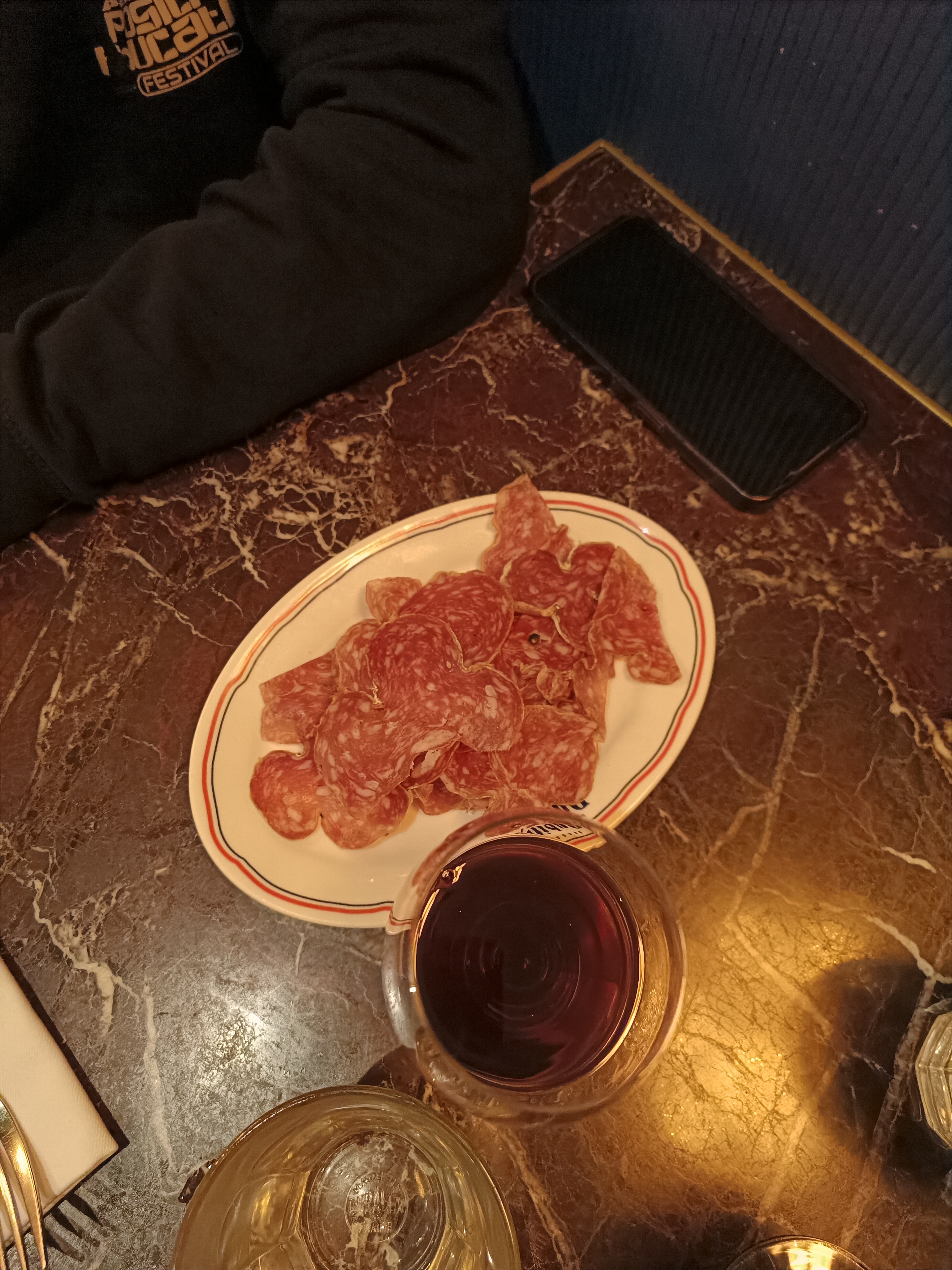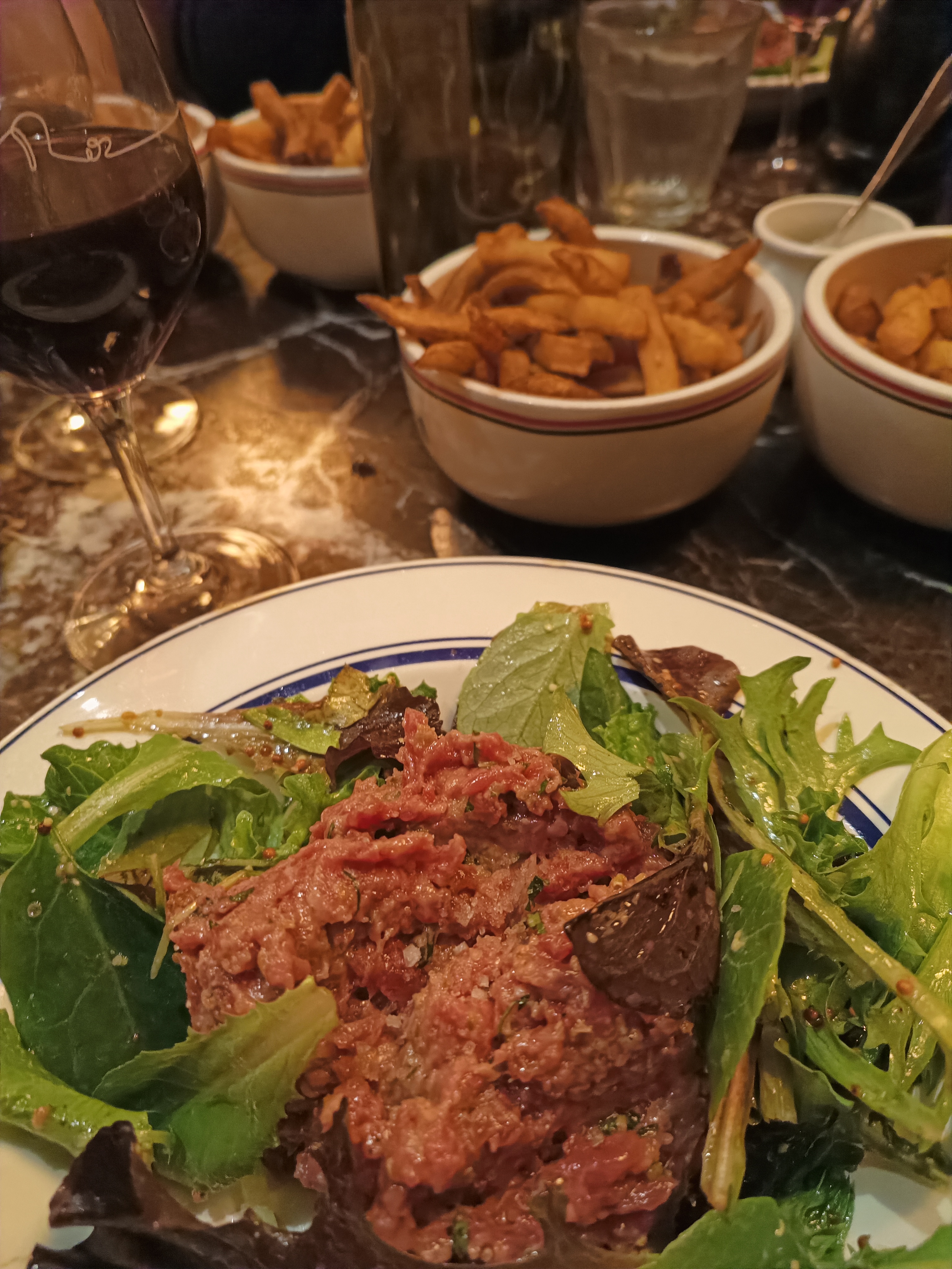 Carte du soir un peu trop serrée à mon goût, sans grande surprise Pêche du jour qui était le lieu noir, bof, pas de chance Niveau entrée, ça manque de quantité (surtout vis-à-vis du prix) malgré de bons produits comme le saucisson ou les fingers têtes de veau. Terrine de campagne un peu grasse néanmoins Plats plus copieux, steak tartare bien servi avec de bonnes frites (qui manquaient un peu de croustillant par contre) Carte des vins étoffée