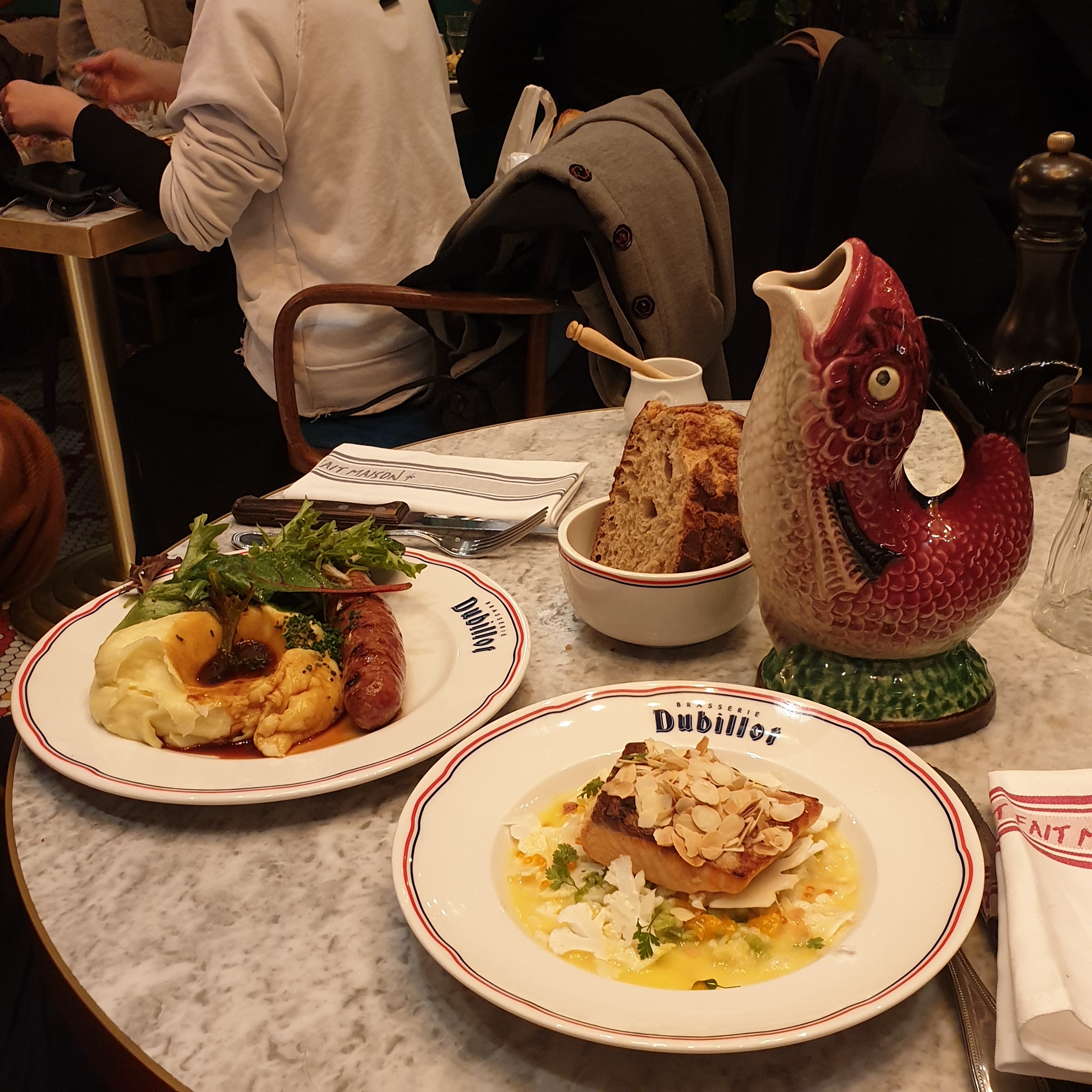 Énorme coup de cœur pour ce bistrot ♡ De bon classique de la cuisine française twisté et modernisé par le restaurant. Tout était EXCELLENT. Le saucisson en brioche, la purée saucisse et le Paris Brest sont d’énormes coup de cœur. Pas grande amatrice de viande crue, j’ai pourtant été séduite par le tartare qu’à pris mon amie, une vrai bonne surprise ! Les desserts ne nous ont pas laissé en reste, le restaurant à sa propre pâtisserie et ils étaient tous divin. La décoration et la vaisselle (les carafes citron et orange !!!!) ajoute une touche un peu rétro-kitsch que nous avons adoré ! Allez-y vite !