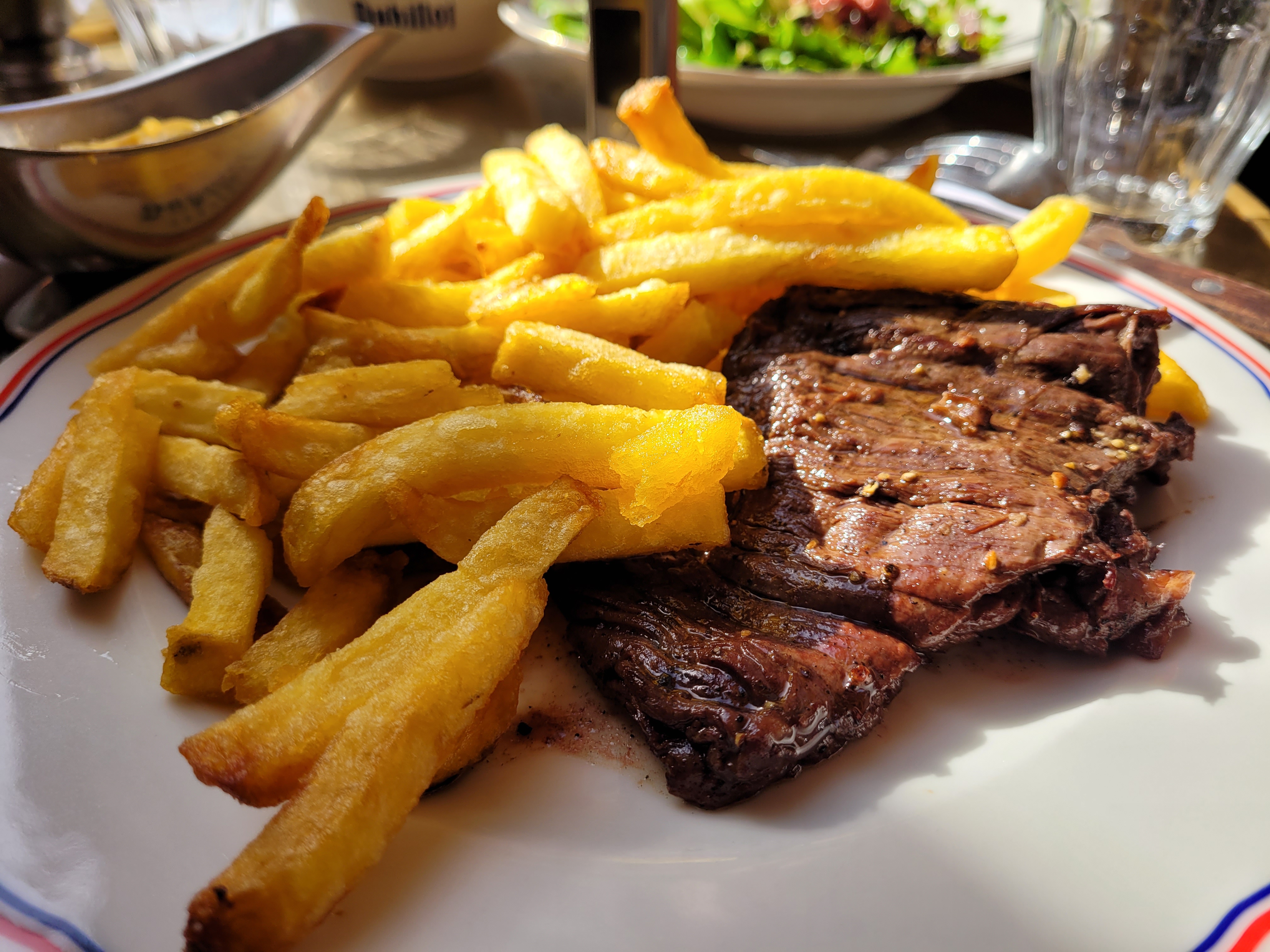 Excellent. - La terrine était bien épaisse, parfumée et savoureuse, meilleure terrine que j'ai pu goûter. - La saucisse était très bonne, la peau est légèrement grillée et la purée est bien montée au beurre, le plat est bien réalisé. - La cuisson du bœuf est repectée, la viande à un bon goût fumé. Les frites sont croustillantes à l'extérieure et fondantes à l'intérieur. - Le pain est goutu, les bords sont croustillants et la mie est moelleuse. La quantité de salade aurait pu être plus fournie. On sent que le tout est fait maison. Bon service également.